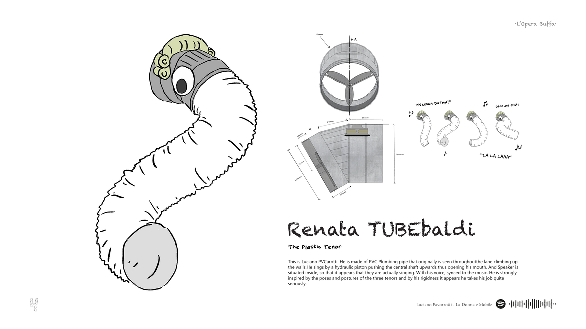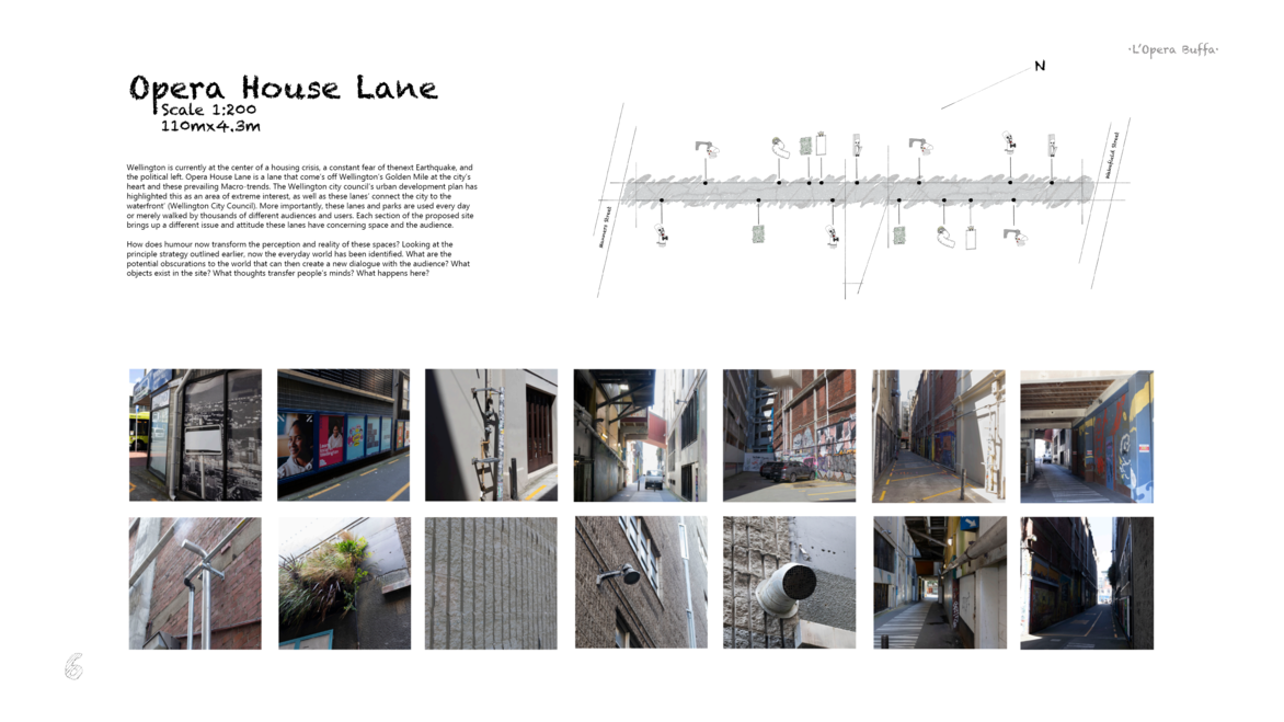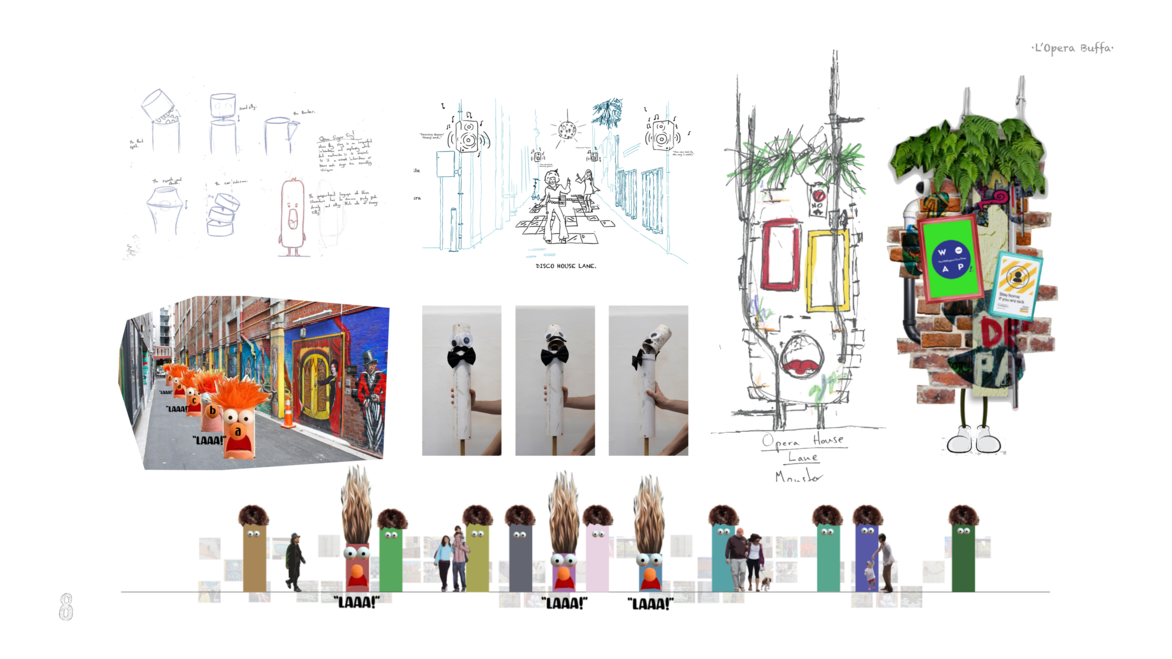 Opera House lane is an underutilised site overshadowed and by the Opera House provides back door access and then serves as a simple shortcut for those who notice it. What if we used comedic design strategies here to enhance the users’ relationships to the site? Perhaps if we take the premise of ordinary objects that already exist within sight, like lights? Posters? Plumping? And turn these into Opera Singers. An Opera just for Opera House Lane and all of the people of Wellington CBD. I have designed six different characters that each occupy the space to engage with an audience and make them laugh.