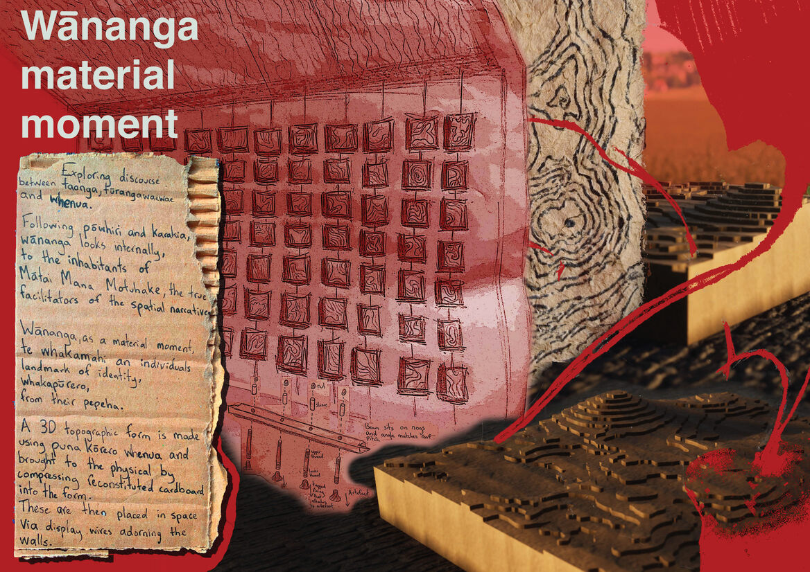 This project responds to a pānui (call) to design a whare waiata – a house for the learning of song. In particular, it invites an in-depth consideration of the relationships between materials, narrative, people and place. The design response is inspired by the pātere gifted for this place, through which we journey through the significant sites of the local landscape, invoking each by name. Fundamental to the project is the understanding that in order to truly connect to these sites, we must understand our own place and connection.