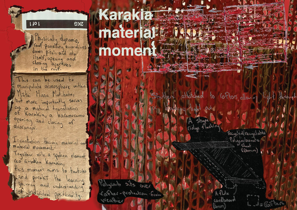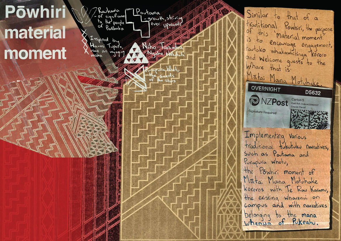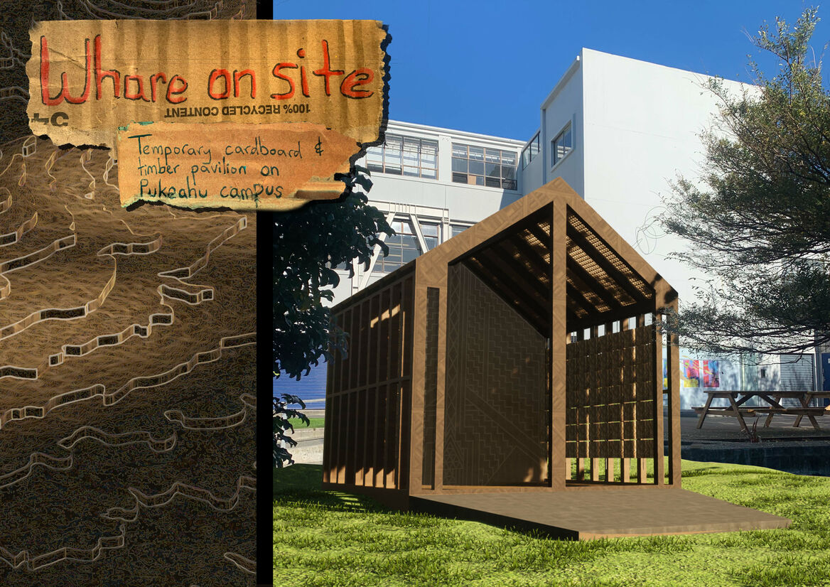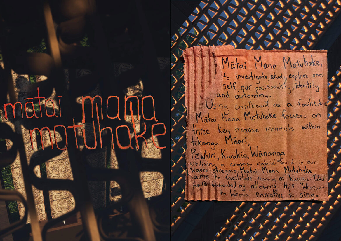 A temporary pavilion constructed of reclaimed timbers and cardboard sourced from local waste streams, Mātai Mana Motuhake invites learners of the pātere to investigate, study, and explore one’s own positionality, identity and autonomy. It offers a grounding-place in which to spend time reflecting on ideas of tūrangawaewae and mana motuhake, and to understand ones’ own place.