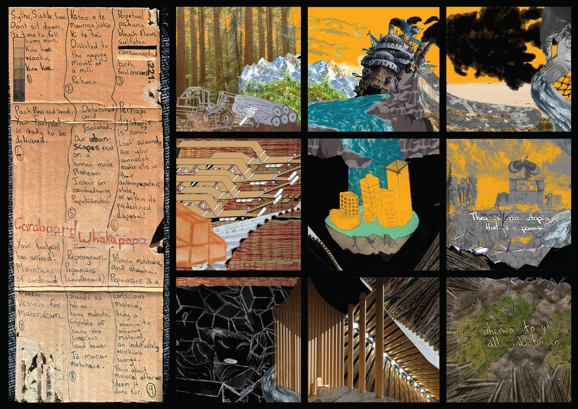 With care for Papatūānuku comes the realisation that all material cycles are implicated in the health of the land and its people. The pavilion is therefore designed for disassembly, with materials re-used or returned to the earth. Cardboard is explored as the main mediator of the experience, manipulated to elicit different material qualities and facilitate various activities. Comprised of reconstituted wood fibres, cardboard speaks of utility and recyclability. Its unassuming aura of informality readily engages people in processes of making.