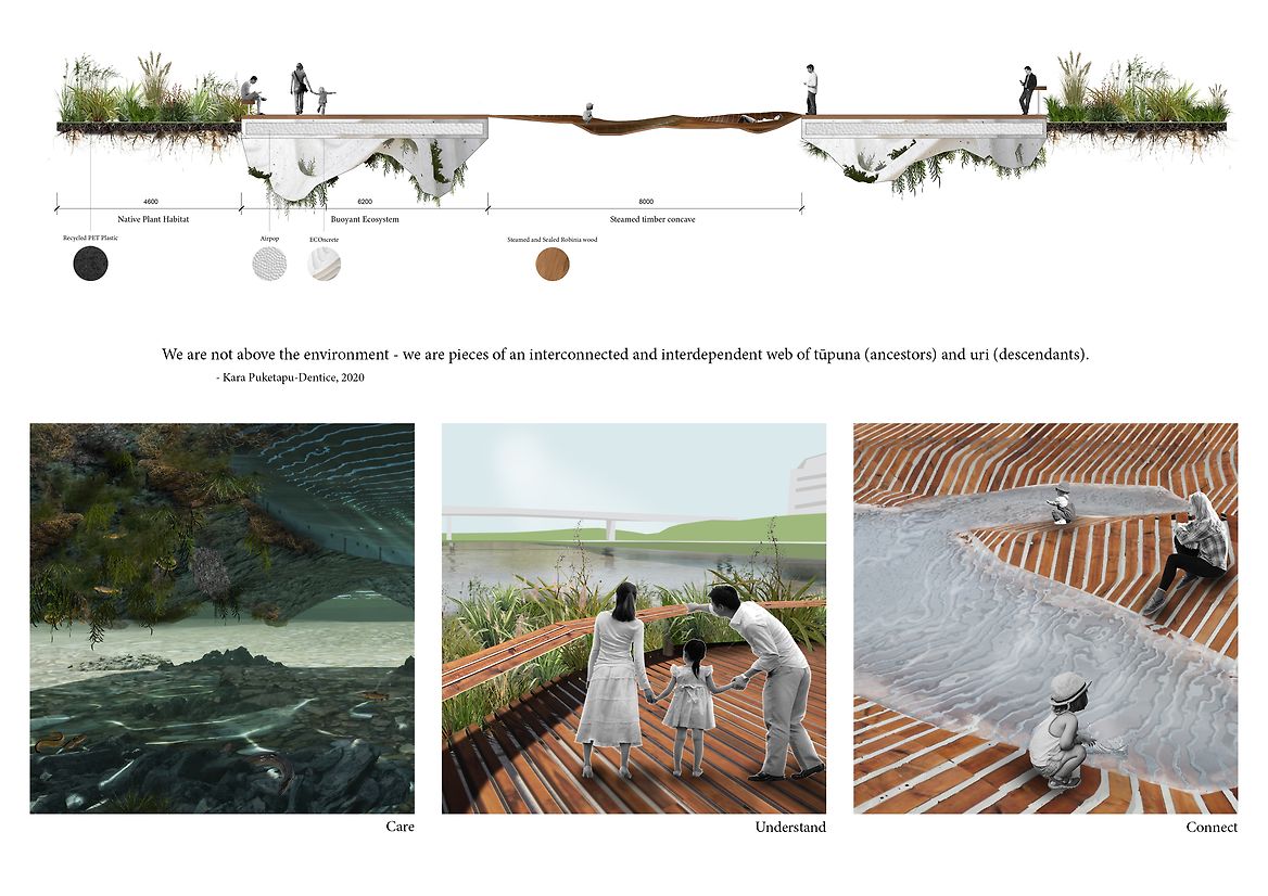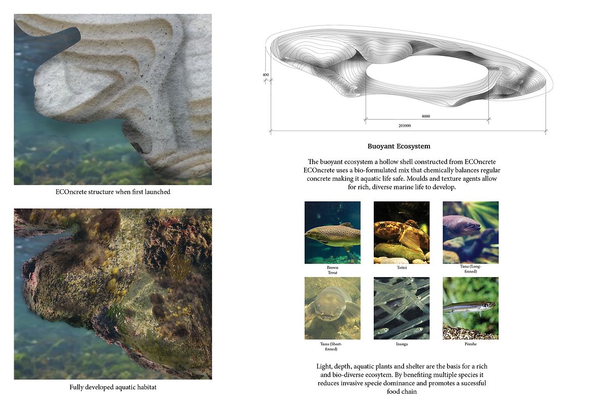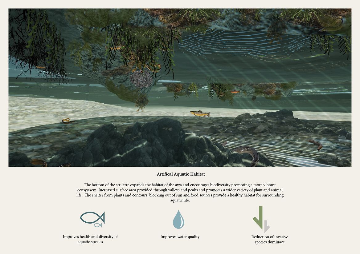 Due to climate change Te Awa Kairangi is facing more frequent and severe flooding. Mutuality is designed to be reactive at normal and flooded levels of the river, continuing to regenerate an ecosystem lost over time. It is designed to care for the awa (river), by not introduce anything unwanted, through carefully considered material, shape and form choices to develop the ecospot structure.