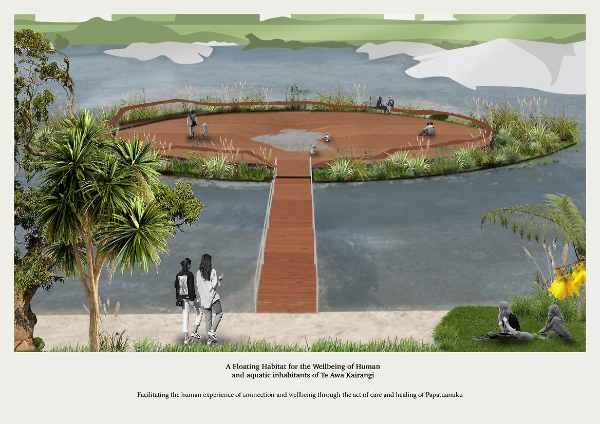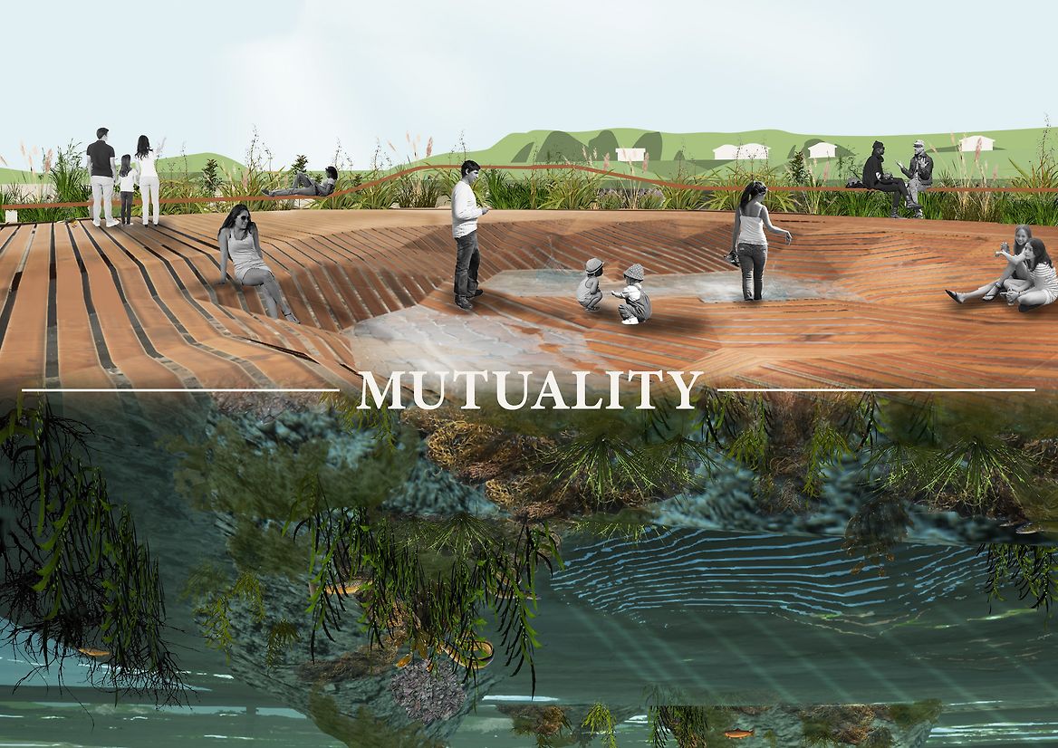 Mutuality provides humans with a recreational space but also invites thought and awareness as to how we can better the environment we are surrounded by, resulting in personal and communal well being. Rooted in indigenous Māori knowledge, learning from the narratives and values of Papatūānuku, Mutuality acknowledges the responsibilities we have to protect, reverse damage and reconnect all intertwined relations by introducing stories to those unaware of them, and creating a physical space to reflect. I would like to acknowledge that I am not mana whenua and should this project ever be realized it would be reviewed and developed alongside mana whenua to ensure mātauranga Māori (Māori knowledge), Te Ao Māori (Māori worlds view) and tino rangatiratanga (self-determination) is upheld through the design process .