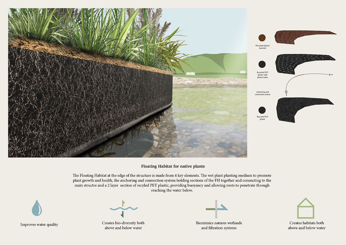 The design is built from a nature-based approach, considering the potential benefits to the environment by which the ecospot is surrounded. A key focus is regenerating the river ecosystem by creating food, shelter and living opportunities for wildlife, particularly aquatic, that has been washed out by human impact; forced straightening of river banks and pollution.