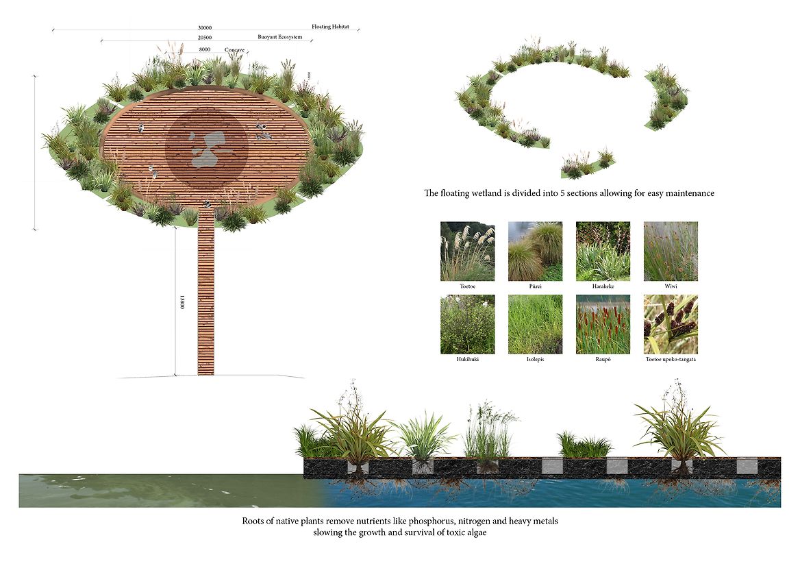 Mutuality is a floating ecospot on Te Awa Kairangi (Hutt River) designed to transform a section of the river into an improved habitat for wildlife whilst providing people with educational and recreational space in the heart of the urban centre of Te Awa Kairangi ki Tai (Lower Hutt).