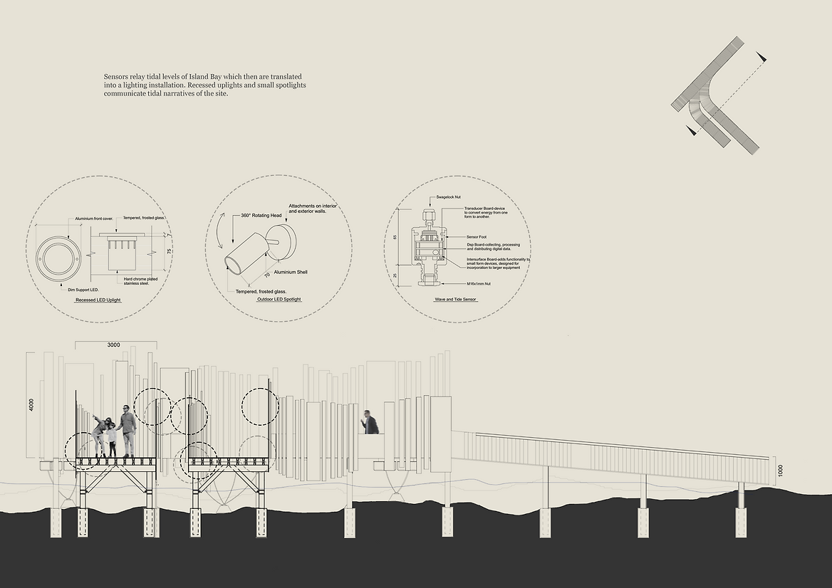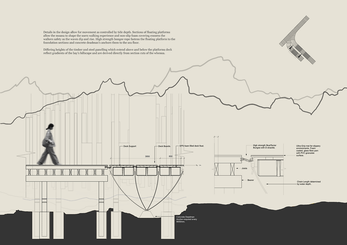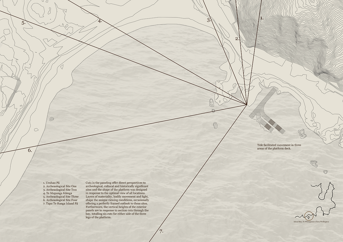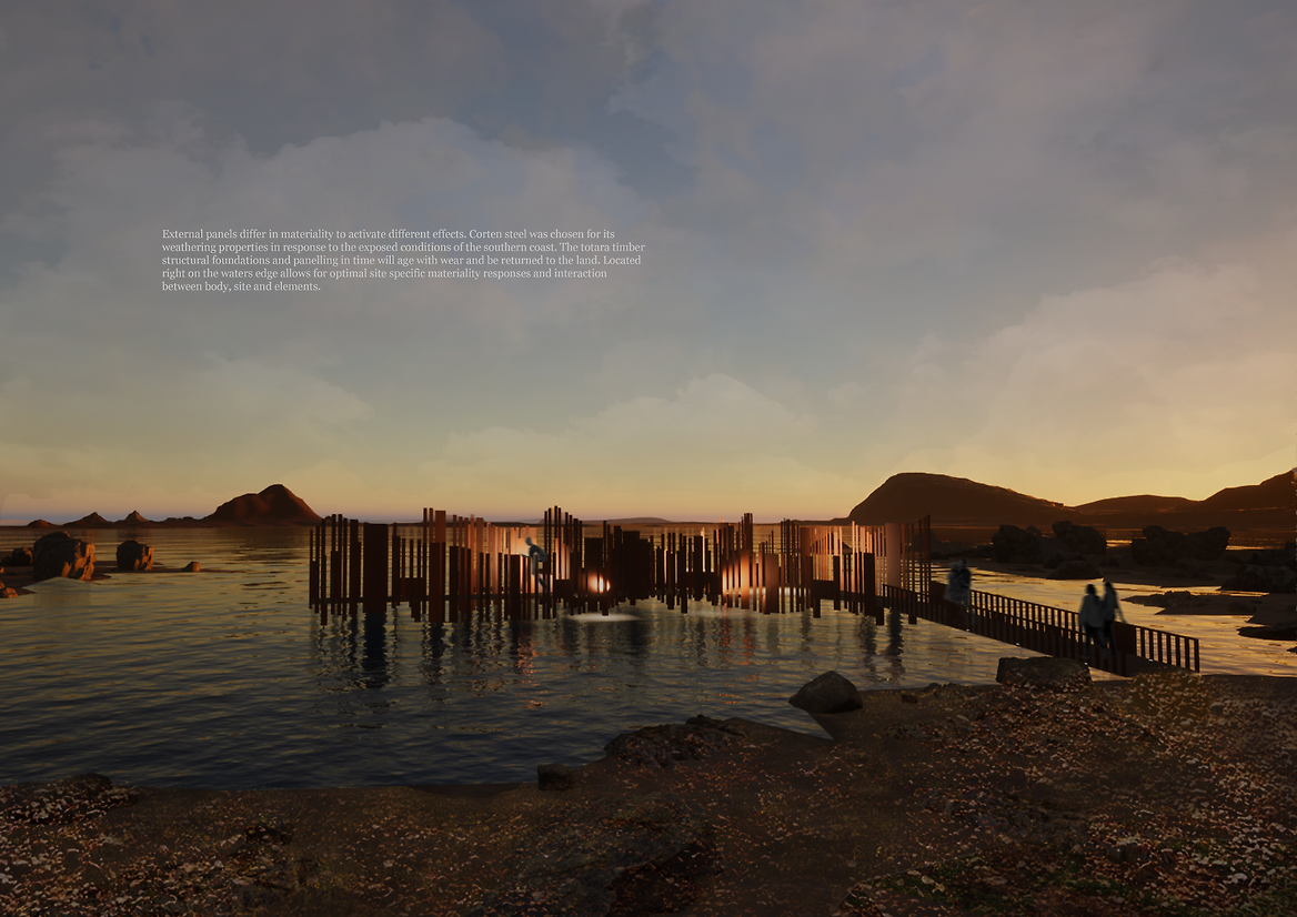 ‘Rhythm of Place’ consists of a floating platform positioned in the bay, made from a corten steel and totara wood framing. External panels line the sides of the platform and extend above and below the horizontal path. A long ramp connects the platform to land and attached to the linear portion of the platform are two legs that veer off to the left. Cuts in the platforms paneling provide direct viewports to sites of tangata whenua and precolonial inhabitation and offer windows to past landscapes, each view enhanced relationships between the body, materials and light. The shape of the platform was designed to offer an optimal view of all locations. The vertical heights of the exterior panels reflect section cuts through the bay, a total of six cuts for each side of the three legs of the platform. These panels differ in materiality to activate different visual effects which in turn impact how the design is experienced. Corten steel was chosen for its weathering properties, responding to the exposed conditions of the southern coast. The native, totara timber structure and panels will age, wear and breakdown over time and will eventually be returned to the land. ‘Rhythm of Place’ is located right on the water’s edge to allow for interaction between body, water and site. Tidal data is translated into a tangible display of light and story. Fluctuations of the current play out across the structure activated by tidal sensors located around the bay, to create differing intensities of light and shadow. As the tide recedes the shadows soften, as the tide rises the shadows become darker and more defined. Floating sections of the walkway rise and fall with the waves and tide, translating the movement of moana into embodied sensation. High strength bungee rope fastens the floating platform to the foundation structure and concrete deadman’s are used to anchor fluid sections to the sea floor. The installation becomes a body for the whenua and moana to tell their own stories, attuning us to the intangible qualities of the site.