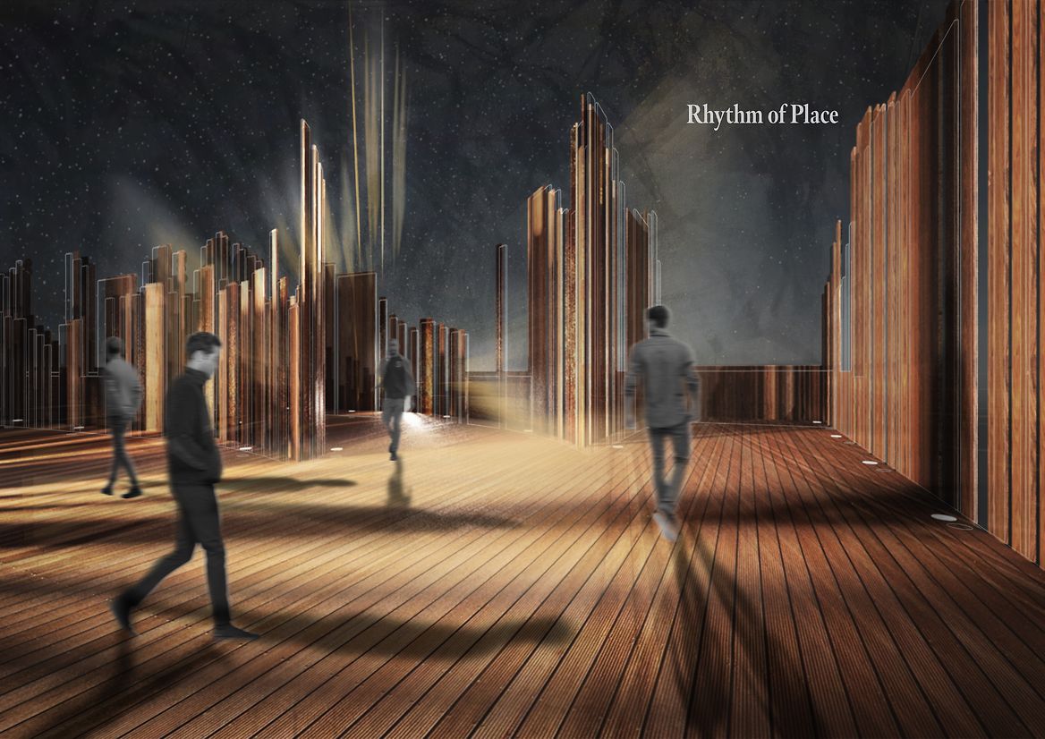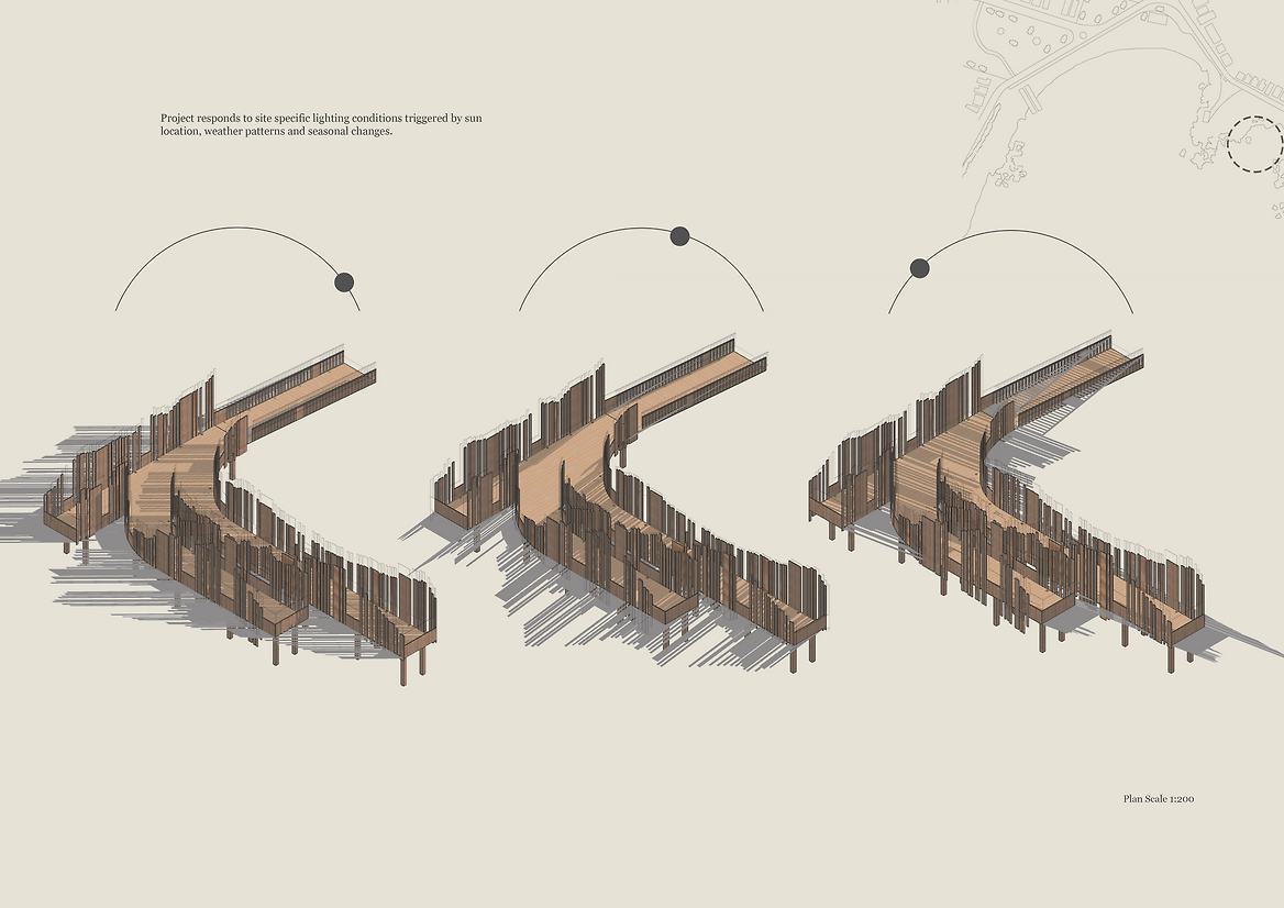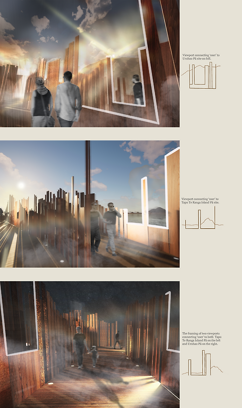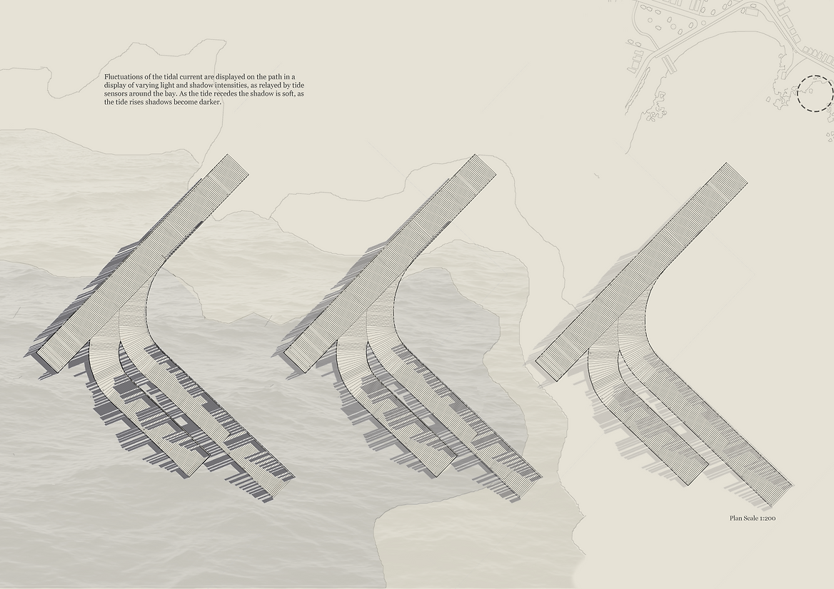 ‘Rhythm of Place’ consists of a floating platform positioned in the bay, made from a corten steel and totara wood framing. External panels line the sides of the platform and extend above and below the horizontal path. A long ramp connects the platform to land and attached to the linear portion of the platform are two legs that veer off to the left. Cuts in the platforms paneling provide direct viewports to sites of tangata whenua and precolonial inhabitation and offer windows to past landscapes, each view enhanced relationships between the body, materials and light. The shape of the platform was designed to offer an optimal view of all locations. The vertical heights of the exterior panels reflect section cuts through the bay, a total of six cuts for each side of the three legs of the platform. These panels differ in materiality to activate different visual effects which in turn impact how the design is experienced. Corten steel was chosen for its weathering properties, responding to the exposed conditions of the southern coast. The native, totara timber structure and panels will age, wear and breakdown over time and will eventually be returned to the land. ‘Rhythm of Place’ is located right on the water’s edge to allow for interaction between body, water and site. Tidal data is translated into a tangible display of light and story. Fluctuations of the current play out across the structure activated by tidal sensors located around the bay, to create differing intensities of light and shadow. As the tide recedes the shadows soften, as the tide rises the shadows become darker and more defined. Floating sections of the walkway rise and fall with the waves and tide, translating the movement of moana into embodied sensation. High strength bungee rope fastens the floating platform to the foundation structure and concrete deadman’s are used to anchor fluid sections to the sea floor. The installation becomes a body for the whenua and moana to tell their own stories, attuning us to the intangible qualities of the site.
