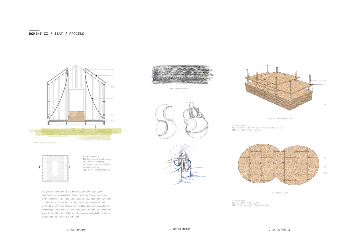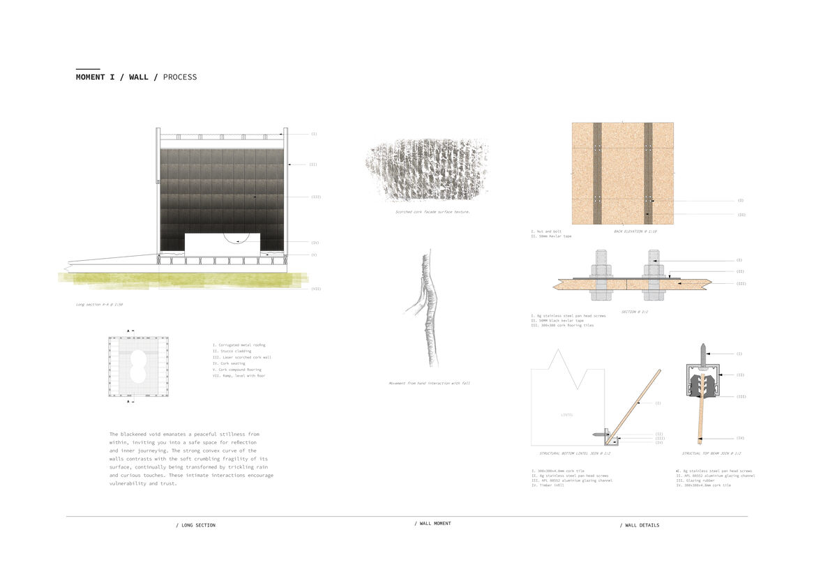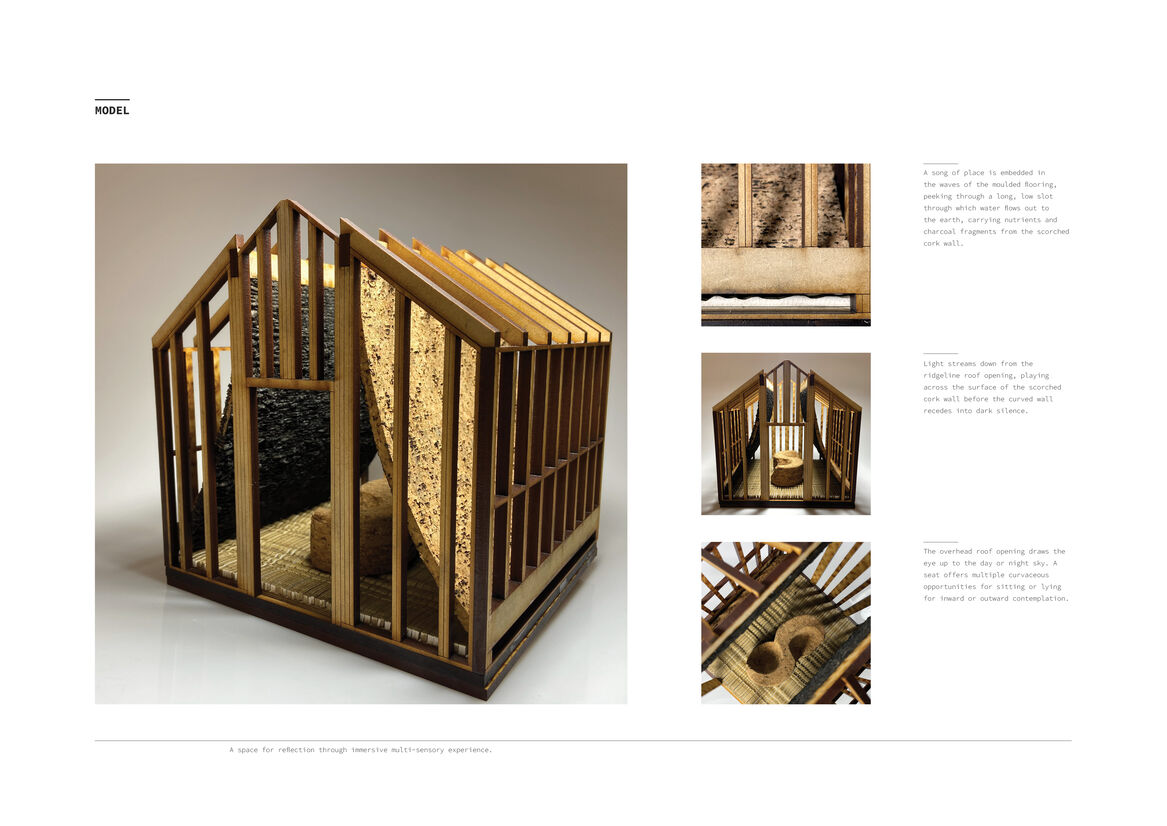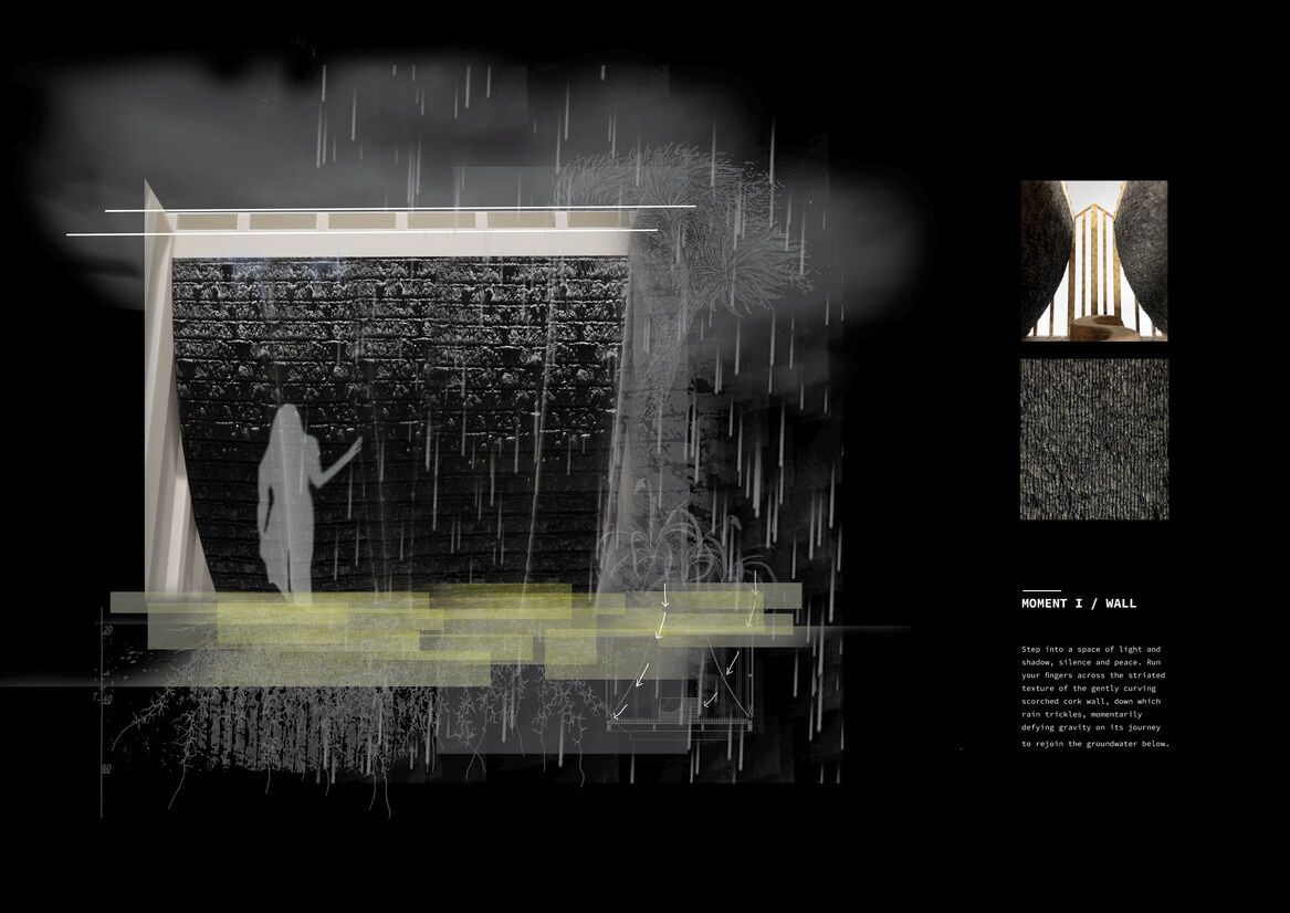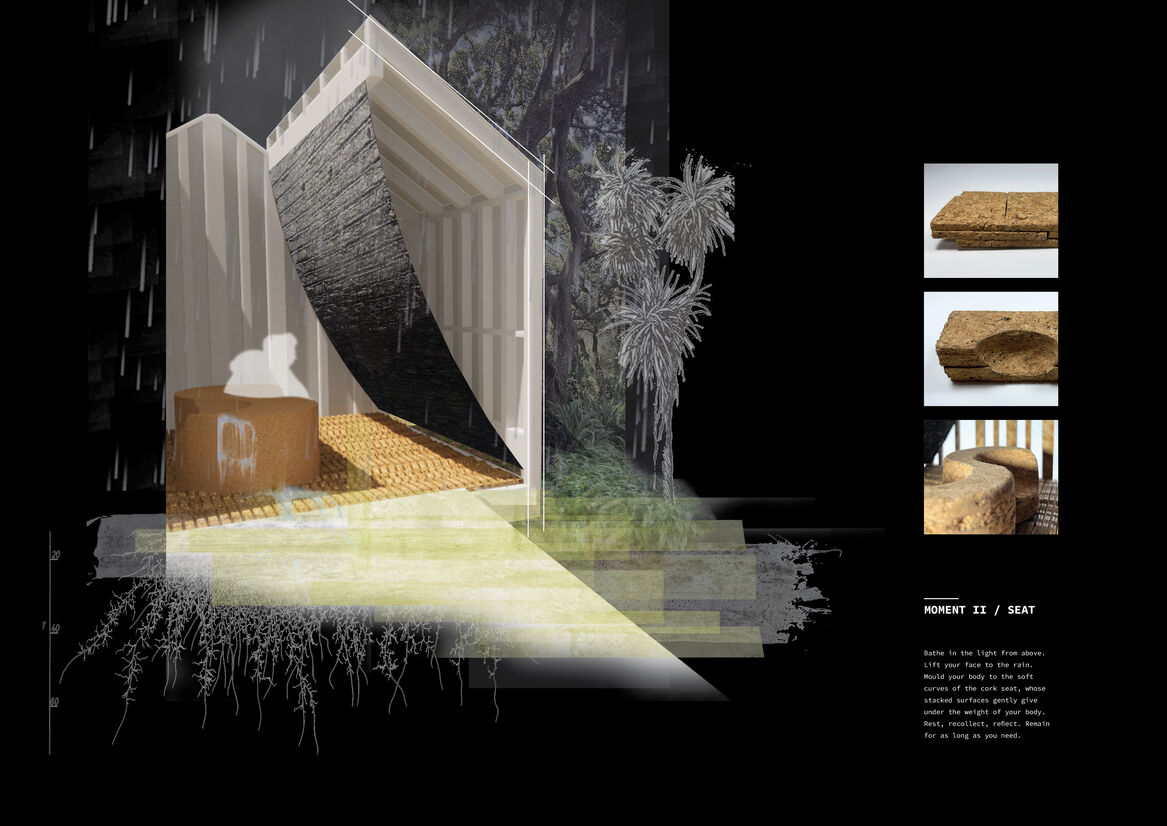 Cork is thus employed in a way that celebrates its regenerative and atmospheric capacities, supporting reconnection to place through contemplative experience. The materiality invites silence and bodily presence in order to both journey inward and connect outward with the elements of material, light, and water. Curved walls of scorched cork drape down from a linear opening at the ridgeline of the structure. Light and rain play down the crumbling black surface, defying gravity to follow the gentle curve as it recedes back toward a second slot in the base of the wall. Water returns to earth, carrying nutrients from the charred surface – echoing the role of the cork oak’s root systems in maintaining ecological equilibrium.