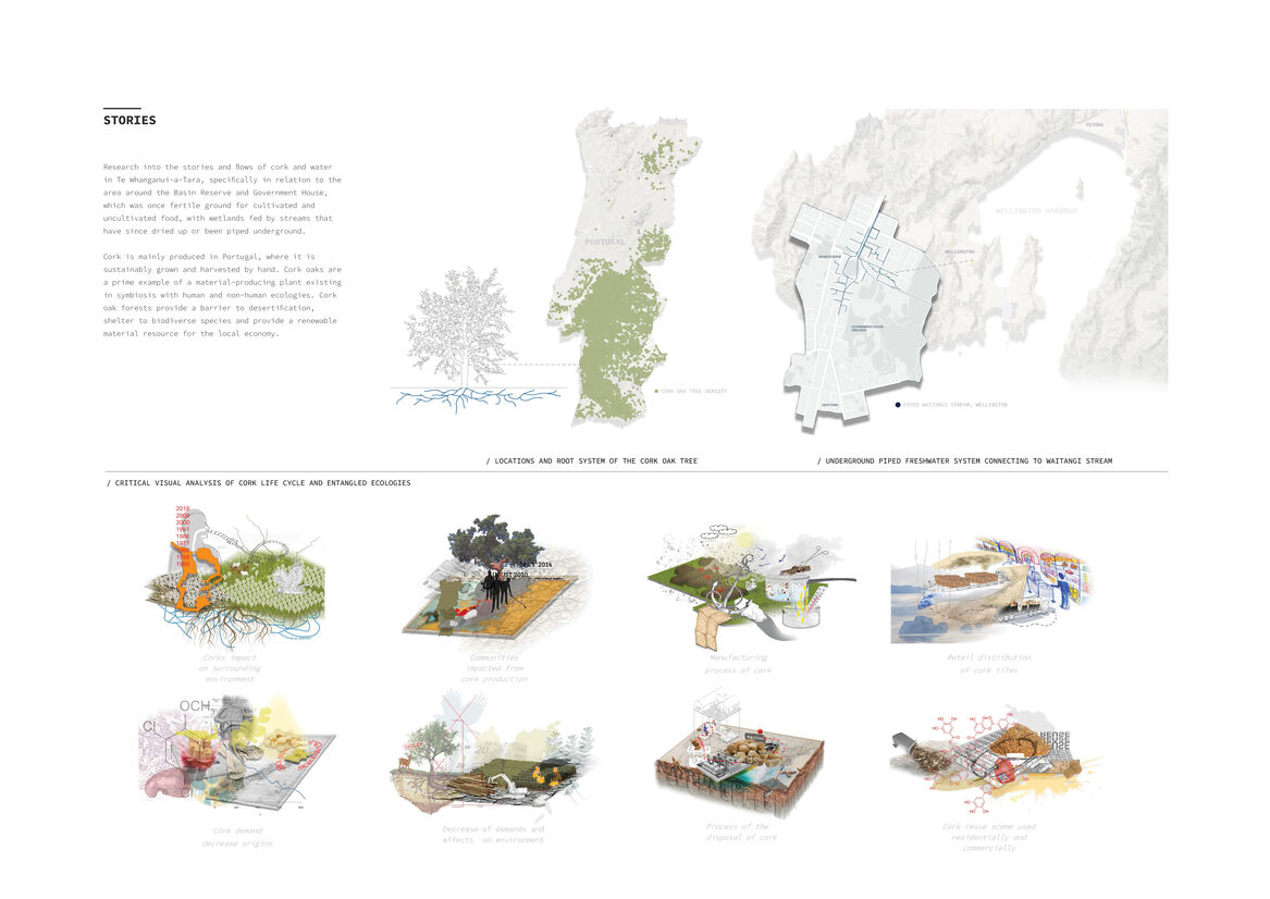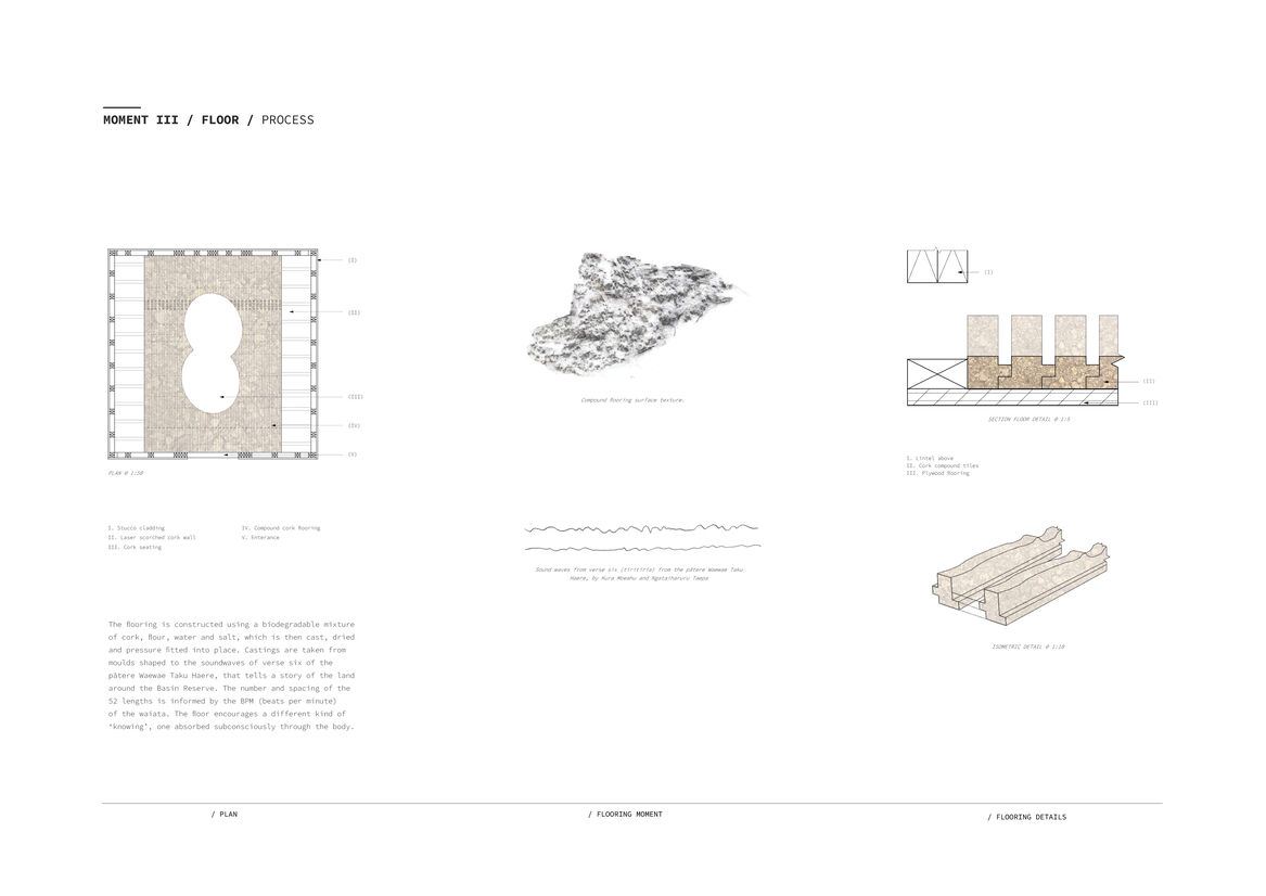 This proposal centres around the pātere Waewae Taku Haere (‘my journeying feet’) by Te Ati Awa kaumatua Kura Moeaha, with the rangi gifted by Ngataiharuru Taepa. The chant takes us on a journey through the land, histories and place names of the landscapes of Te Whanganui-a-Tara, beginning and ending at Pukeahu, where the pavilion will be located. The design responds in particular to the sixth verse, which speaks of the underground waterways in the Basin Reserve area. Connections are made between the unseen subterranean movements of water in this ecology, and that of the chosen material: cork.