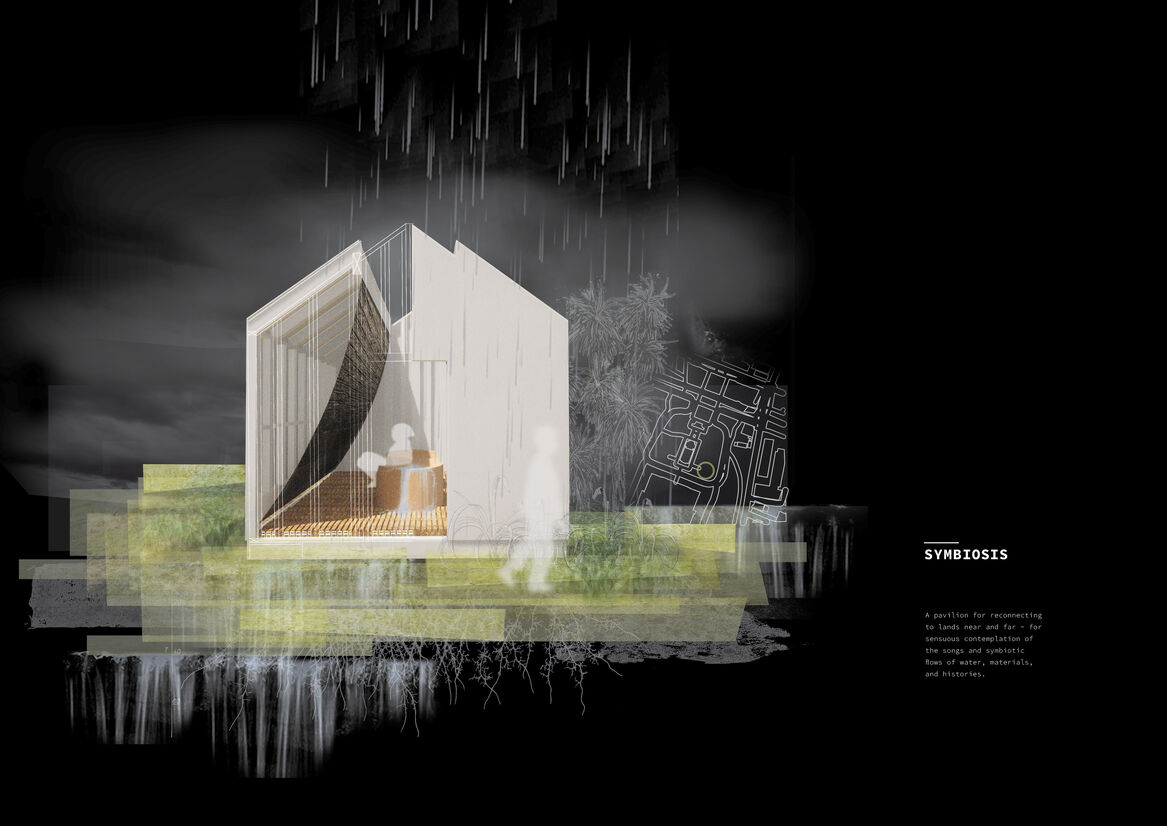Symbiosis responds to a brief to design a small timber-framed pavilion for the learning of waiata, to be fitted out with various iterations of a selected waste material. Being challenged to explore the whakapapa and qualities of a material, the ways in which it might be manipulated, design strategies for disassembly and reuse, and how the voices of the material might sing of the stories of the land.