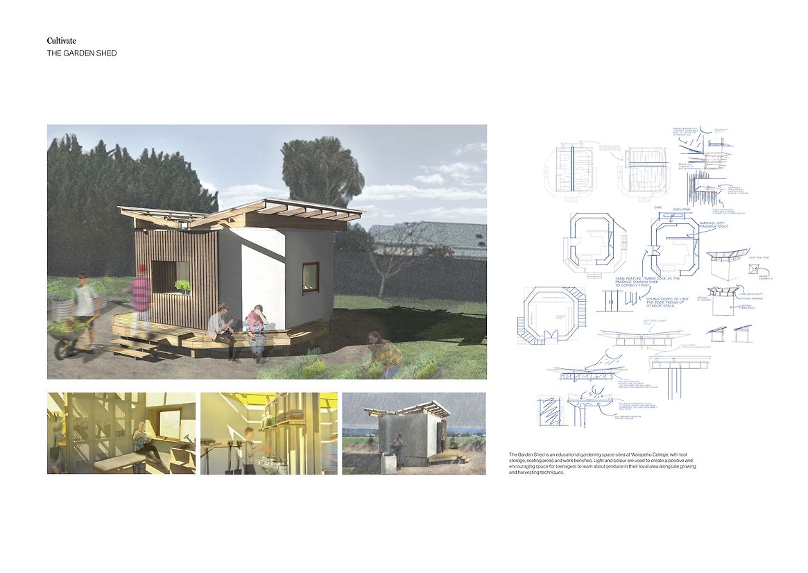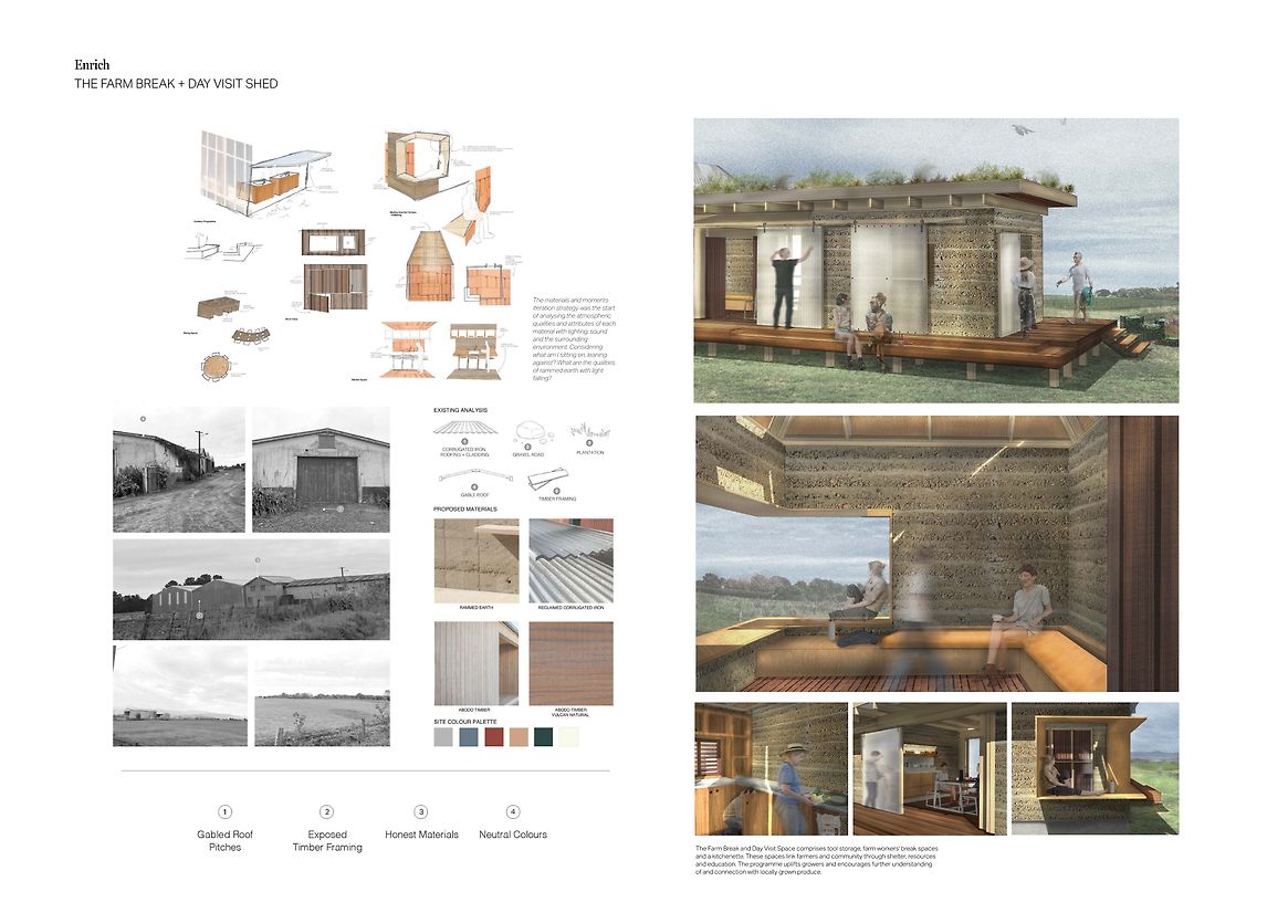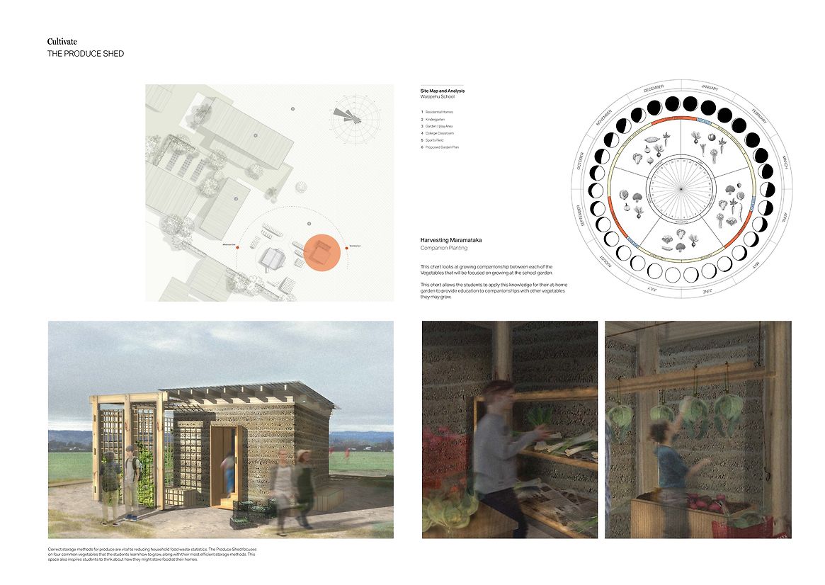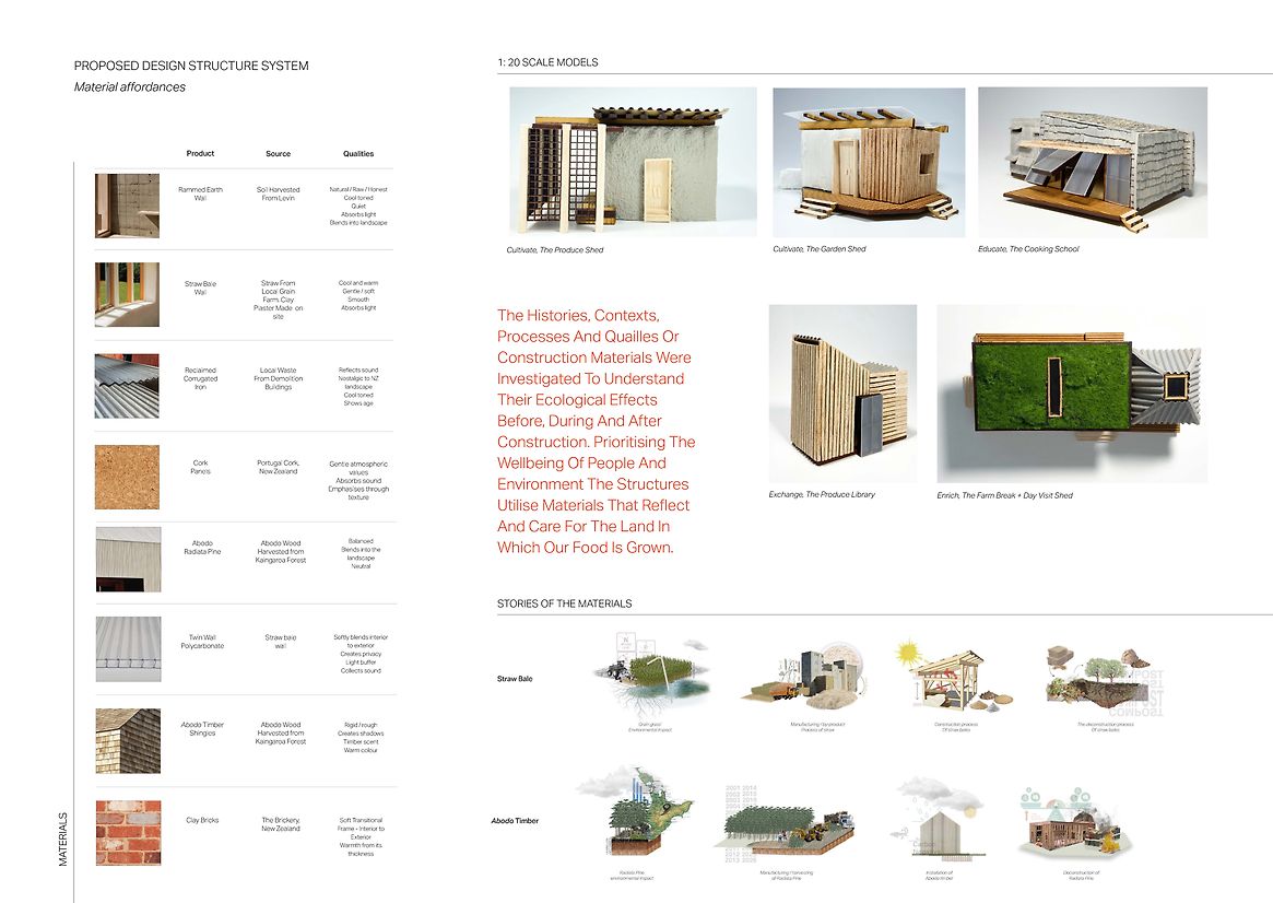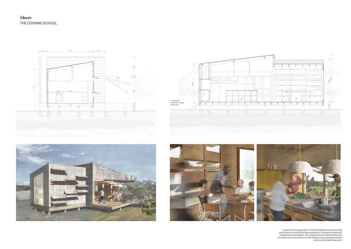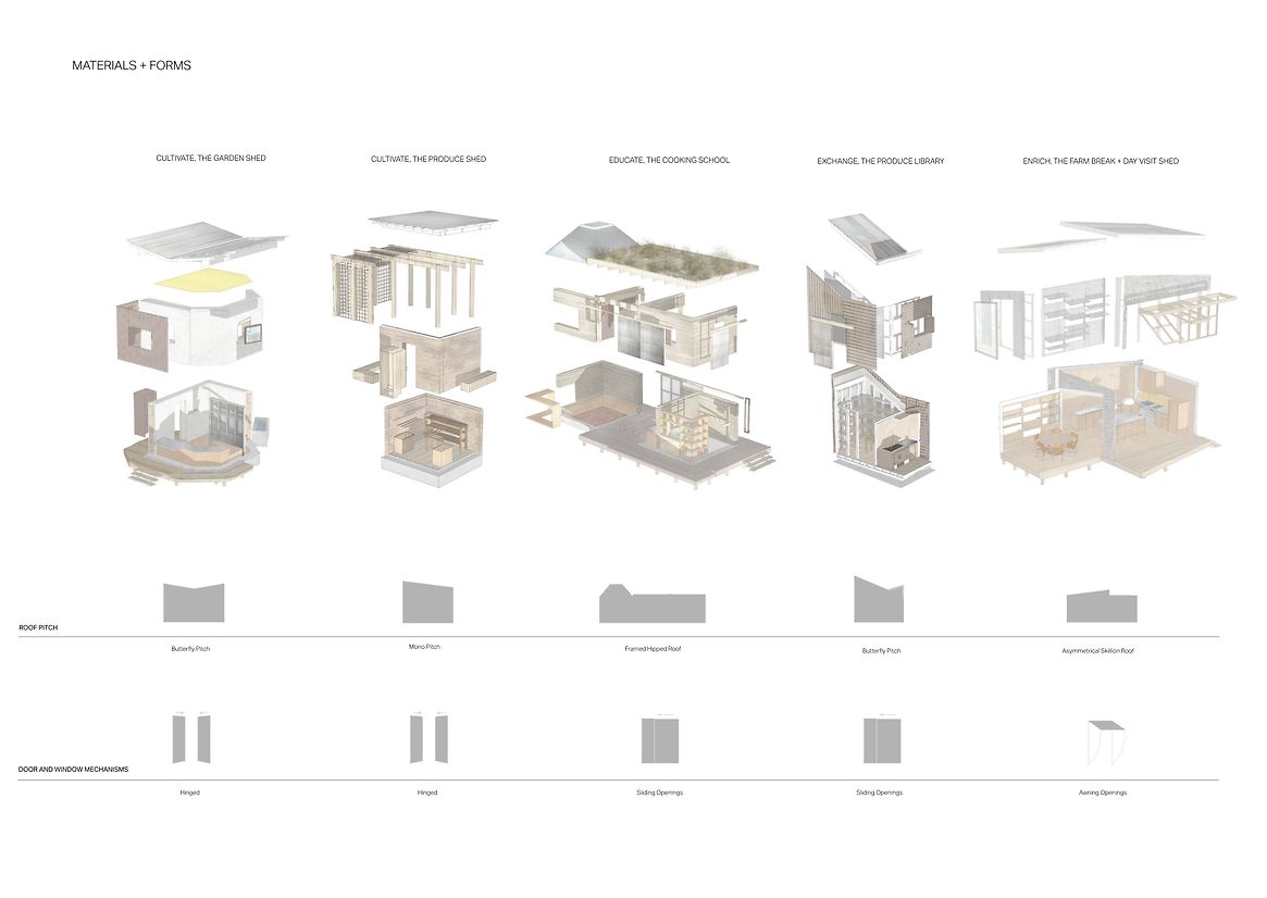 The exploration of the role of materials, senses, lighting, and openings in embodied experiences of space was the catalyst for five educational programmes that target specific communities within our neighbourhoods to connect us with our food. The histories, contexts, processes and qualities of construction materials were investigated to understand their ecological effects before, during and after construction. Prioritising the well-being of people and the environment, the structures utilise materials that reflect and care for the land in which our food is grown. These ecological strategies manifested into a garden shed, produce storage, a cooking program, a produce library and a farm break and visitor area. The repeated practice of cultivation, the sharing of food and culinary knowledge to be performed, learnt and taught within these ritual spaces is an exploration of designing with an embodied approach to foster re-connection with our produce.