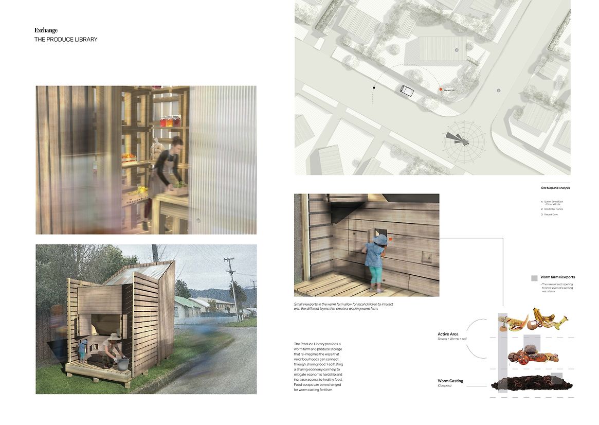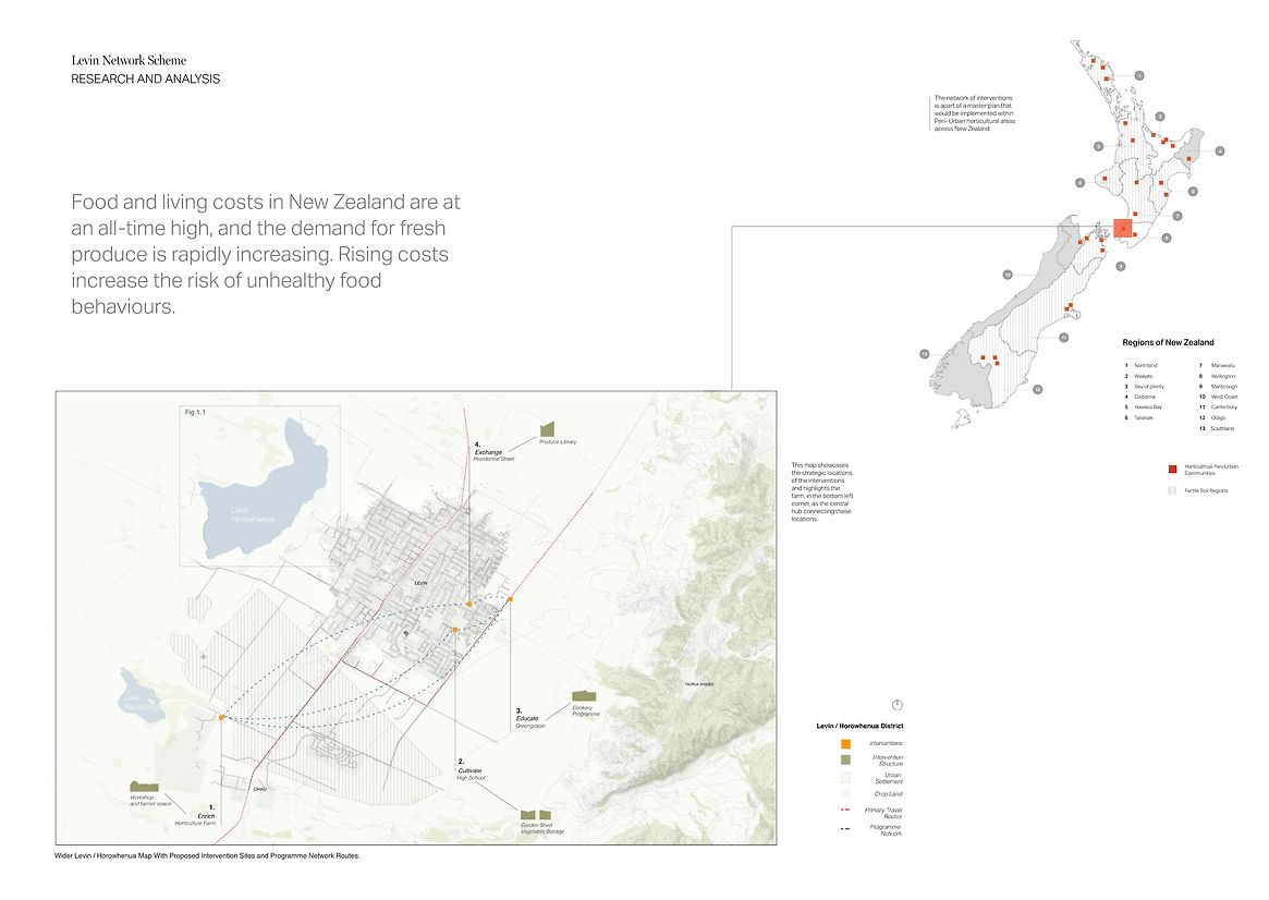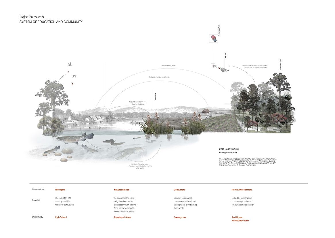 The framework was developed by analysing Lake Horowhenua, local to my case study site of Levin, as an autonomous ecosystem network. The precolonial landscape was a natural food basket, with reciprocal relationships of care between the indigenous Māori people and the land. Healthy and diverse ecosystems ensured a plentiful source of nourishing food, supplemented by gardens. Post colonisation and the commodification of food, the drained wetlands and cleared forests are now home to monocultural produce farms, with the majority of produce exported to urban centres and offshore. This framework took to investigating it as a part of a wider scheme - looking at what community infrastructures exist within local horticultural neighbourhoods around New Zealand and what communities these facilitate. By recognising place, with community demographics and educational potential allowed for enhancing rituals within an existing programme. Each structure is designed to be self-sufficient for that community, the five programmes as a whole target the full scale vulnerability points of our dis connection with our food.