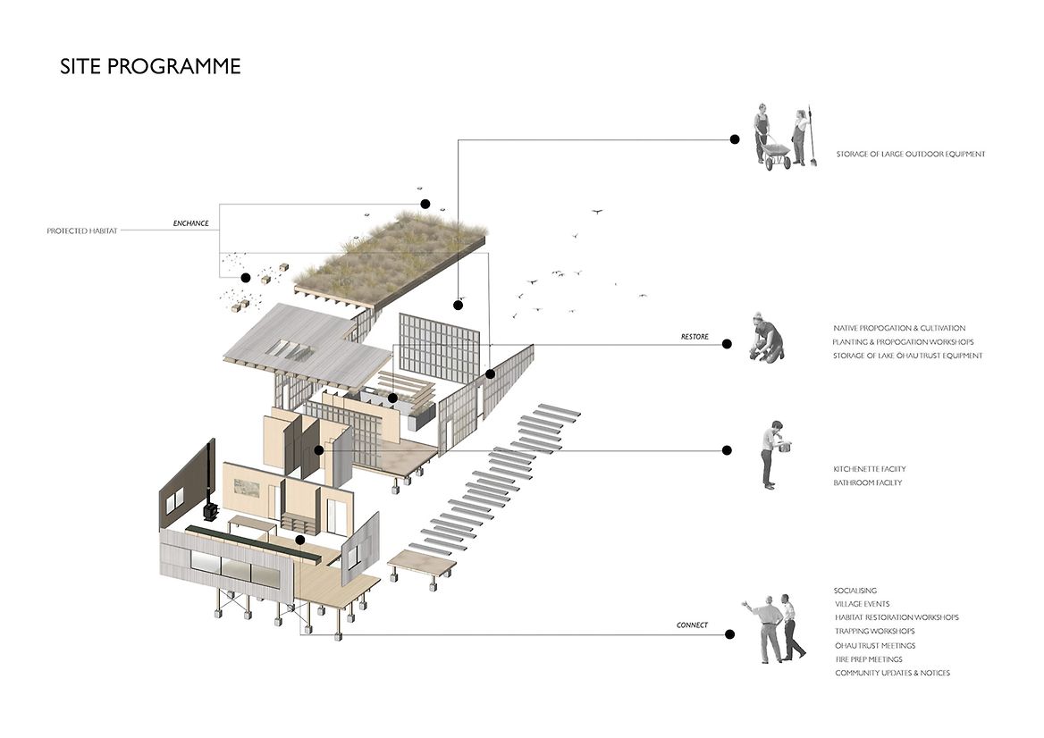 The Multispecies Community is situated within a more than human ideology, it draws focus to how we might reframe our built environment to support cohabitation. To support this ideology the Ōhau Community Trusts goals to; enhance, connect and restore have enforced the narrative and intent of the community structure.