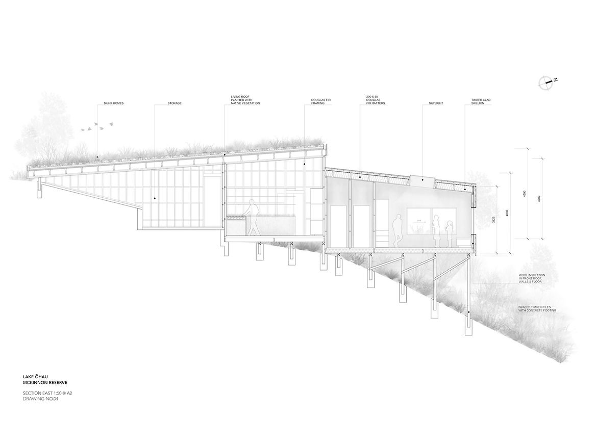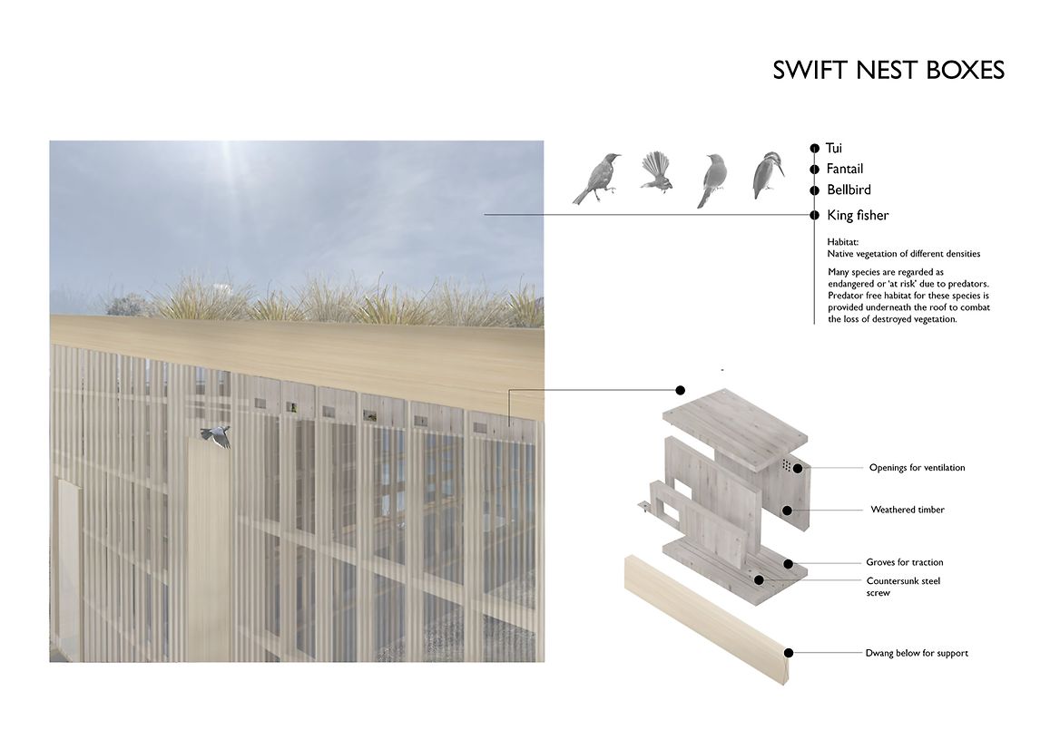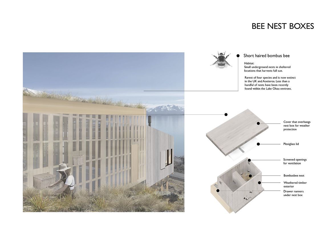 While facilitating human function the structure supports predator-free habitation for indigenous and endangered species inhabiting the environs. Detailed insertions have been built into the structure to protect and enhance native bird, lizard and bee species.
