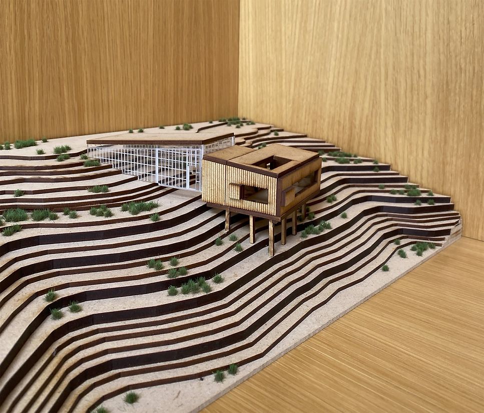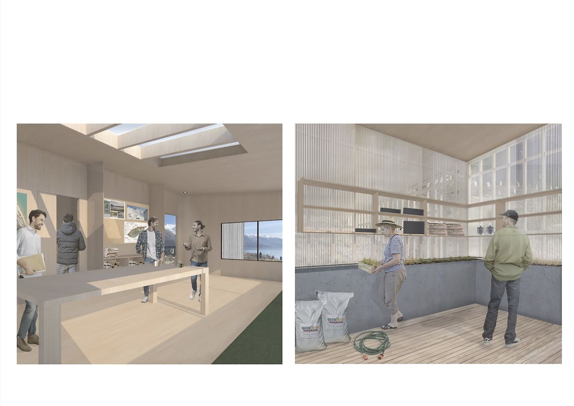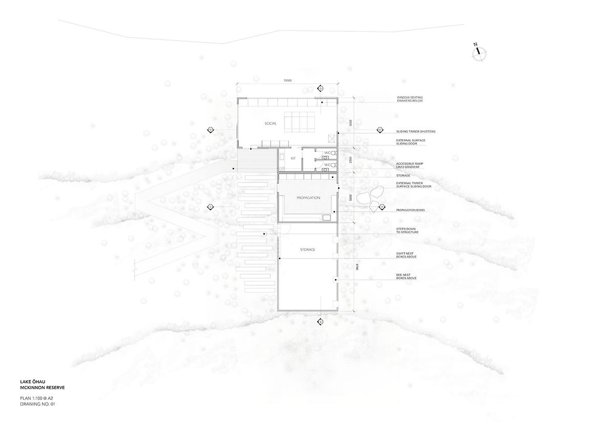 Derived from vernacular architecture the building has a split functionality. The front structure ‘addressing the lake' acts as a social space to hold meetings, events and general socialising. It allows residents to partake in habitat restoration, trapping and fire safety workshops providing them with the means to educate and understand necessary actions to restore the environs. The rear structure ‘blended into the hill’ acts as a space for the propagation and cultivation of indigenous plants. Through workshopping held by the Trust community members will tend to vegetation and partake in regenerating the land back to a pre-fire state.