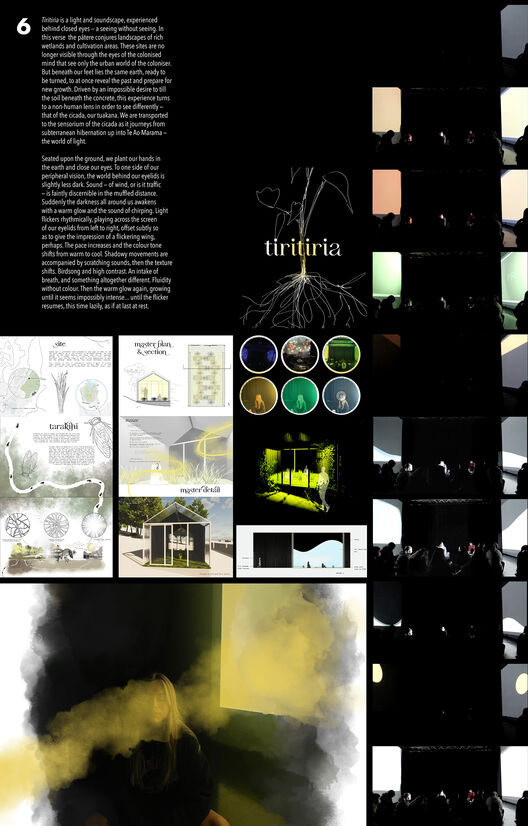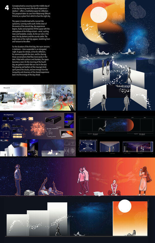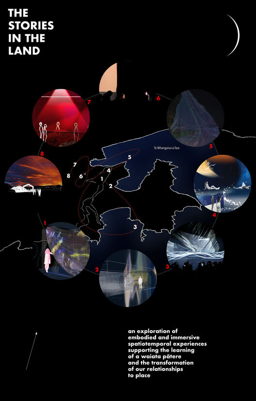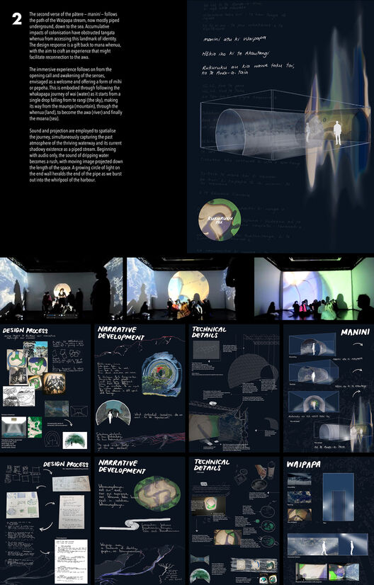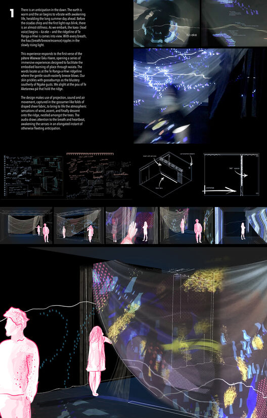 Learning an eight-verse pātere can be daunting, particularly for those who do not speak Te Reo Māori. The project looked to tautoko the efforts of teachers of the waiata, and their learners, by employing spatial design fundamentals of embodied, multisensory experience. Through designing a series of immersive spatiotemporal experiences, students explored how to facilitate meaningful and transformative learning, encourage embodied engagement with stories of place, and enhance mutual wellbeing.