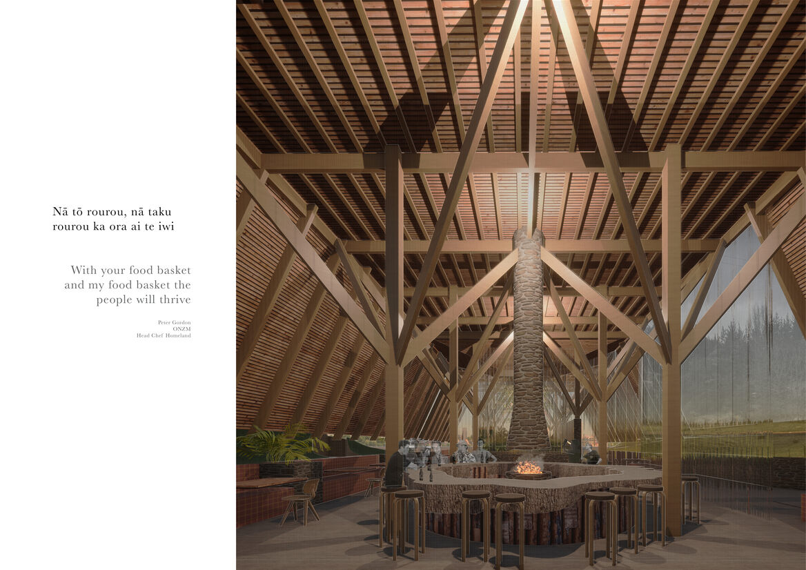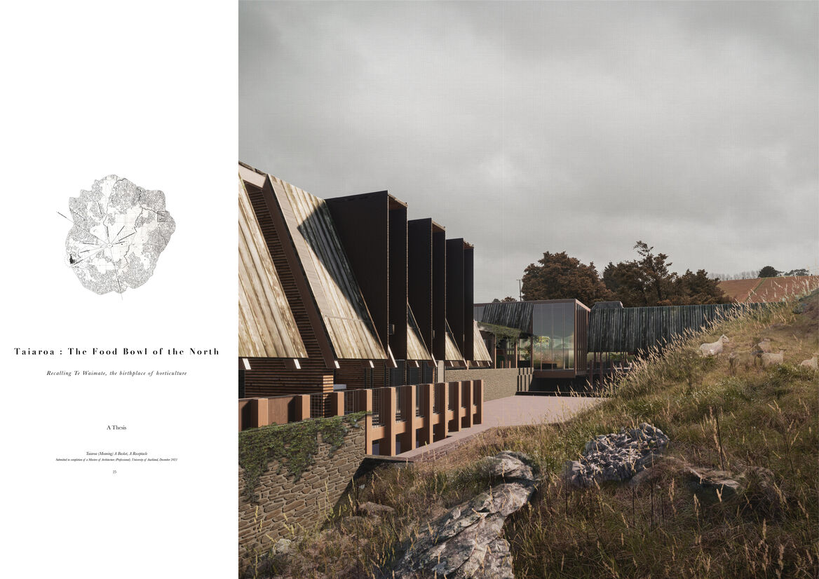 The architectural proposition explores the idea of an alternative approach to sustainability. This utilises contemporary knowledge of organic and regenerative farming practices, while viewing food production and storage through a historic and indigenous lens. These alternative influences have cultivated a nuanced understanding of seasonal, landscape-sensitive production and land use, which has filtered through every aspect of the project. In employing these hybrid ideas, architecture is used as a tool to create a positive social life, cleansing the way the surrounding Northland communities consume food. Ultimately, this results in a better understanding of how our land is used and valued, avoiding situations seen in Pukekohe. This thesis presents a visionary yet viable approach to the solution and is designed to maximise the possibilities within this topic beyond what is realistically possible in order to discover how food could be grown and consumed in the future.