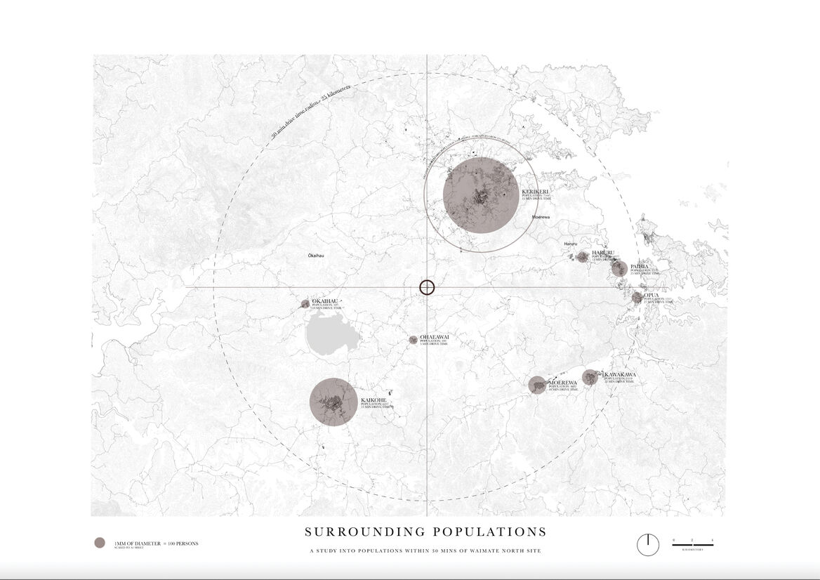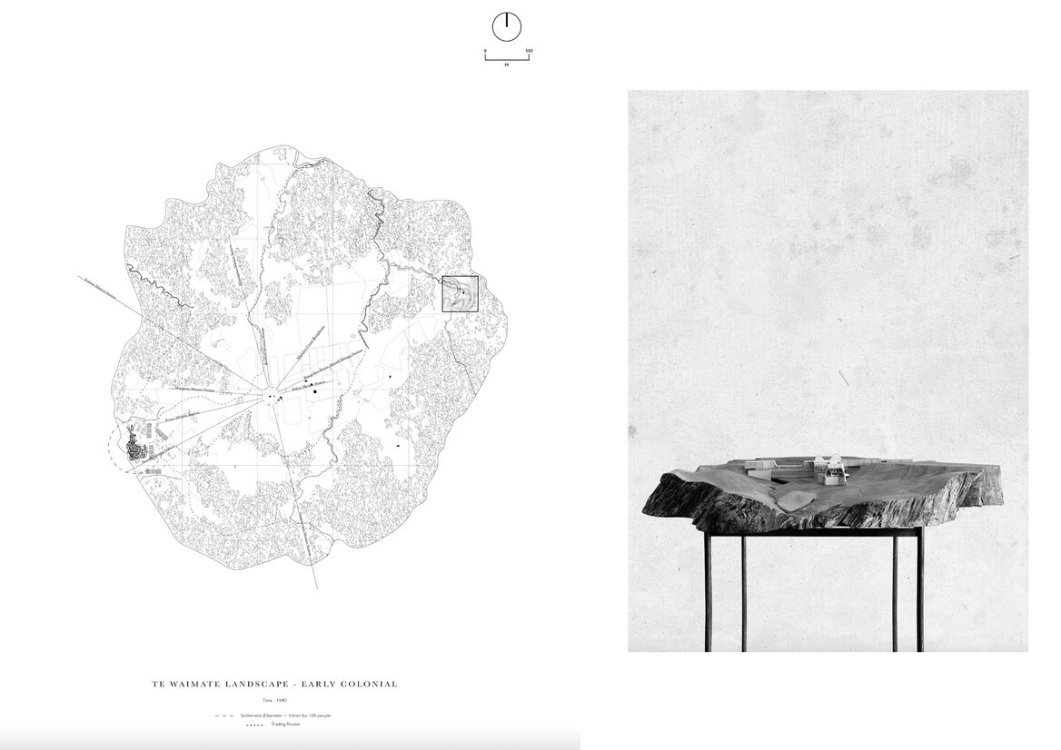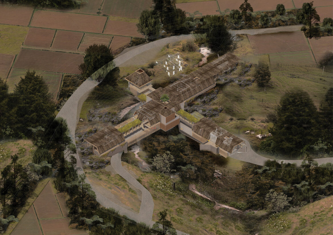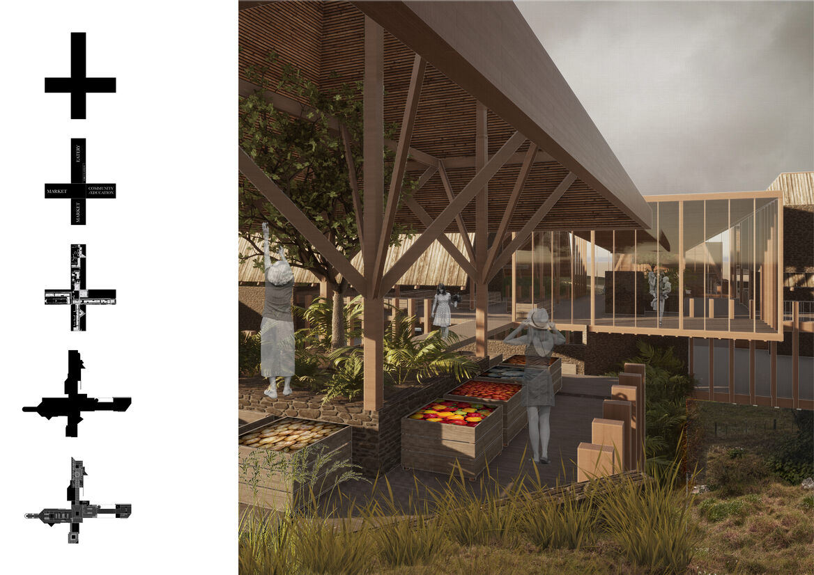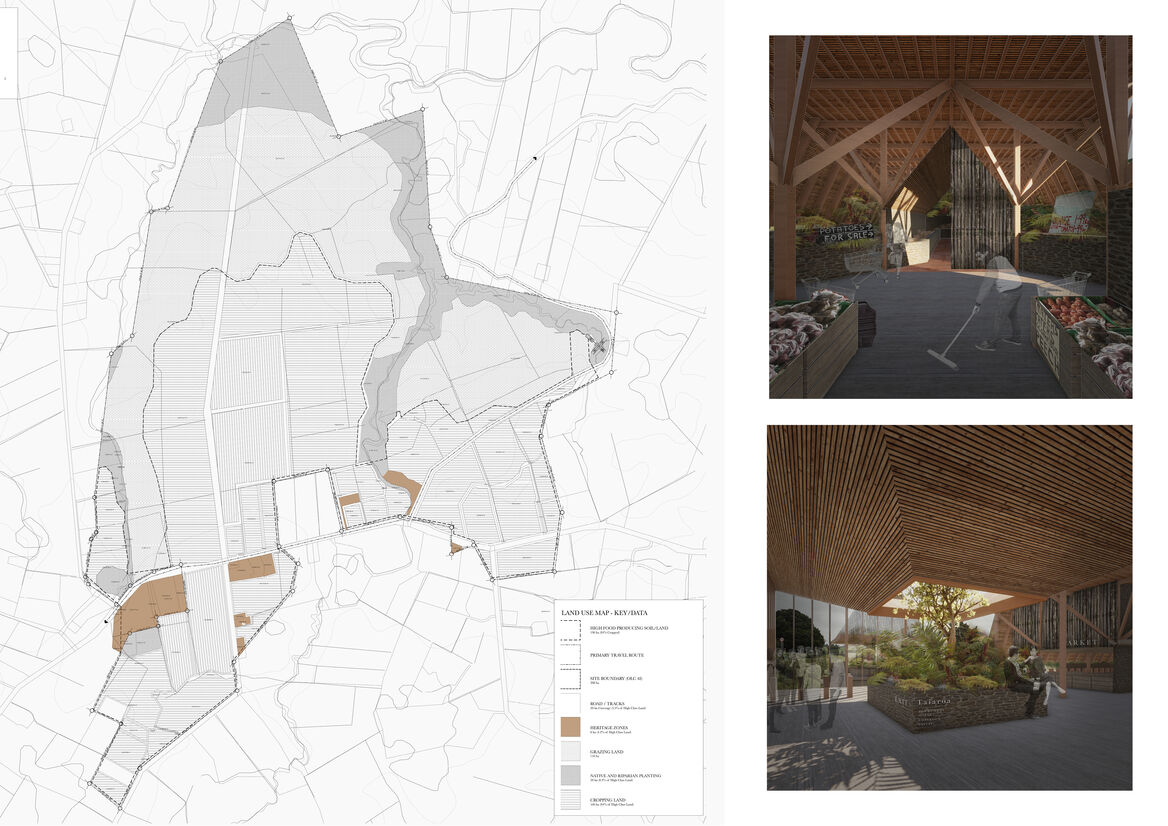 This design-led thesis explores how an architectural proposition can regenerate the decimated provincial landscape of Aotearoa, New Zealand. By drawing on indigenous and historical knowledge, architecture is considered as a tool in overturning the current over commercialised supermarket food consumption model. A single multifaceted intervention adjacent to 200 hectares of Class A soil in Northland’s Te Waimate region acts as the antithesis to contemporary methods of food production, sale, and consumption in Northland. The scheme aims to reduce the steps between paddock and plate by selling seasonal produce from the land to sustain the growing local community of 15,000 and reduce the handling we see in commercial food production today.