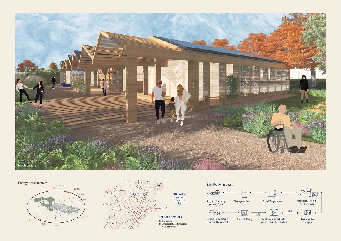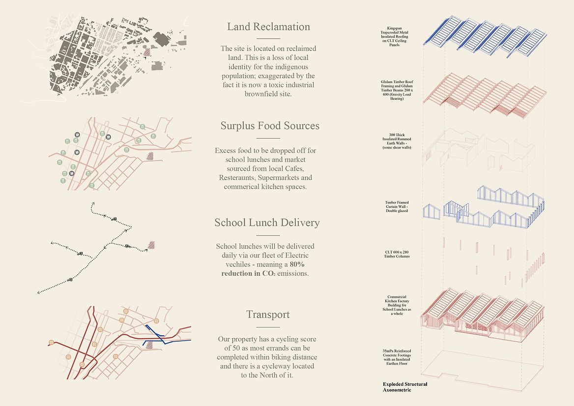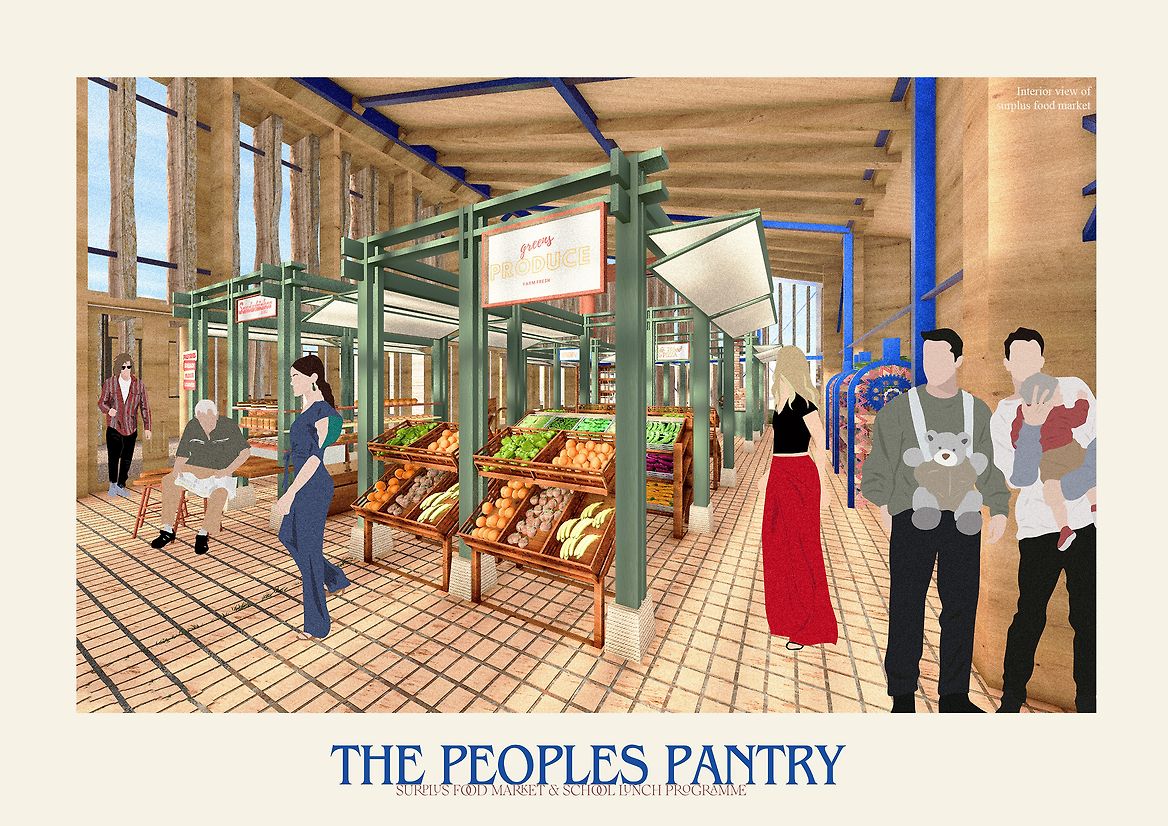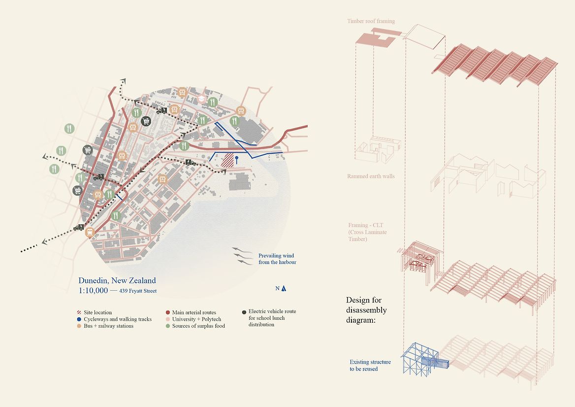 The People’s Pantry is a pioneering sustainable food hub located on a reclaimed industrial brownfield in Dunedin, designed to combat food waste and food poverty through innovative, community focused architecture. It uniquely combines a surplus food market, restaurant, and commercial kitchen producing daily school lunches for nearly 2,000 children, while serving the wider community including university students and families.