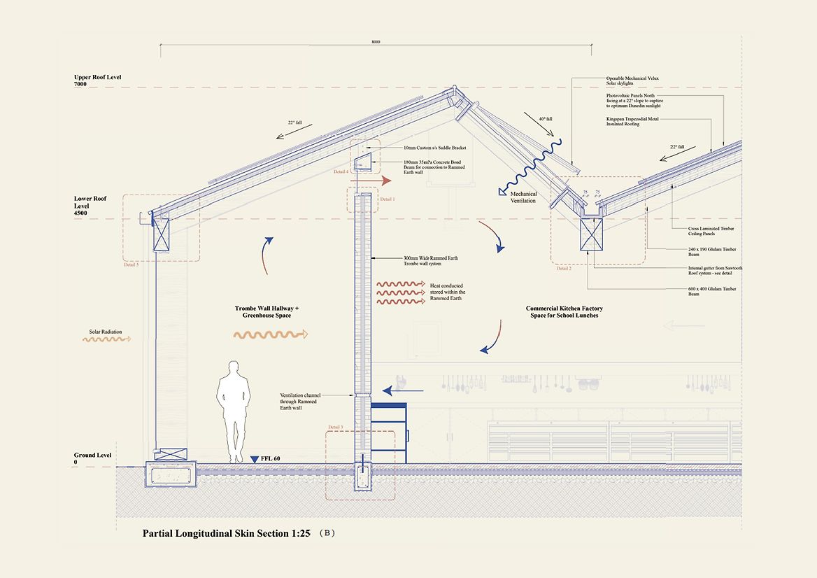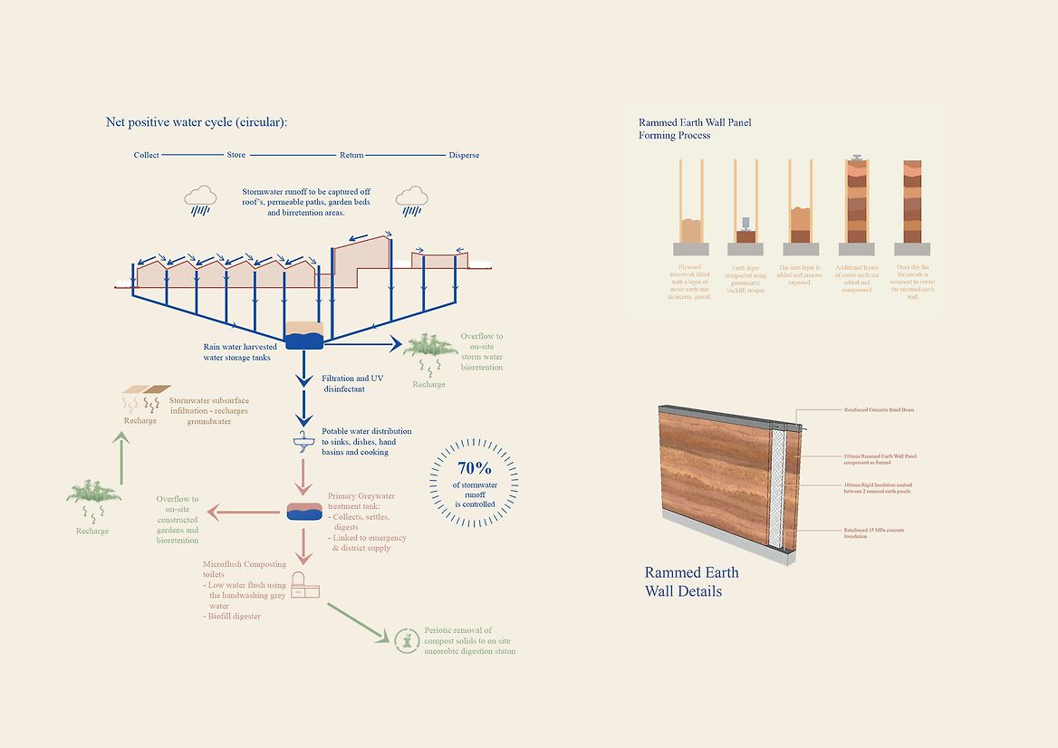 Key environmental challenges including asbestos contamination are addressed through phytostabilisation and bioremediation with native vegetation. An onsite anaerobic digester converts food waste into biogas, powering the building’s heating needs. Passive solar design, including trombe walls, maximizes natural light and thermal efficiency. Water harvesting and greywater systems support irrigation and sanitation, closing resource loops.
