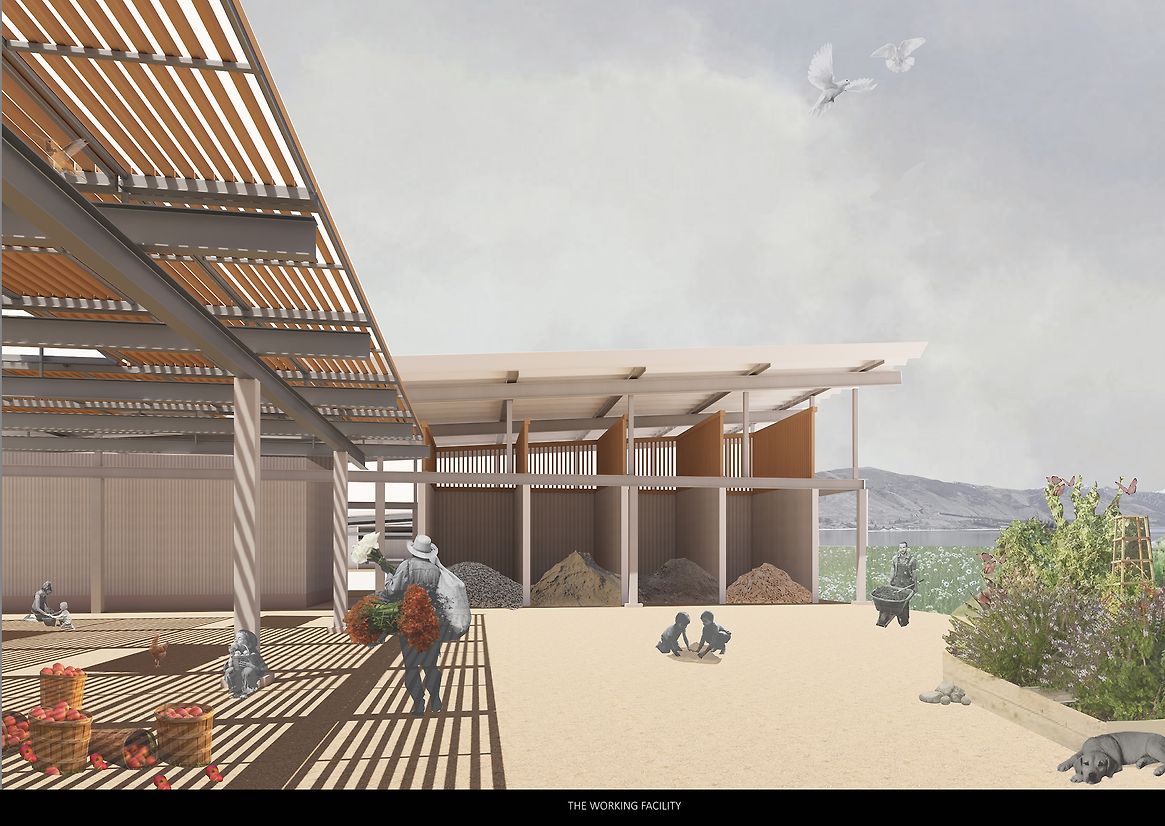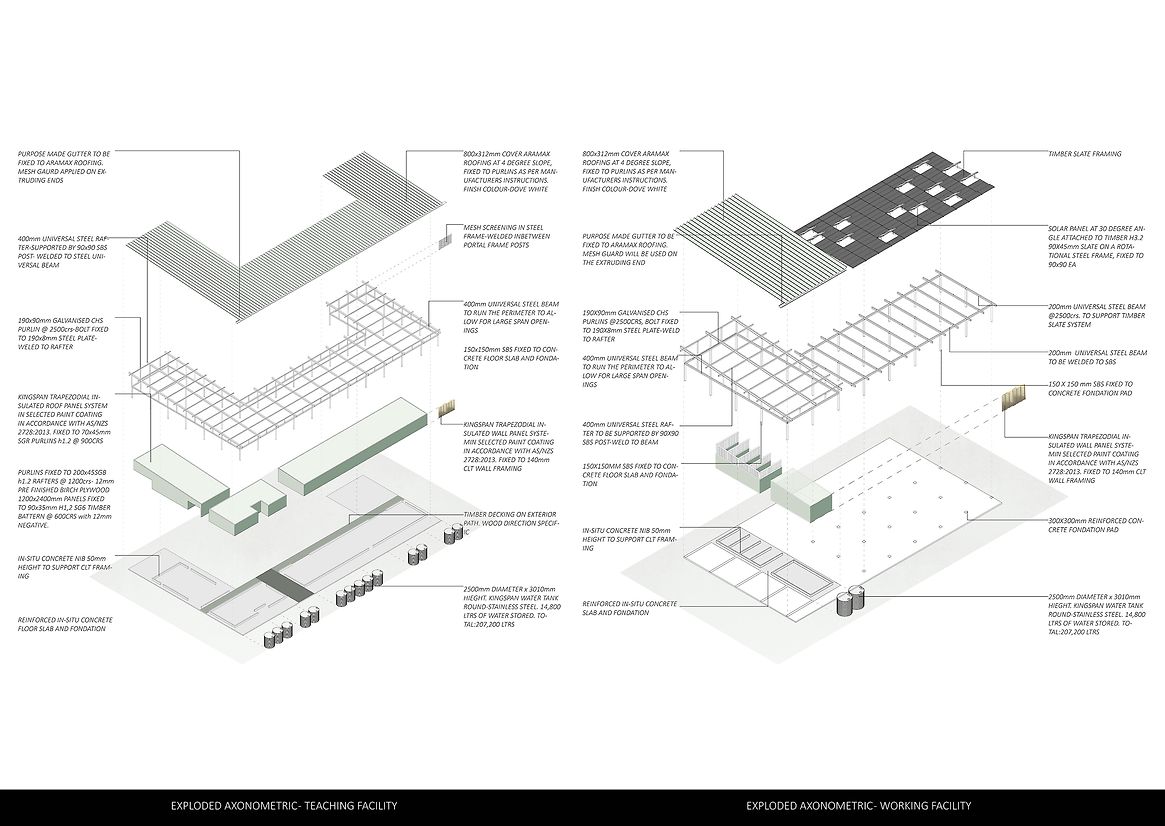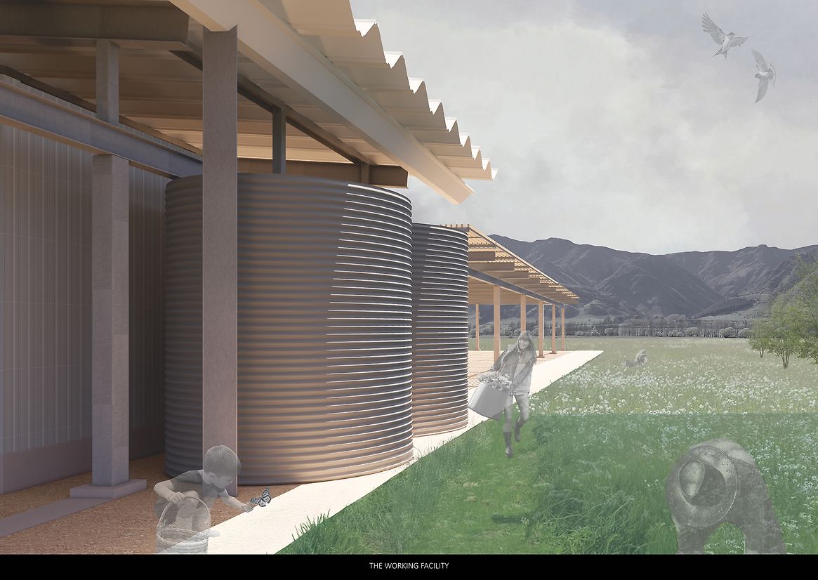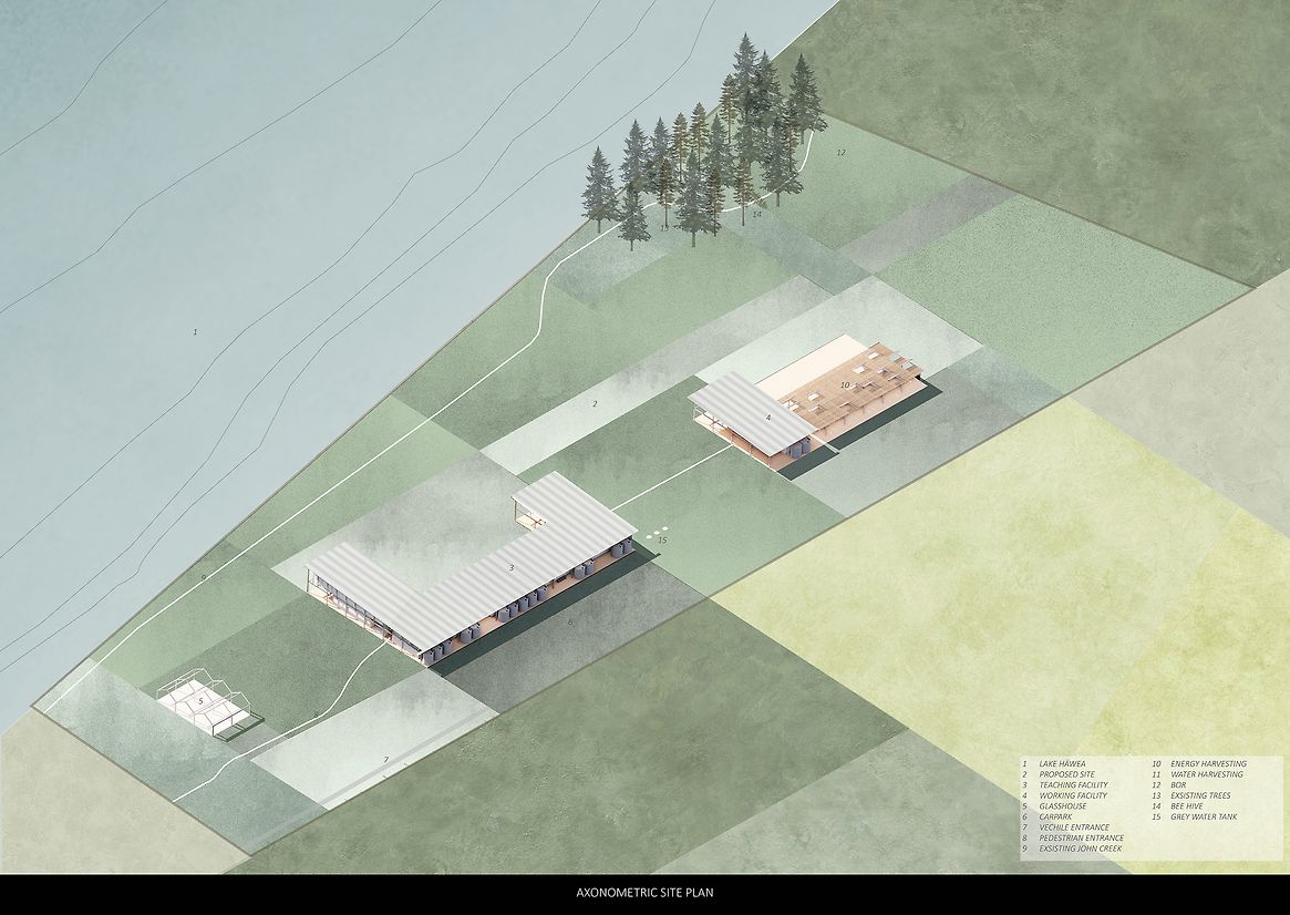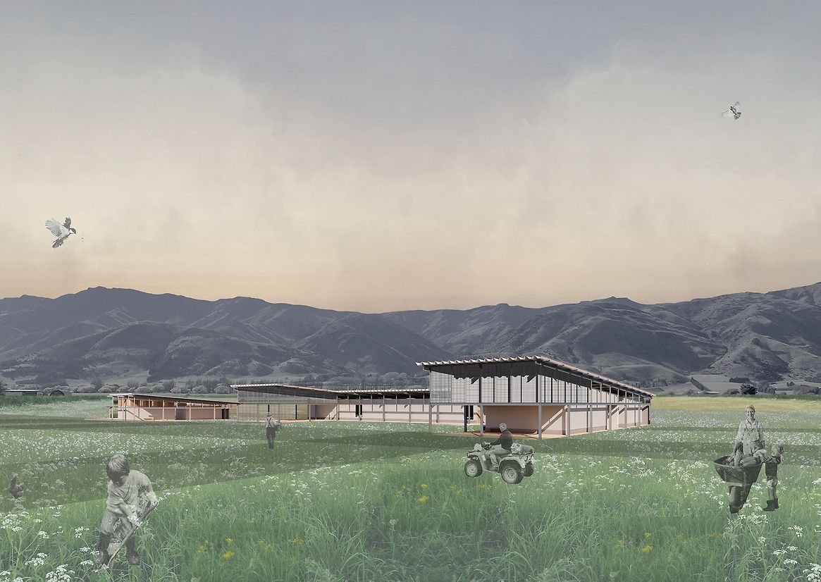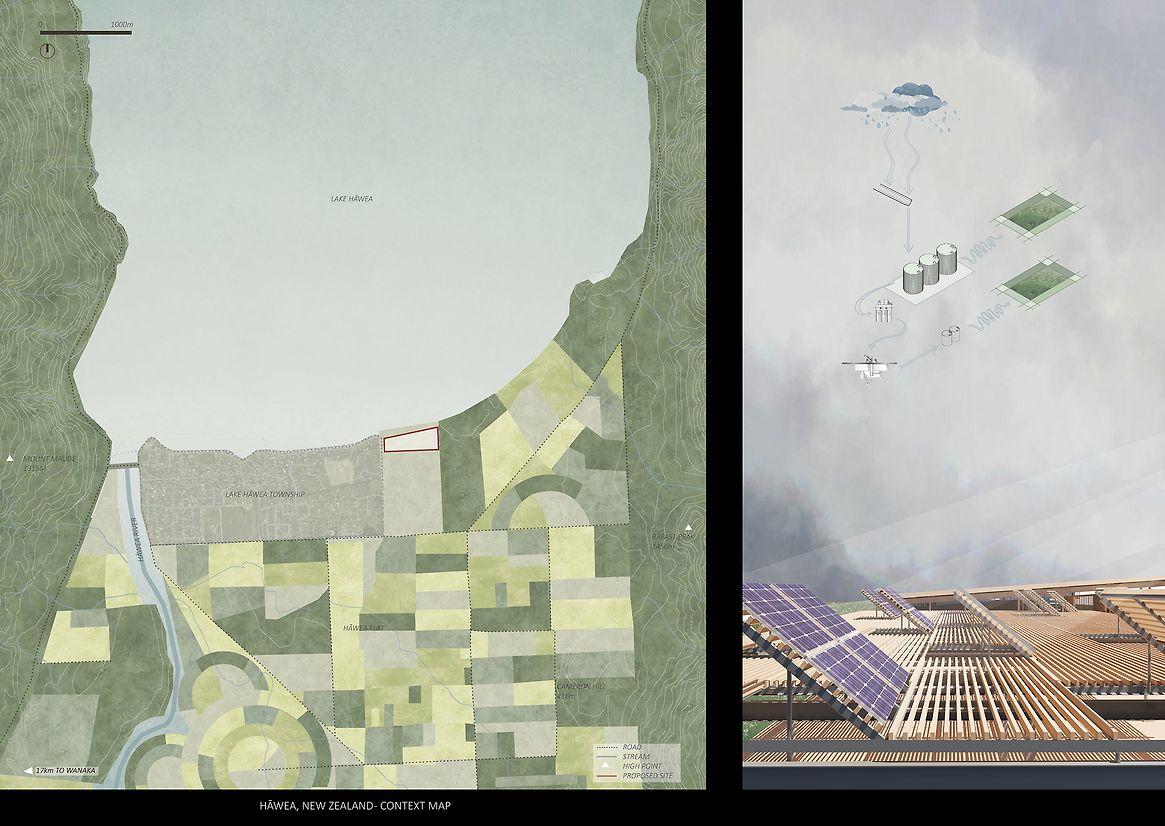 Grounded within the fertile, weathered landscapes of Hāwea, Central Otago, the Agricultural Centre emerges in response to a region in transition. Once shaped by its agricultural backbone, Hāwea is increasingly defined by lifestyle developments—vineyards, holiday homes, and seasonal residents—creating a growing disconnect between people and land. This project challenges that drift. It seeks to re-anchor agriculture as a shared cultural practice, not a distant backdrop, through an architecture that embraces climate, labour, and the rhythms of its environment. More than a building, the Agricultural Centre is a living vessel, a spatial and ecological system designed to reconnect people to the cycles that sustain them. It invites both locals and visitors to participate directly in food production, reframing agriculture not as a romanticised retreat but as an honest, cyclical process of cultivation, harvest, and stewardship. The centre works with, not against, the natural forces of its site—sun, wind, drought, and seasonality are not mitigated but integrated into every aspect of its form and function. At the core of the project is a circular educational model housed within the Teaching Facilities, five interconnected programmes that mirror the stages of the agricultural cycle. It begins in the propagation centre, where seeds are nurtured. Learners move through the crop field for hands-on experience, then into produce storage, a cooking and cafe area for sharing and celebration, and finally, a multipurpose space for community gatherings, workshops, and knowledge exchange. This spatial narrative forms a loop of learning, making the growing process visible, embodied, and participatory. Surrounding this heart is a mosaic of specialised spaces: three glasshouse units tuned to distinct climates, a farm shed for tools and labour, rotational composting bins that close the nutrient loop, and operational areas that enable daily function. Circulation moves through rather than around the site, intentionally exposing users to the elements. In doing so, the architecture reinforces a central belief: that agriculture is something to be lived, not merely observed. The centre’s design is deliberately stripped back—precise, exposed, and grounded in purpose. A reflective Aramax roof harvests rainwater into a series of visible tanks, storing up to ten weeks’ supply in anticipation of drought conditions projected for the region. Solar panels power daily activity. Seasonal shifts are not softened but embraced: in summer, the centre pulses with agricultural intensity; in winter, it slows for reflection and repair. These patterns become part of a built calendar—a way of telling time through weather, work, and growth. In essence, the Agricultural Centre is an anchor for reconnection. It restores the link between land, food, and community, not through nostalgia, but through grounded, generative experience. It nurtures a deep sense of place, offering both orientation and identity to those who walk its paths. Visitors come to know not just where they are, but who they are in relation to this special environment. In a region at risk of losing its rural heritage, the centre becomes a living system of resilience—architecture in rhythm with land, climate, and community.