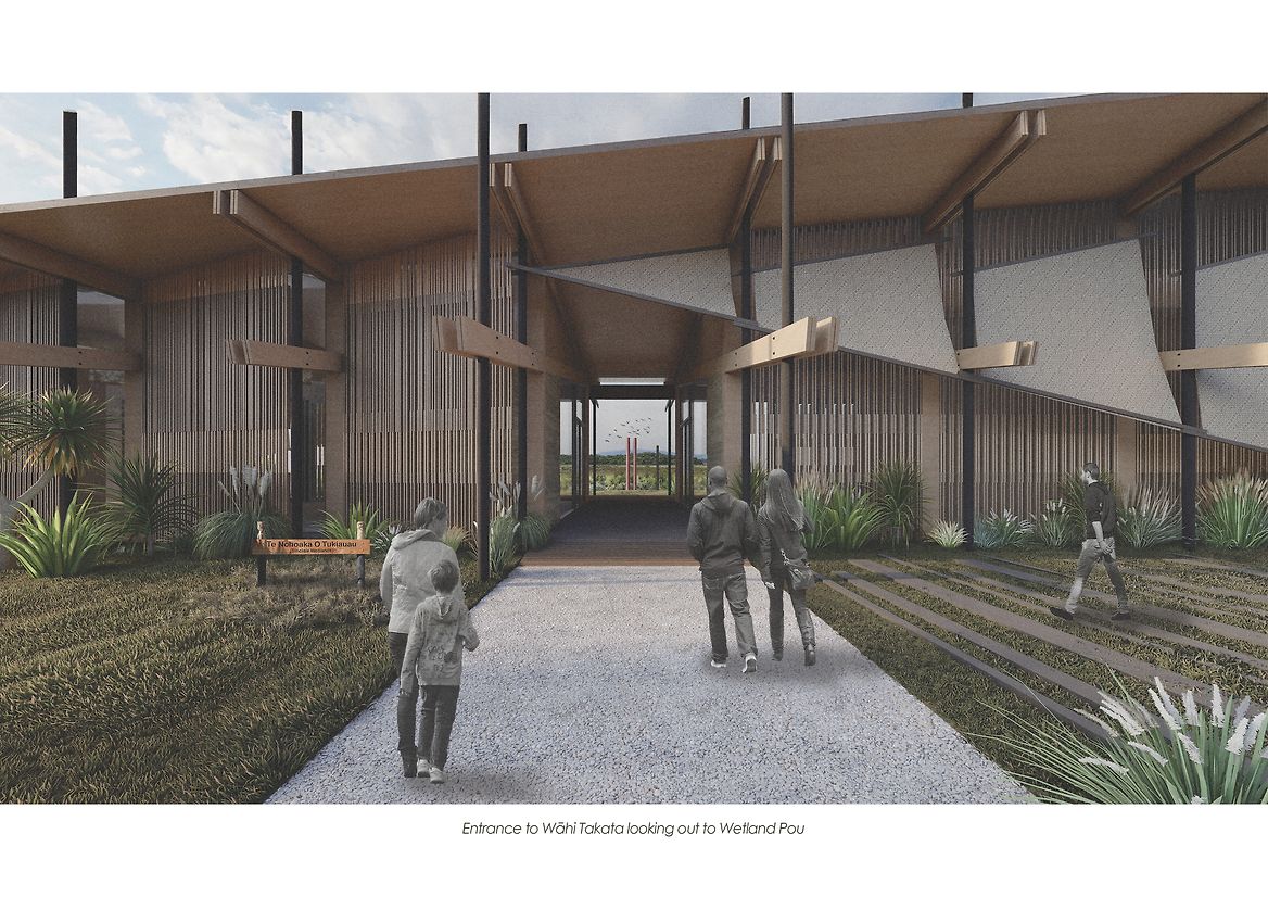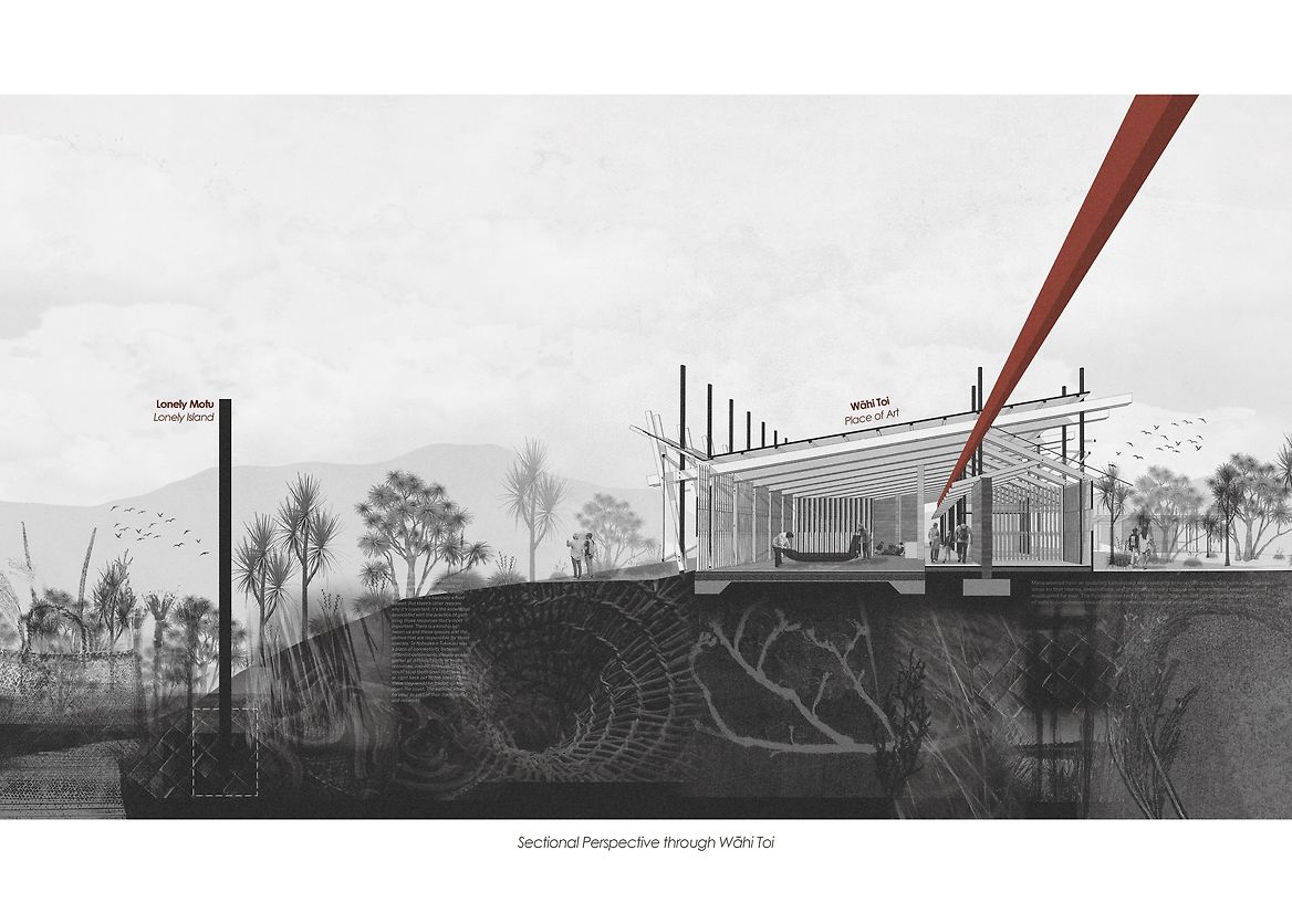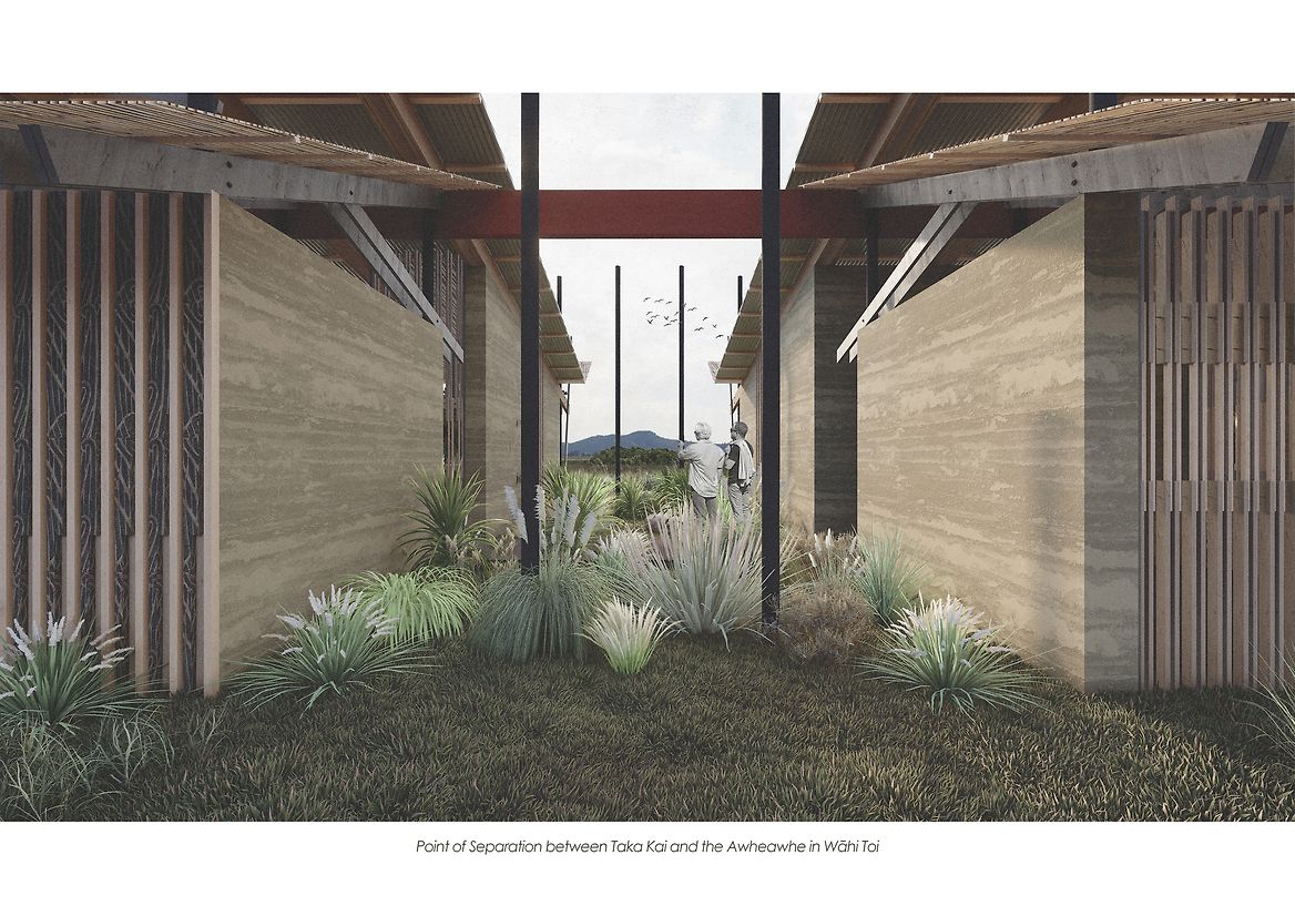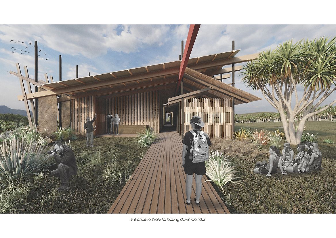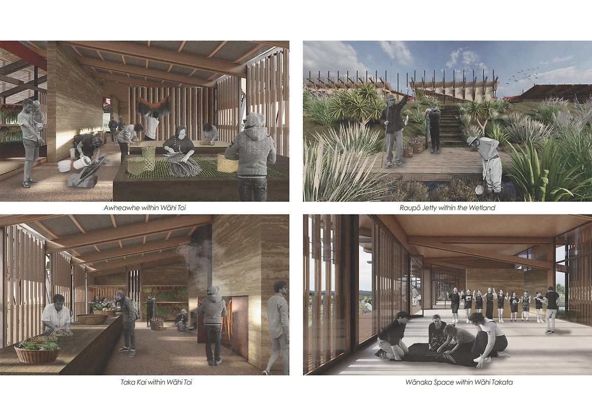 The site is anchored by two pavilions: Wāhi Toi (Place of Arts) and Wāhi Takata (Place of People). A central tāhuhu (ridge beam) aligned north–south symbolises the journey of spirits and the continuum of knowledge across generations. Wāhi Toi, inspired by the form of a hīnaki (eel trap), uses woven harakeke sails, tōtara beams, and rammed earth walls to create a porous, breathing structure that responds to the environment. Wāhi Takata provides flexible spaces for seasonal gathering, learning, and extended stays, oriented to face the wetlands as both environment and ancestor.