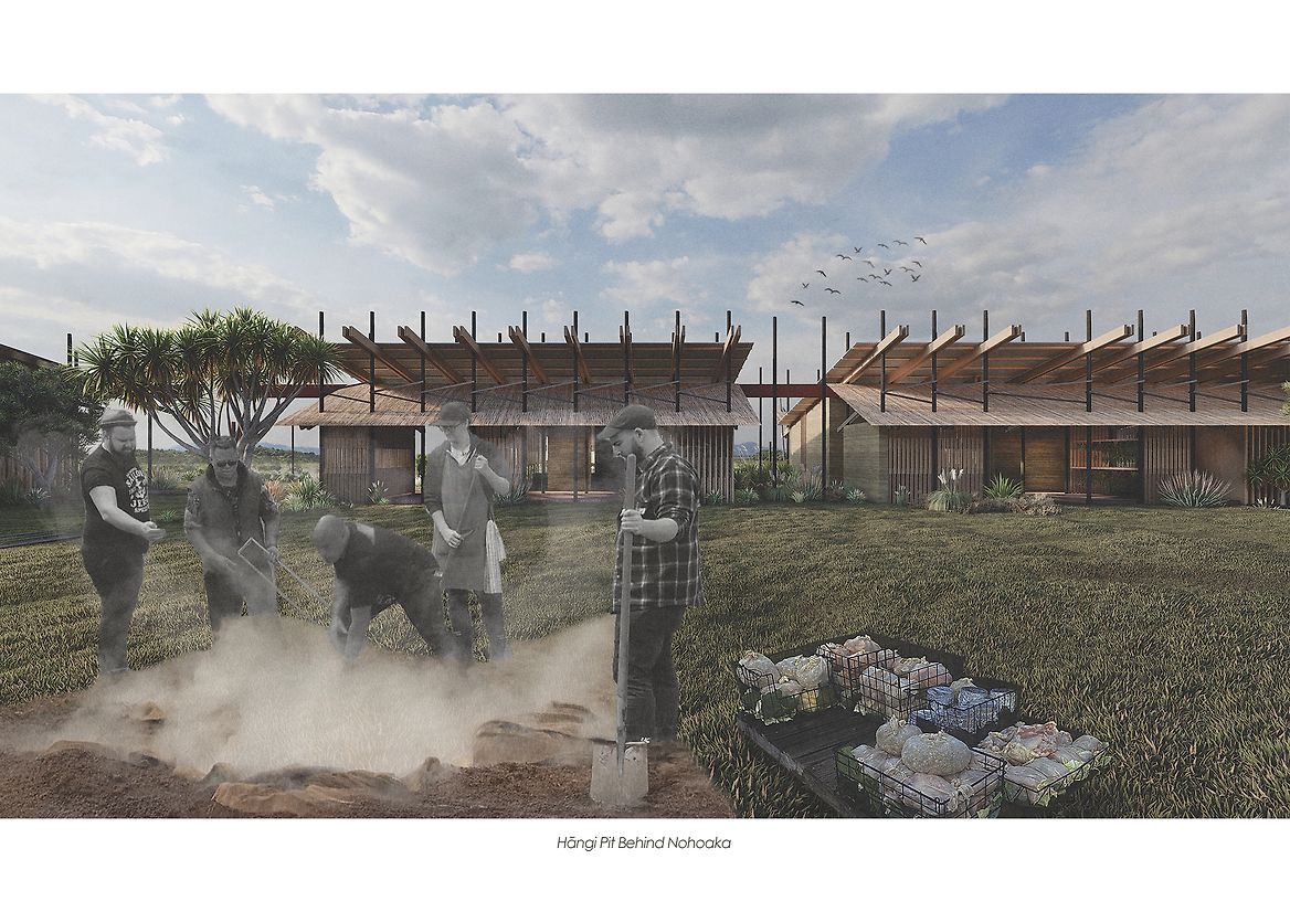 Guided by the whakataukī He taoka nō te whenua, me hoki anō ki te whenua (“what is given by the land should return to the land”), Nohoaka embraces a Māori worldview where architecture, like all living things, must eventually return to Papatūānuku (Earth Mother). It rejects colonial ideas of permanence in favour of cyclical renewal, care, and decay.