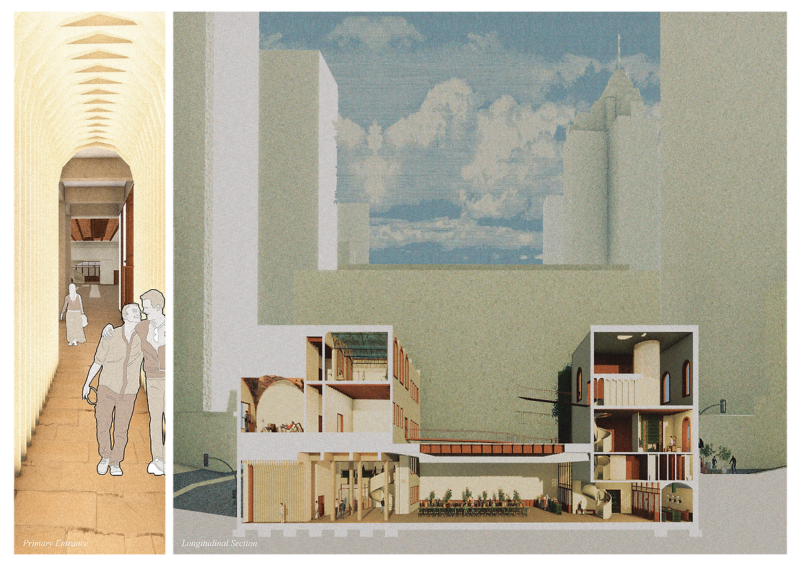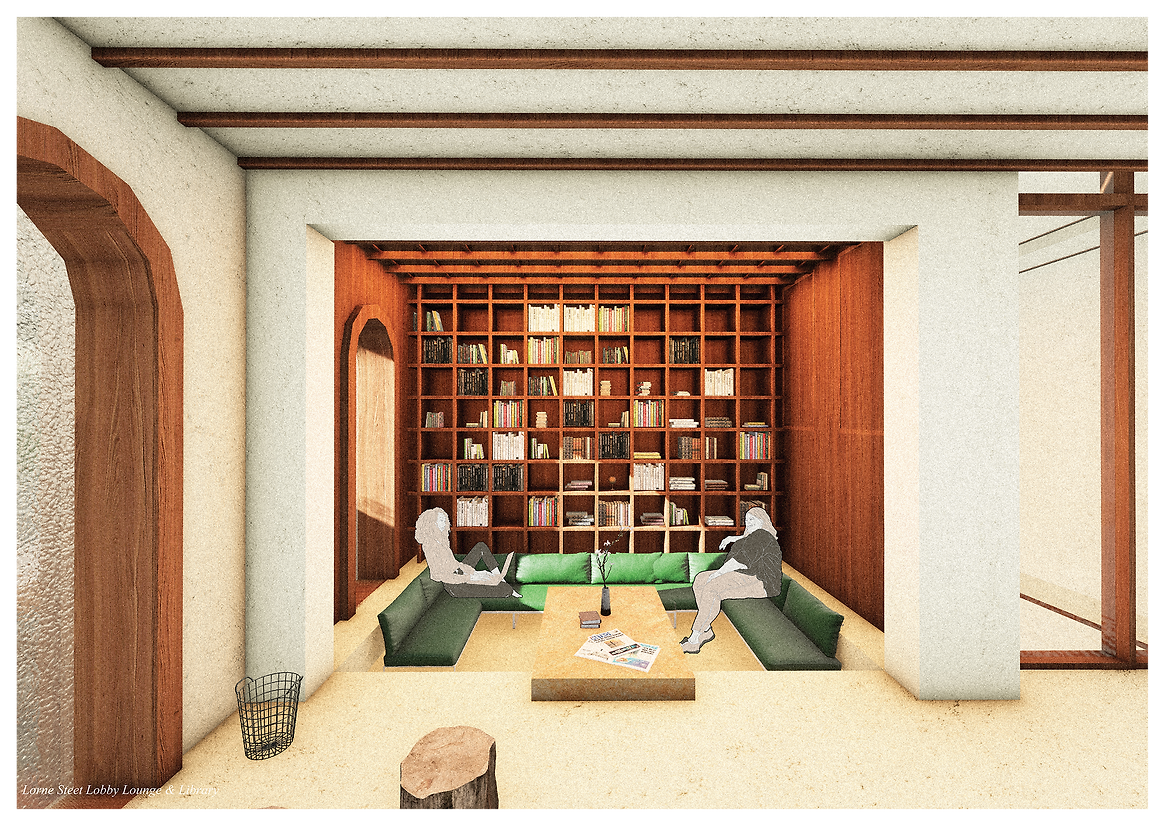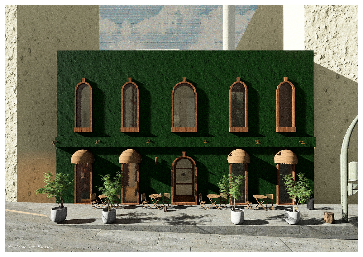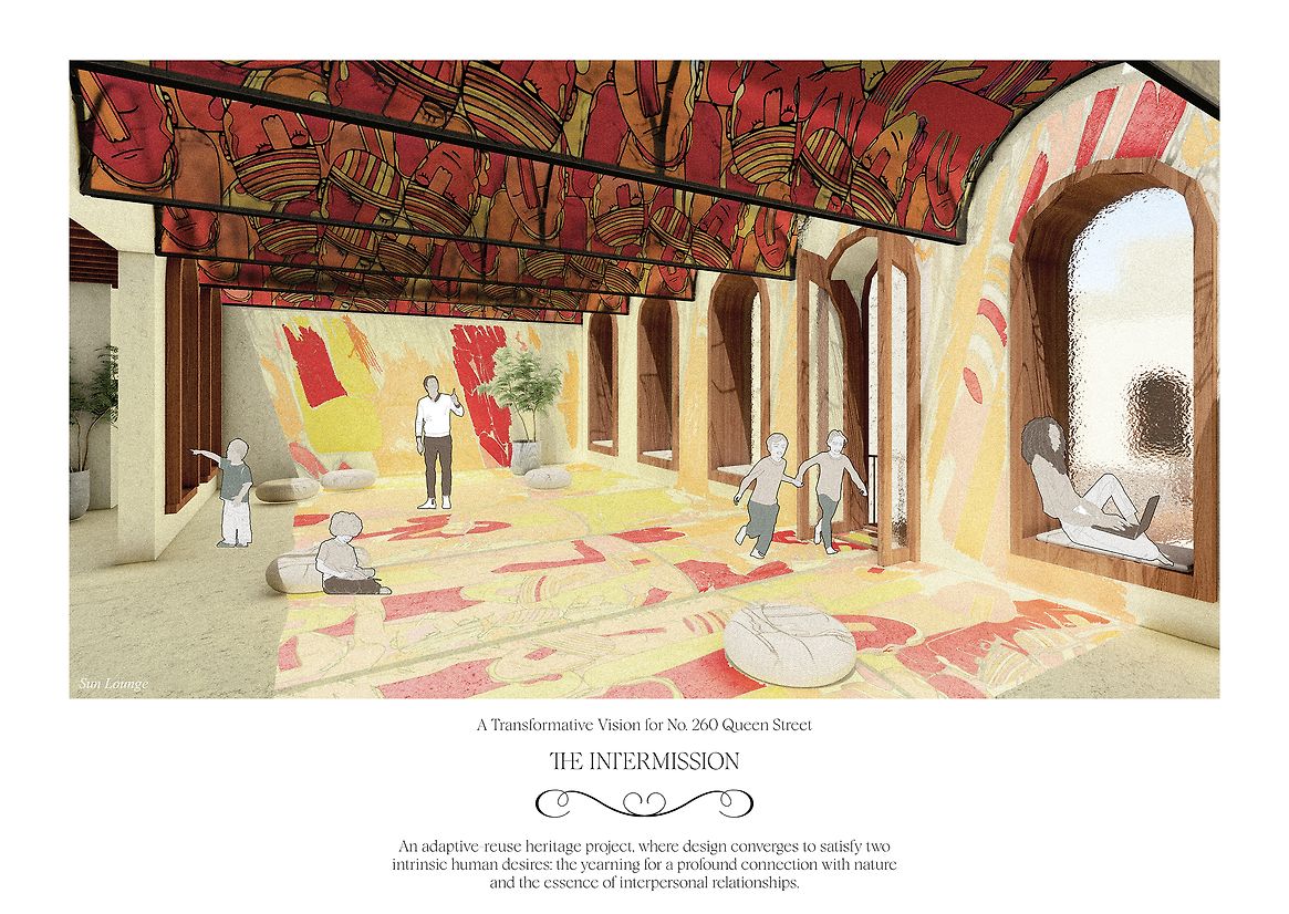 In a society so accustomed to artificial stimulation, the need for community spaces which allow authentic human experiences is dire. The intermission acts as a haven, allowing freedom and choice in the urban environment while subtly pushing for chance encounters and connection to nature, grounding occupants in their fundamental human nature. This endeavour focuses on enhancing tactility and materiality by crafting captivating, interconnected atmospheres. Rooted in heritage, The Intermission lovingly restores the Italianate Victorian charm of the Former ASB bank building, along with two adjacent Structures.