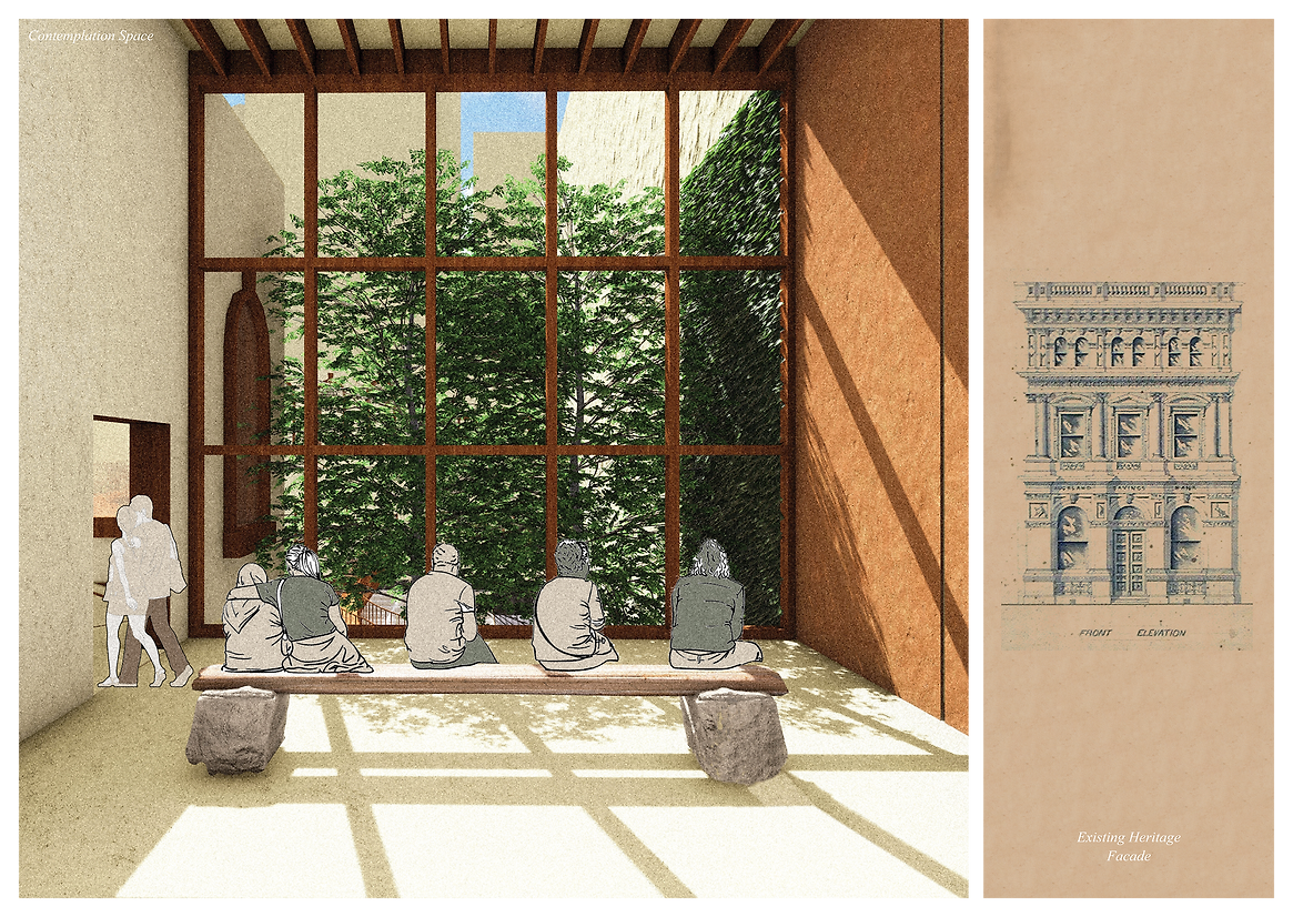 connection with nature and the essence of interpersonal relationships. Amidst the towering high rises of the cityscape, this adaptive reuse initiative embraces the challenge of blending nature's embrace seamlessly into the urban fabric.. In this architectural piece, every space is a canvas artfully designed to resonate with the diverse dimensions of human existence, fostering connection, introspection, and a profound sense of well-being.
