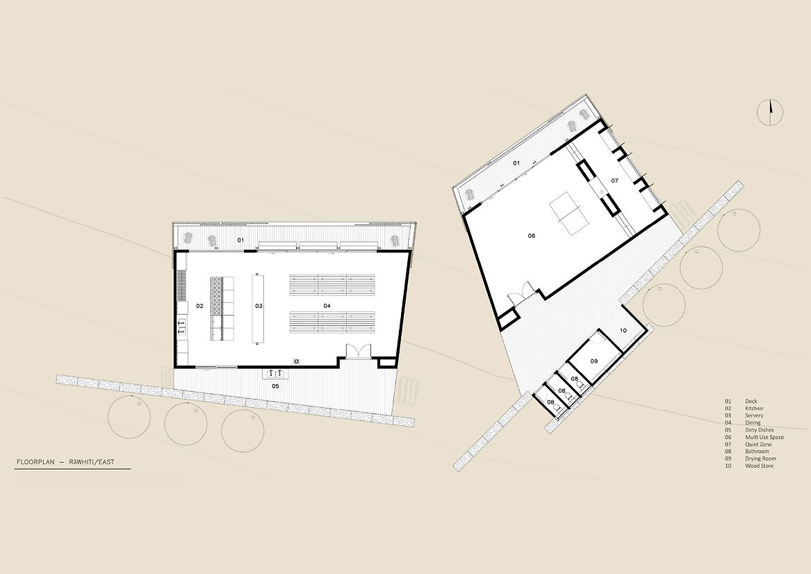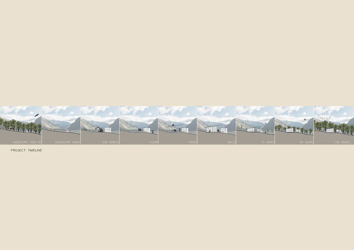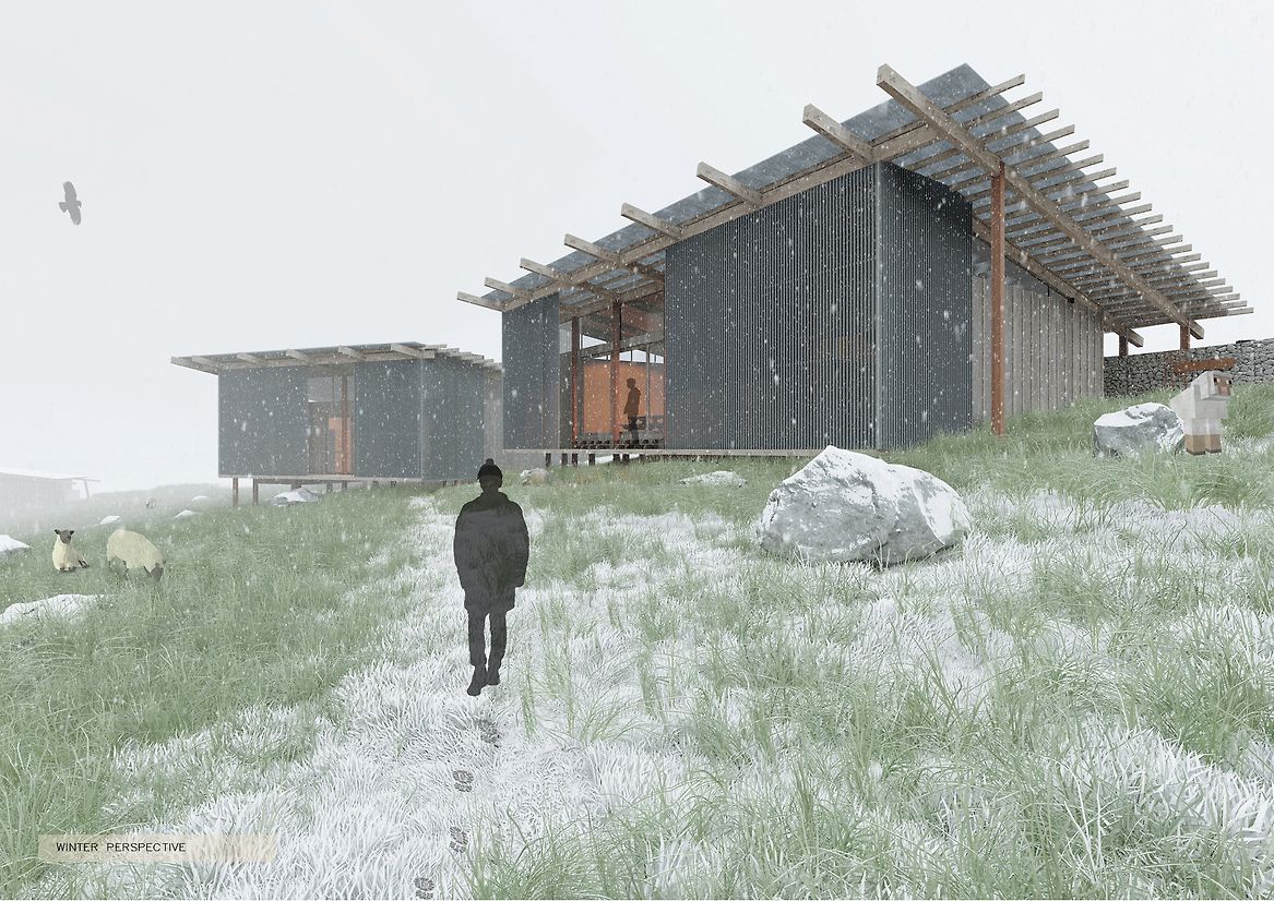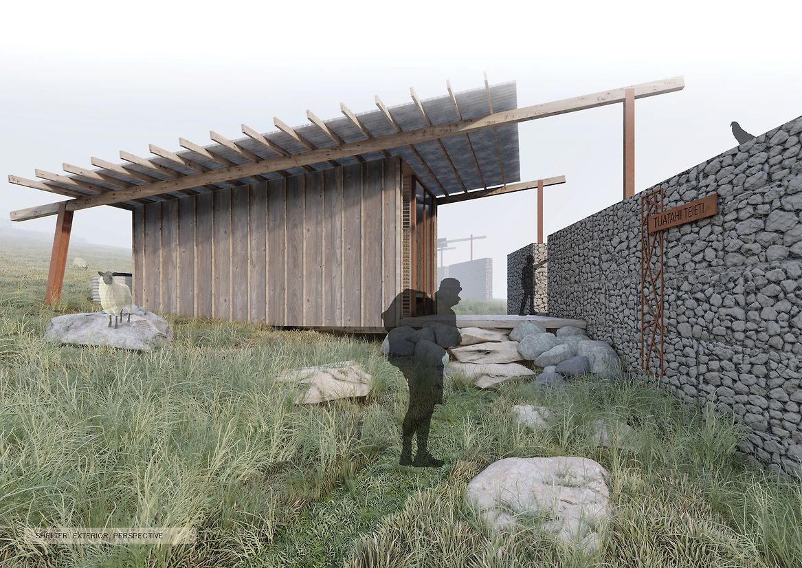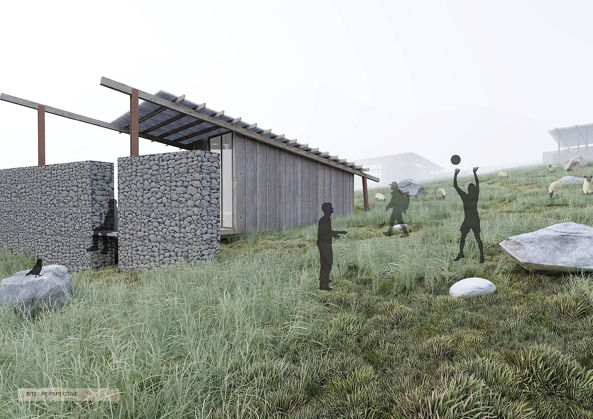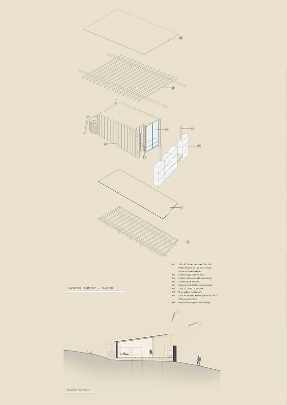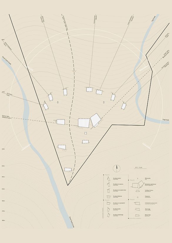 Since 1977, Otago Boys High School has owned an outdoor education lodge on the northern side of the Mātakitaki Valley, North-West of Wānaka. Over the years, many generations of students have crafted great experiences here. However, due to the age of the lodge, it requires frequent maintenance and is unsafe for current students during the colder months. The Mātakitaki project proposes a new contemporary lodge facility that will continue the school's outdoor education legacy and provide safe and welcoming facilities for many students to come. The project embraces sustainable design by incorporating vernacular and cultural elements.The chosen site is positioned beneath the Southern Alps, near the western branch of the Mātakitaki River. Situated on the southern side of the valley, the site gains maximum sunlight throughout the year and offers panoramic views of the landscape. The isolated site is designed to be self-sufficient, utilizing solar energy and rainwater collection for a healthy and safe environment. Seismic structural elements and an engineered roof ensure resilience against natural disasters such as earthquakes, landslides, floods, and heavy snow loads.Centuries ago, local Māori people relied heavily on the land for huntingand the search for valuable stones like pounamu along the West Coast. As Māori people traversed the challenging terrain, the concept of movement and migration through the land gained significance in the creation of today’s backcountry walking tracks. The notion of movement is embraced through this project by encouraging students and teachers to explore the landscape, forging their own paths around the spaces. Throughout the site, steel screens, representing native Mountain Beech Trees, serve as navigation markers, guiding the students along their journey of exploration. These screens were collaboratively designed with the students at Otago Boys High School, symbolizing the growth process of both the trees and the students throughout their secondary education.The design consists of a cluster of dwellings, featuring seven various sleeping shelters for students and teachers - aligned north for maximum solar gain. The gabion walls that guard the sheltershave rectangular breaks framing views of peaks, headwaters, and the junction of the Mātakitaki River . Each shelter is named based on the corresponding geographical feature. Students are able to drop off their gear at assigned shelters and then proceed to the main communal structures, Hauāuru and Rāwhiti Mātakitaki, located down the valley branches. Behind Rāwhiti Mātakitaki, there is an elevated stone Pātaka for food storage and a Toutou Whare for wood storage. The communal spaces include Rāwhiti and Hauāuru Mātakitaki. Rāwhiti Mātakitaki consists of a kitchen/dining area and a multi-use space with a lower quiet zone overlooking the valley.The project promotes an ongoing collaboration between the designer and students, with a focus on involving students in the construction process of the shelters, providing them with valuable skills and a unique learning experience. The Mātakitaki design proposes a new contemporary lodge facility thatembraces sustainable design, student involvement, and a living project concept, ensuring the continuation of the school's outdoor education legacy.