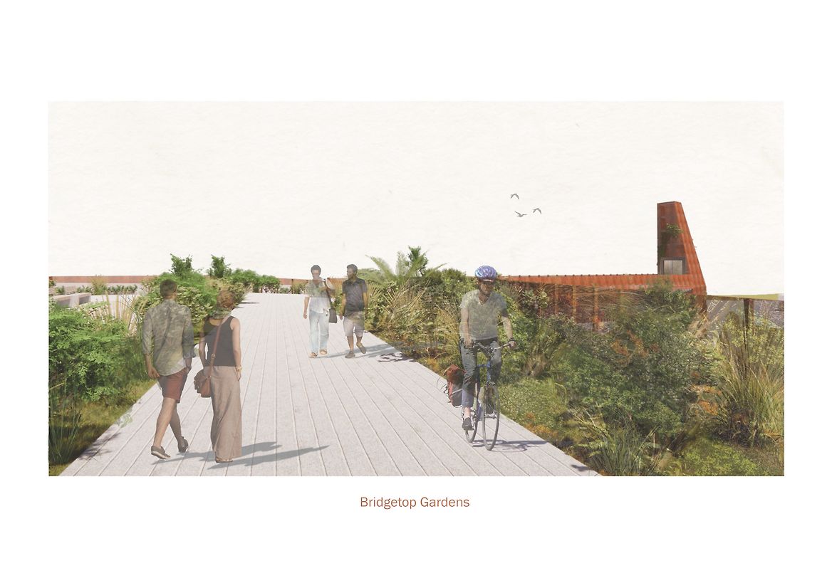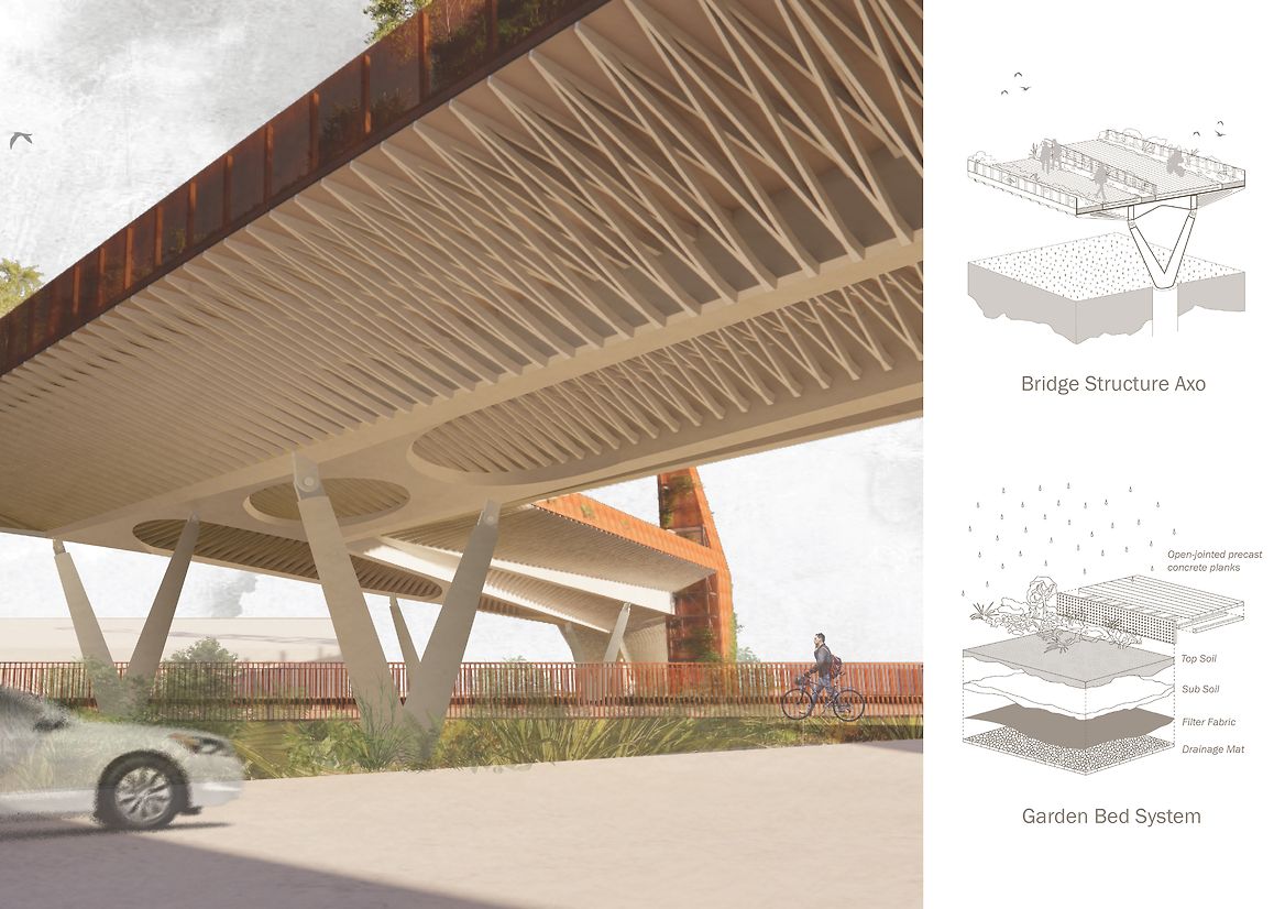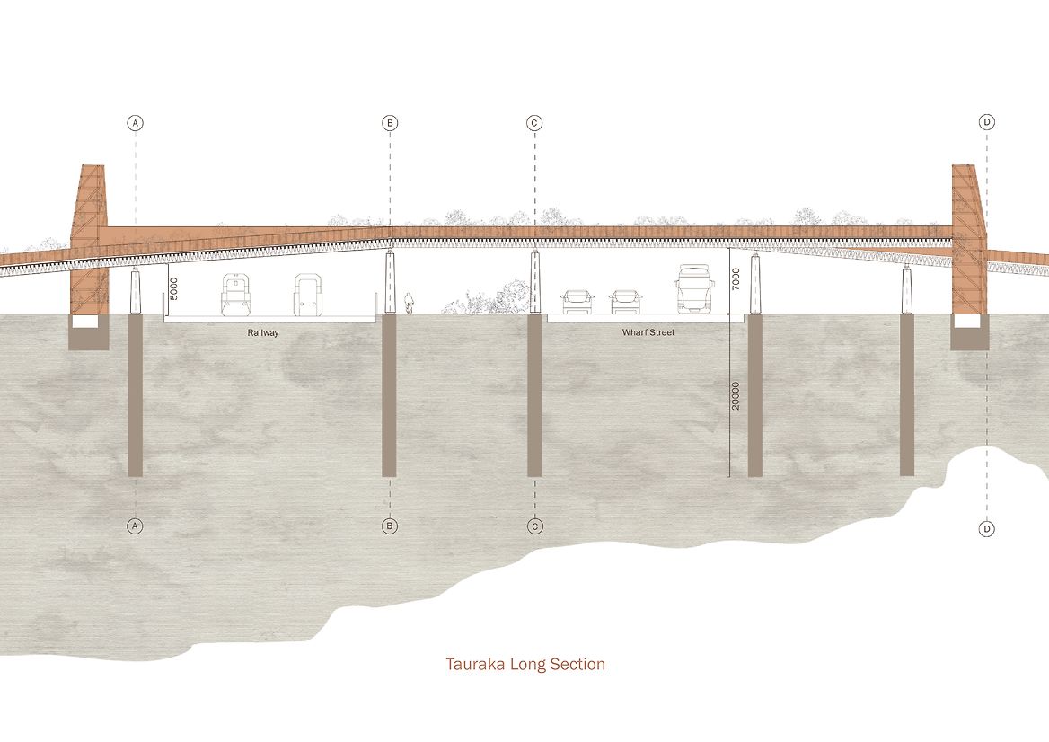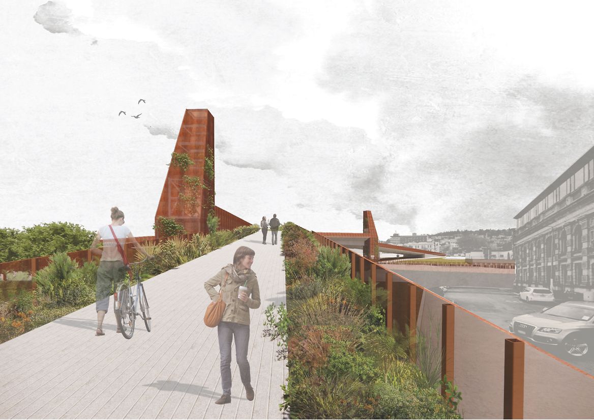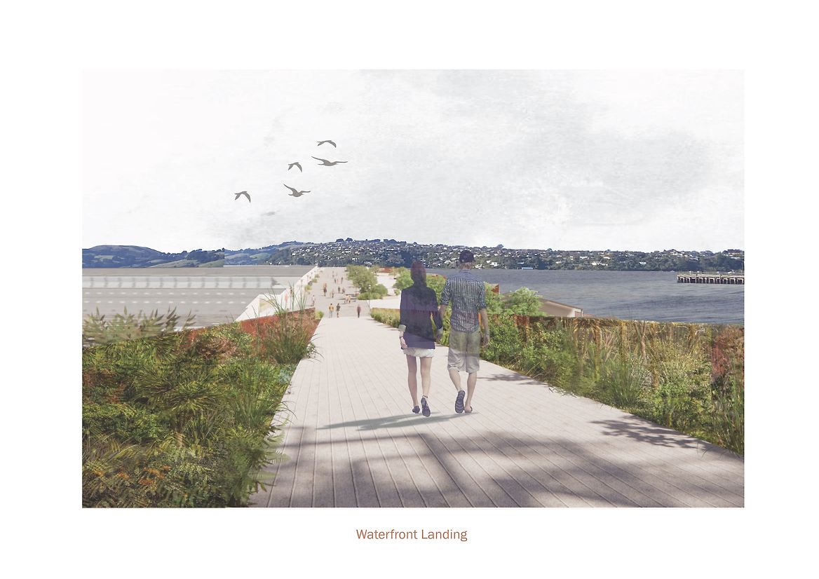 Tauraka, translating to ‘landing place’, contextualises a historic waka journey between water and land through a pedestrian green bridge. Highlighting the site's cultural significance as Toitū tauraka waka, a Kāti Māmoe-Kāi Tahu landing place along the Otago Harbour, the green bridge offers a place for people to reconnect with the native landscape lost to land reclamation.