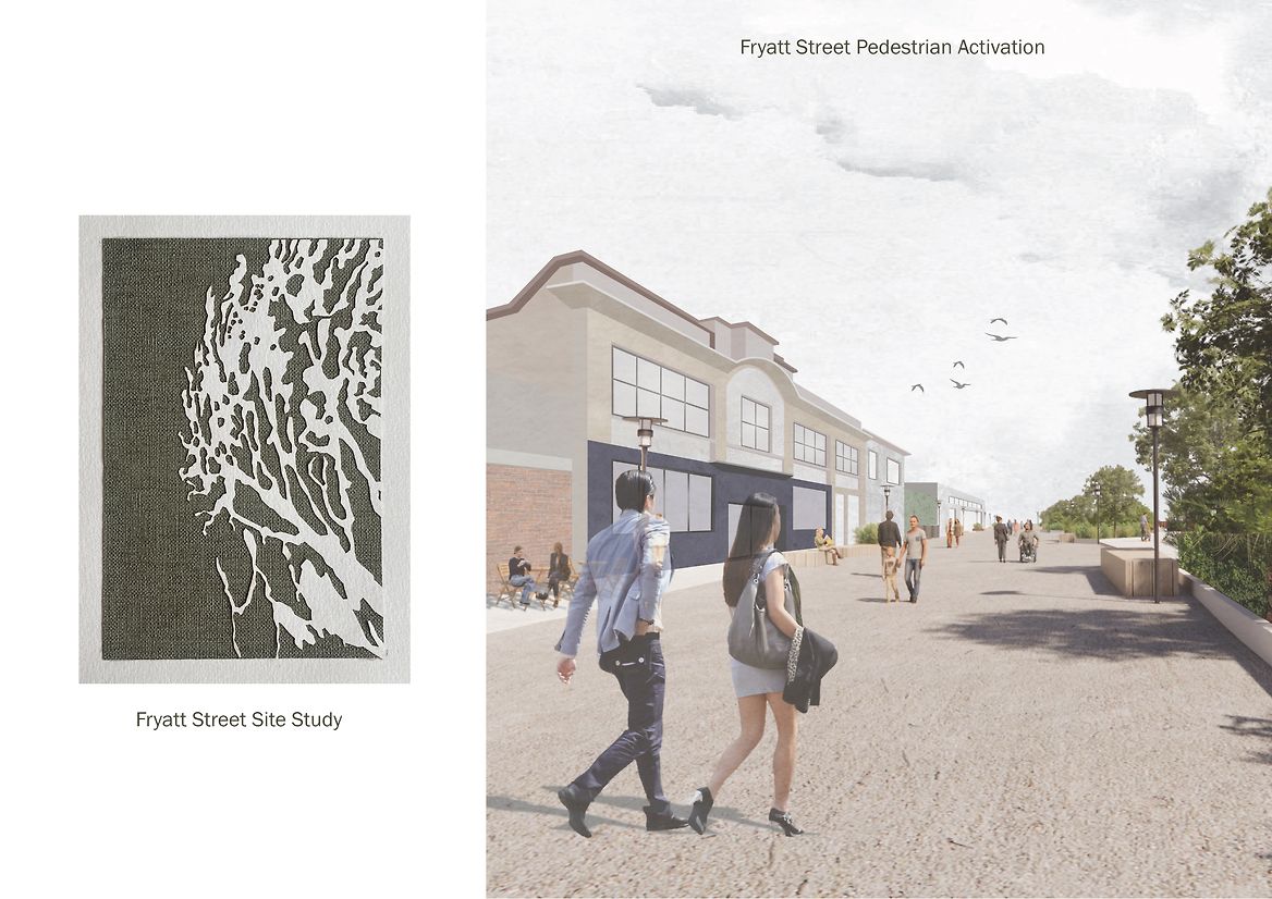 At the point Tauraka meets the waterfront edge, Fryatt Street transforms into an avenue for pedestrian activation. Through targeted interventions: lighting, seating, boardwalks, and planting, the bridge extends beyond its endpoint. On a street where buildings are currently up for lease or in various states of disrepair, increasing its community value presents economic opportunities for local businesses.