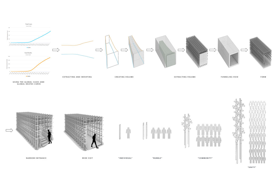 The ongoing crisis has caused a major catastrophe across the world. The fragility of life strikes people as they fall short of hope and lose faith in this state of chaos. This has become the most devastating and heated subject in human history and have tremendously impacted lives. Encapsulating this theme, the installation takes a new perspective on a global crisis and translates it into an architectural language where world/nationwide data and curves are extracted and intertwined throughout the design as an inimitable symbolic experience, a tribute to mortality.