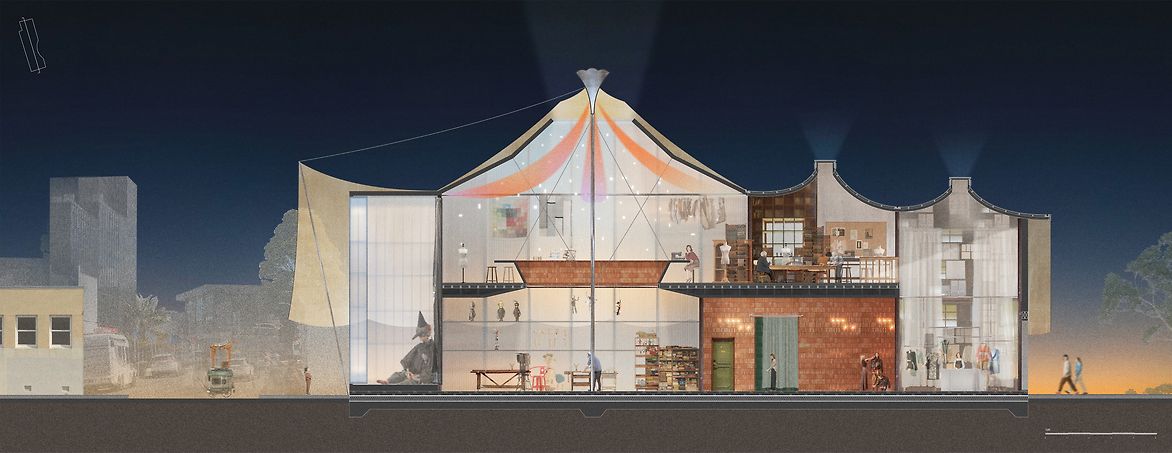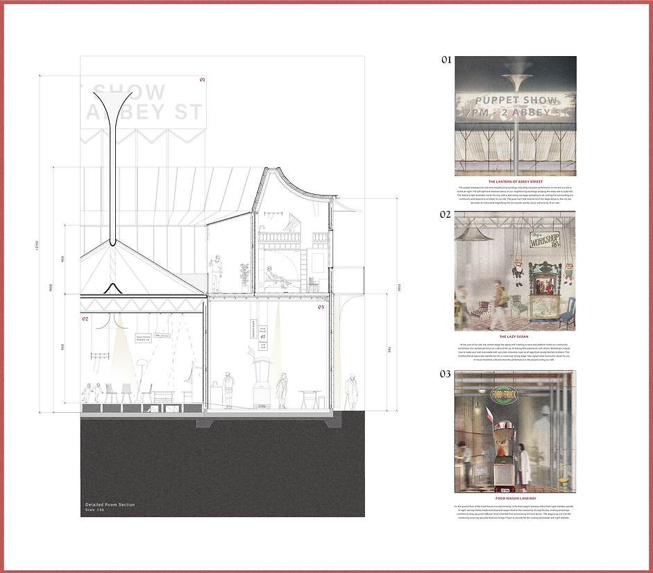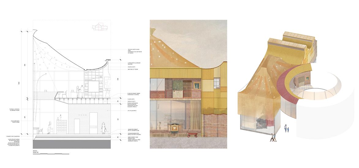 The architecture works on a sustainable and performative level, collecting, recrafting and serving the people in our community through daytime workshop schemes focusing on puppetry, costume making and cooking. At the same time, the site comes to life at night through puppet performances and food night markets, drawing people in and animating the city to live. These puppets, which range in size from small to larger-than-human, serve as instruments of scale, offering new perspectives on the architecture and urban landscape.
