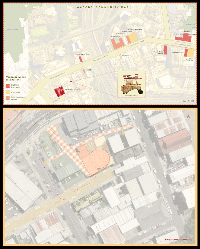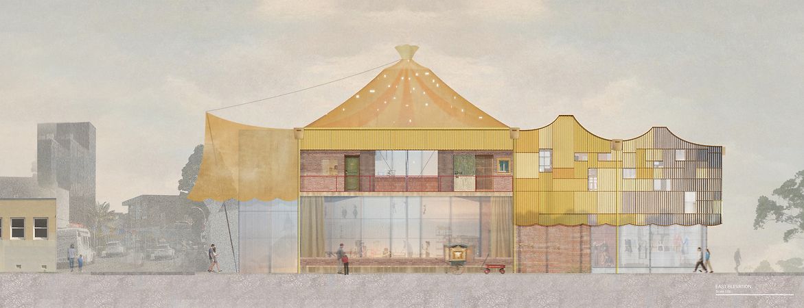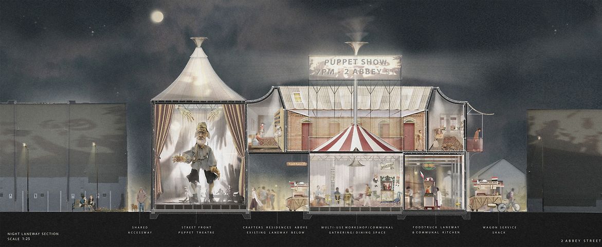 Our project is rich in adaptive possibilities and holds the concept of care at the heart of our design. Our project seeks to reanimate Auckland's urban life through the key ideas of upcycling and craft. Our proposed project on Abbey Street adjacent to Auckland's lively Karangahape road seeks to infuse the urban landscape with vibrant animation, addressing the often-suppressed dimensions of urban life. Upcycled are the existing buildings, a colourful party hire, and a car repair shop; our design actively builds upon the existing characteristics of 'joyful craft' and 'repair.' Our project takes on a sensitive and creative approach to sustainable ways of adaptively reusing old urban buildings, transforming them in a way that continues to care for the stories and narratives they uphold. Our joyful scheme sheds light on the importance of upcycling to renew the purpose of things and bring them a new meaning for objects that are 'left behind', whether it be old clothing, demolished building materials or leftover food from the community.