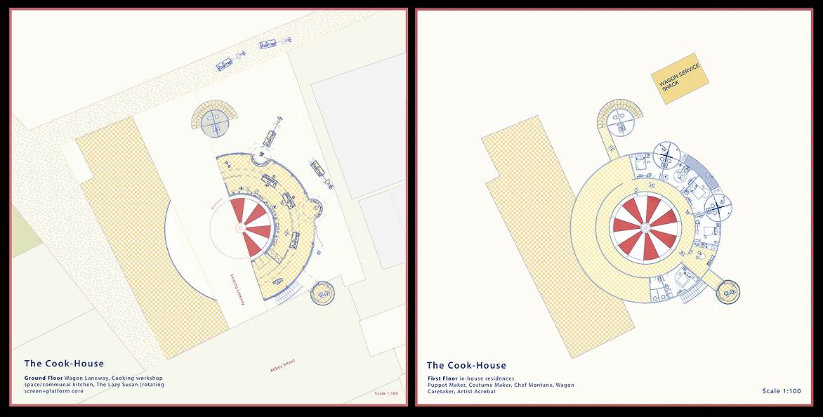 Our in-house performing artists and costume makers reside together on the first floor of the Cook-house, which is designed with radial floor-planning to facilitate communal connection. Our mobile wagons move in and out of the site onto Karangahape Road, collecting food and op shop clothing from the community to be upcycled back on-site in our cooking and costume-making workshops. This mobility and interaction with the urban environment reinforce the building's role in animating the streets and fostering community engagement and sustainability. The food is then redistributed and sold at our night markets, which are located beneath the laneway of the Cookhouse.