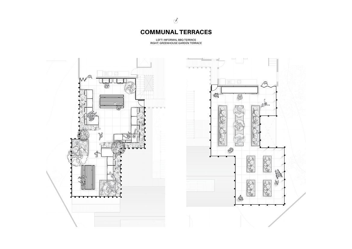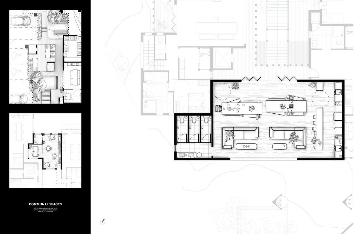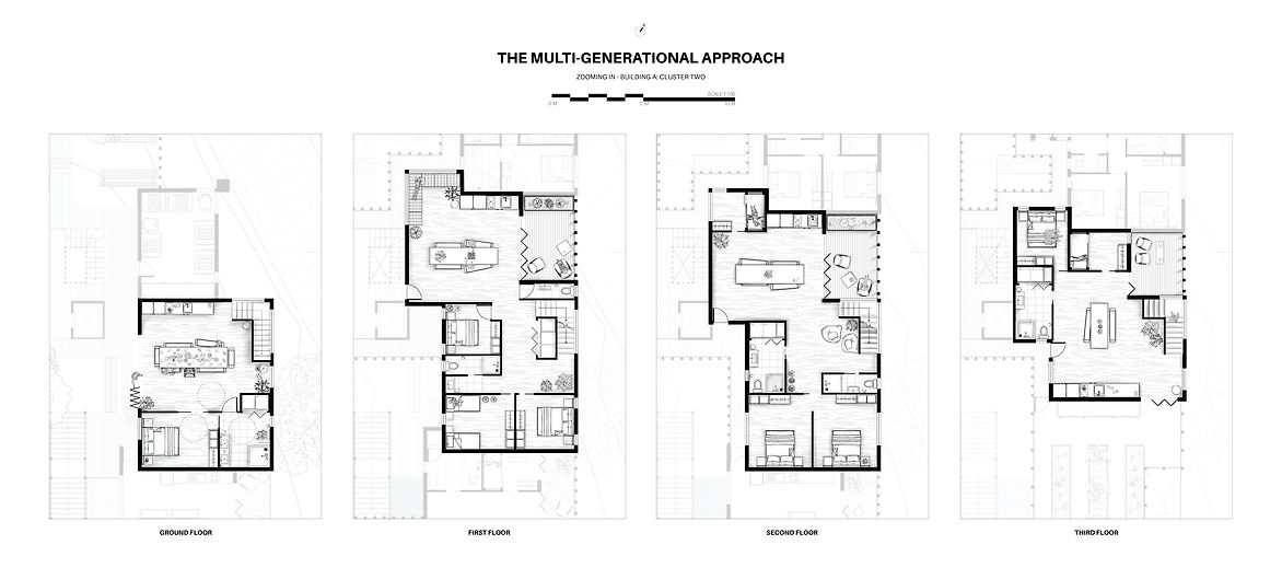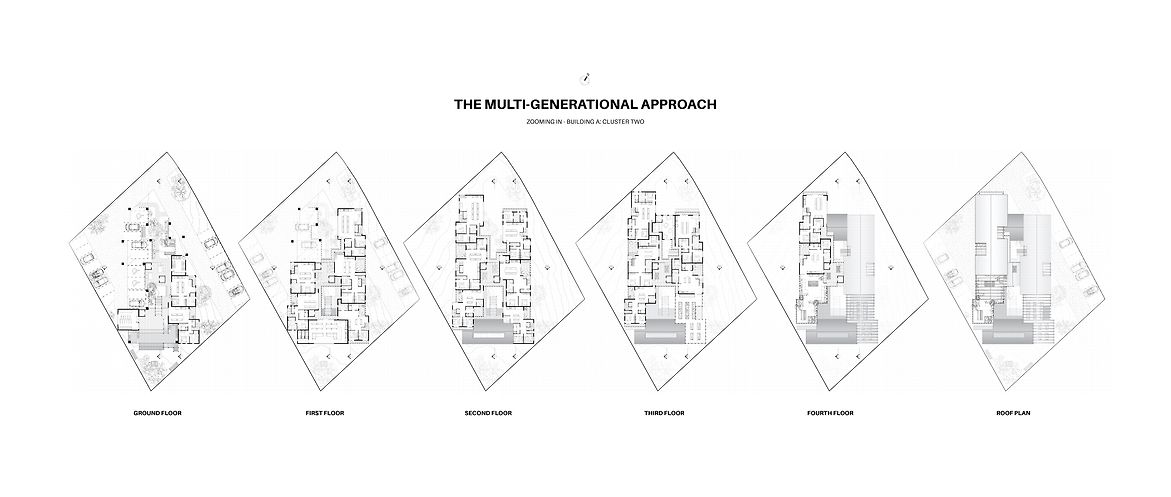 The architectural layout comprises six vertical clusters, each accommodating 16-18 extended family members in self-contained units connected by vertical circulation, thereby encouraging social interaction and cohesion. This collective ownership model facilitates flexibility in response to potential relocations, thereby sustaining community resilience.