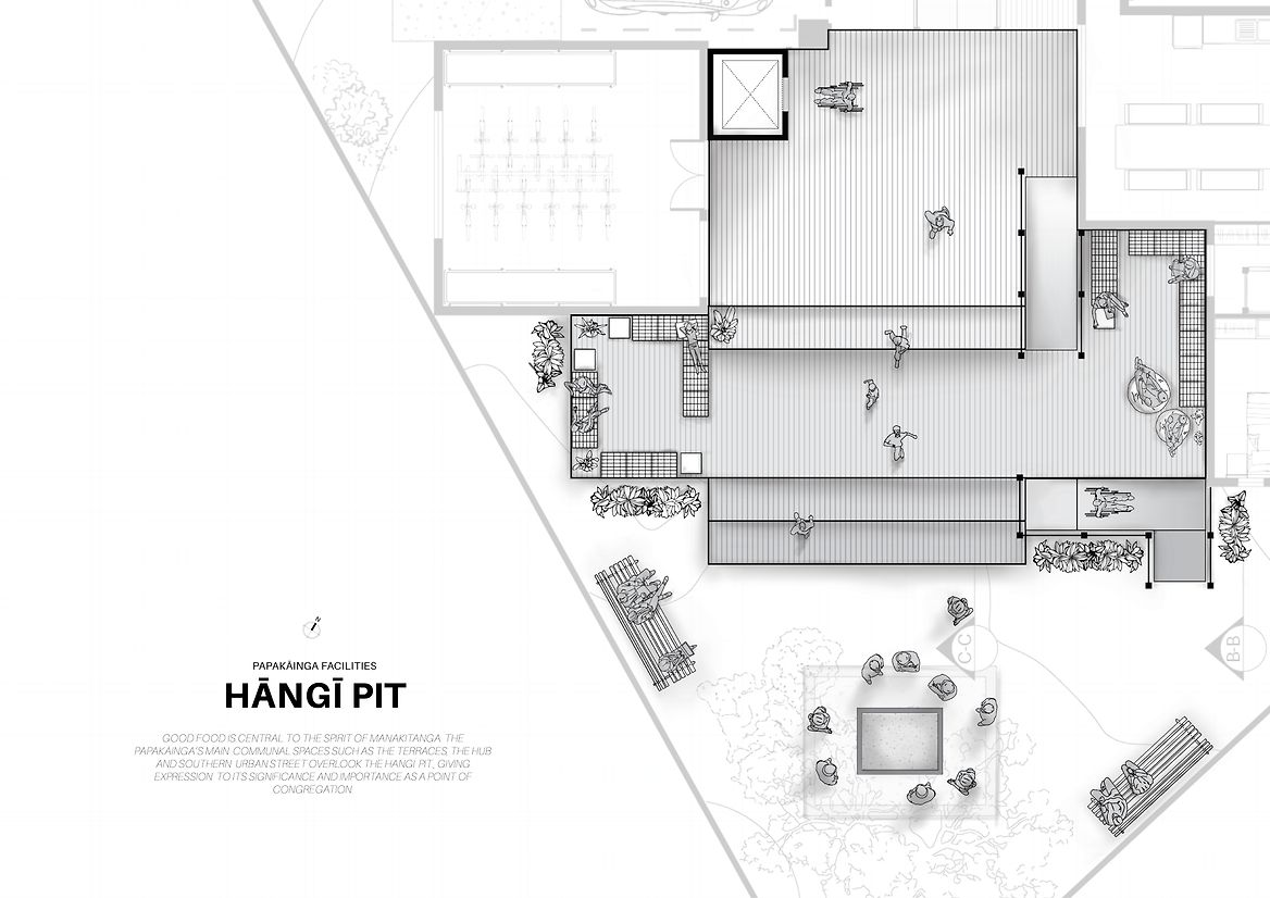 Whanaungatanga is fostered through expansive, adaptable communal spaces such as the central hub overlooking the Hāngī pit and rooftop terraces offering panoramic views towards Mt Wellington and Panmure Basin, thereby enhancing a sense of place. Manaakitanga is evident in the comprehensive accessibility features and delineation between public and private spaces. Natural elements are seamlessly integrated into the design through passive ventilation systems and rooftop gardens, promoting sustainability through agricultural cultivation.
