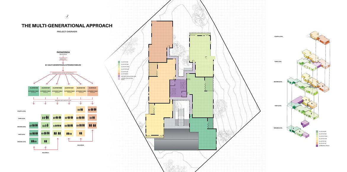 The primary aim of this project was to establish an urban Papakāinga for Te Rūnanga o Ngāti Awa, emphasising a profound connection to the whenua and promoting intergenerational living. Designed to accommodate 100 residents, the project sought to fortify cultural and spiritual identity, specifically focusing on compact design, collective ownership, and communal living tailored to the community's unique requirements.