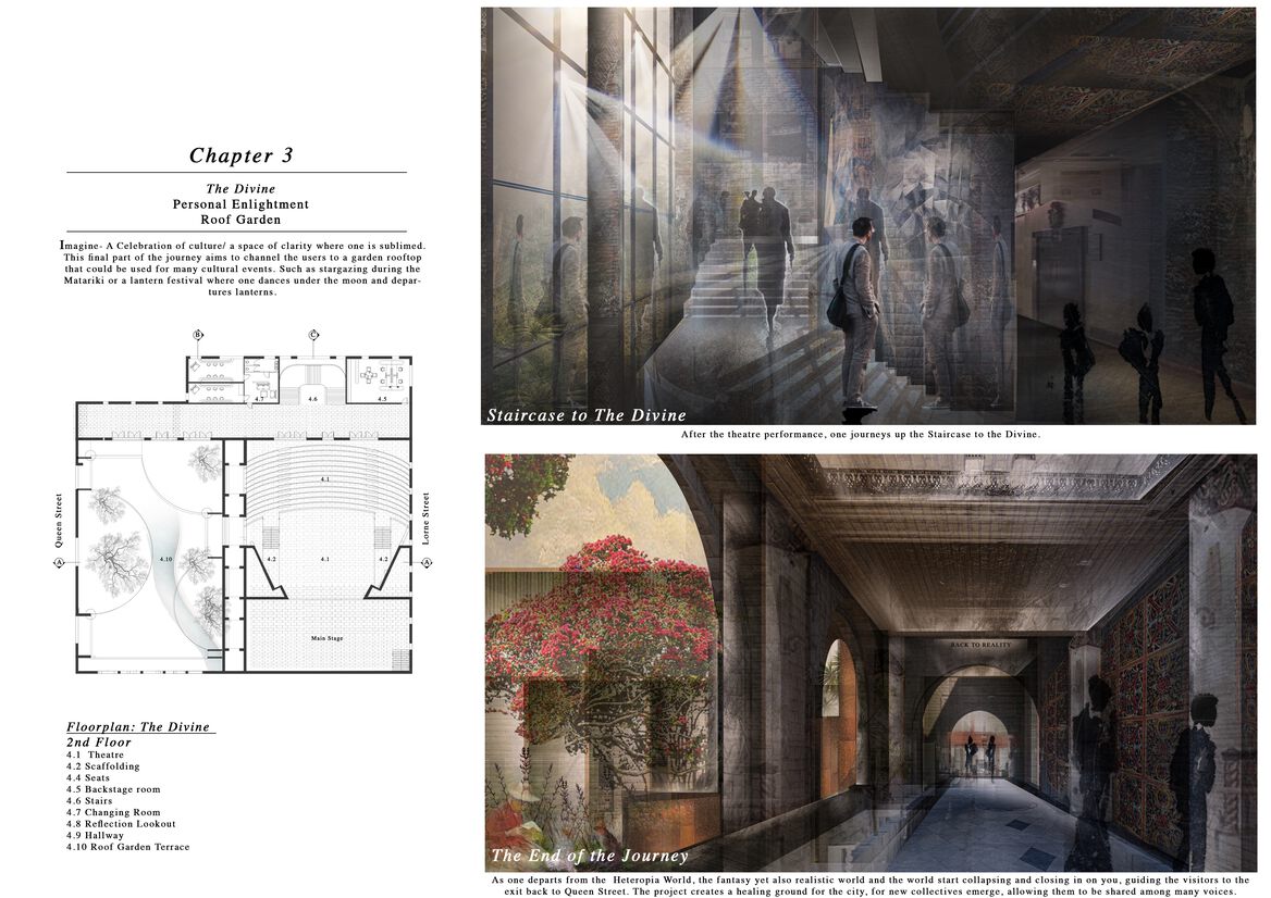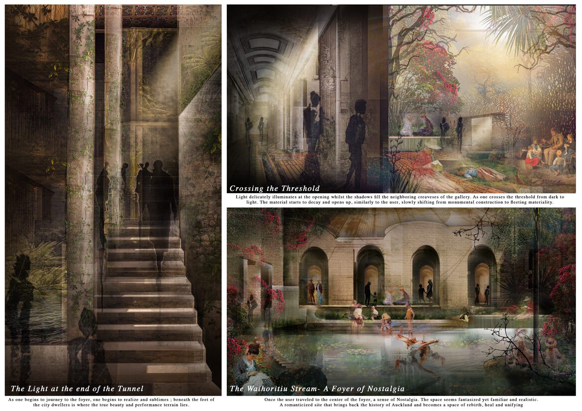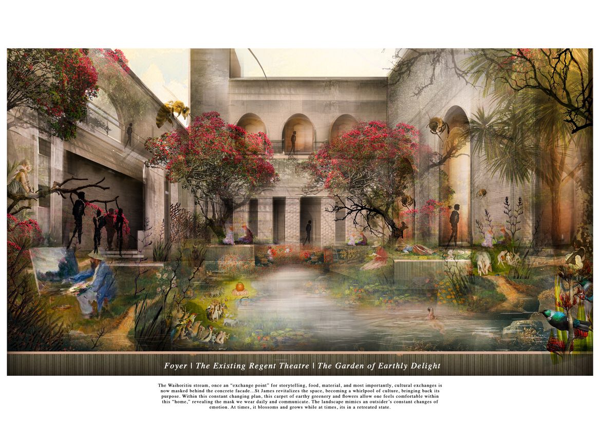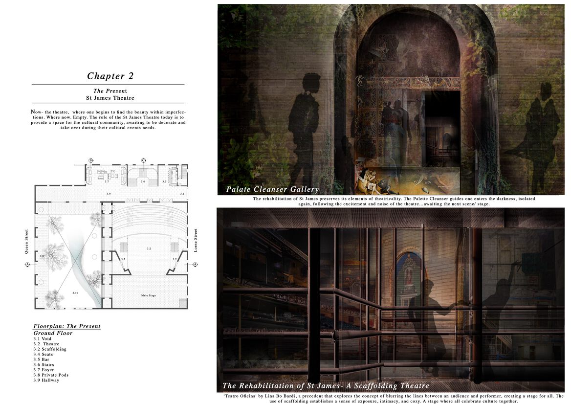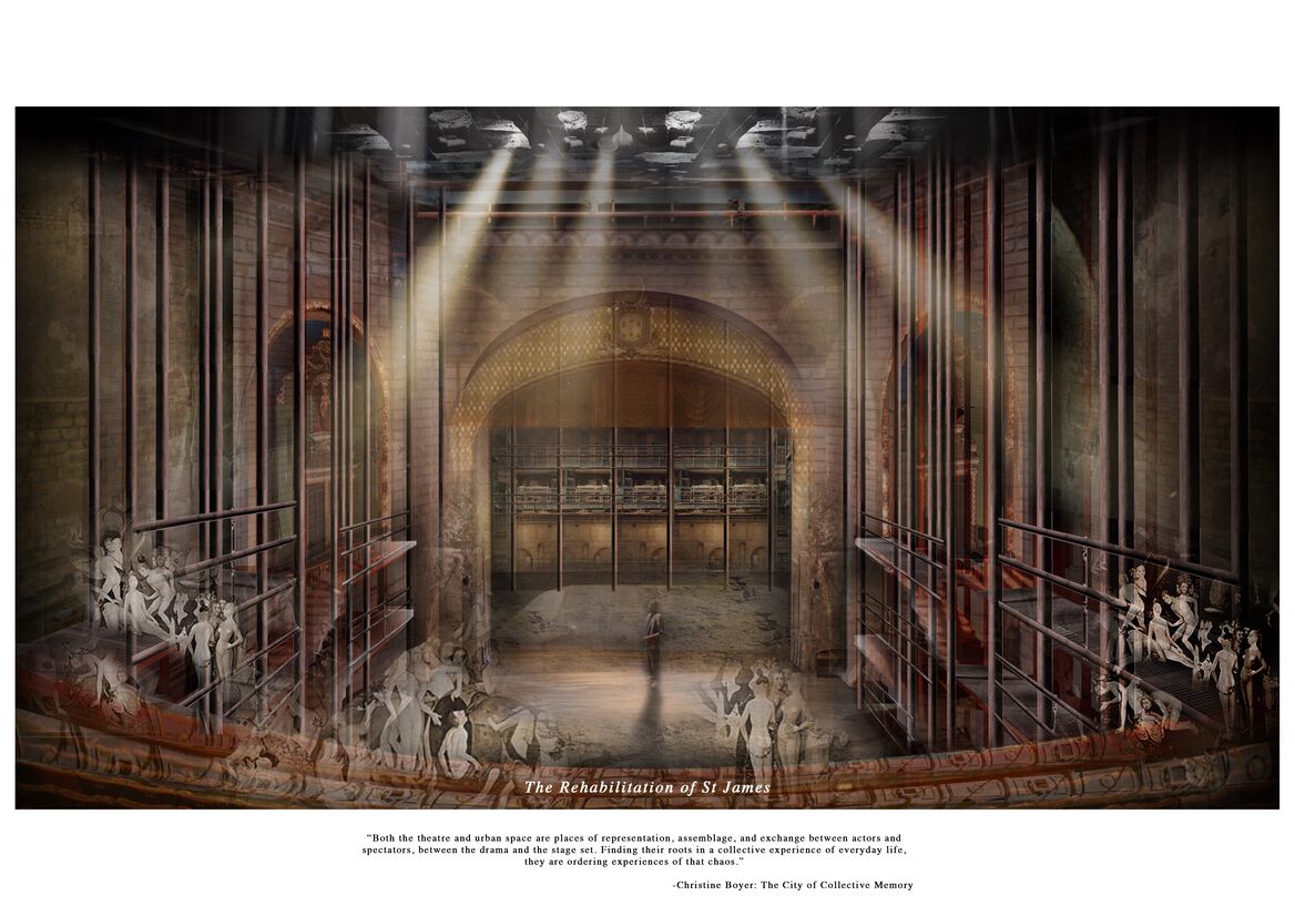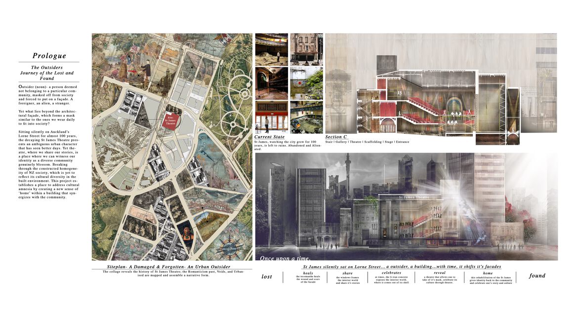 Sitting silently on Auckland's Lorne Street for almost 100 years, the decaying St James Theatre presents an ambiguous urban character that has seen better days. Yet theatre, where we share our stories, is a place where we can witness our identity as a diverse community genuinely blossom. Breaking through the constructed homogeneity of NZ society, which is yet to reflect its cultural diversity in the built environment. This project establishes a place to address cultural amnesia by creating a new sense of 'home' within a building that synergizes with the community.
