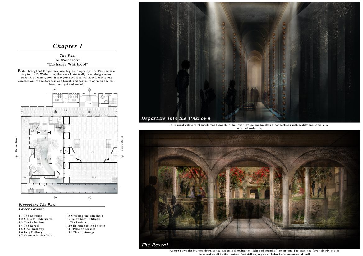 Chapter 1-"Past"- The Lower Ground consists of the Foyer, a return to Romanticism, and the Te Waihorotiu stream that runs beneath Queens street and St James. The Foyer acts as a cultural "exchange whirlpool" and a sense of rebirth.