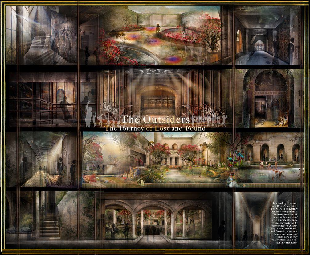 "The Outsiders: The Journey of Lost and Found" intervenes within the St James Theatre and its neighboring site (once a movie Regent Theatre), both a forgotten void on Lorne Street and intends to establish a fluctuating collective memory for diverse communities. Created through an experiential sequence of spaces and emotions representing the ups and downs of outsiders who experience being lost and found as they cross-vertical and horizontal thresholds. This is achieved by combining existing and new structures with sensations created by light, materiality, textures, patterns, and a play on indoor and outdoor thresholds. Inspired by Tim Ingold's 'The Temporality of Landscape,' engages with the concept of the past, present, and future. Users are guided on a journey across time zones: achieved through a tripartite structure. The narrative film functions like chapters in a book, the journey of one walking through 3 chapters, performing a script of the site's history:
