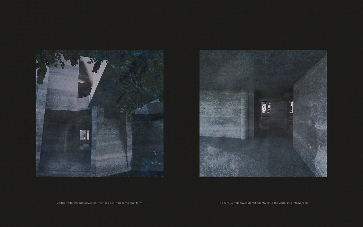 To achieve this comfort, they must feel safe in the space, shielded from judgemental gazes. The space must also gently empathise with the inner darkness they feel, being cool, quiet, and increasingly sensually deprived as they wander deeper and deeper inwards, becoming one with the darkness that envelopes them, as they are submerged into the dark, compressed space of Te Po - the unstimulating, imperceivable world of Darkness.