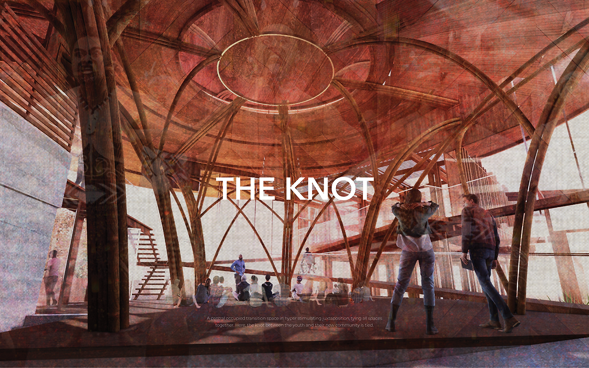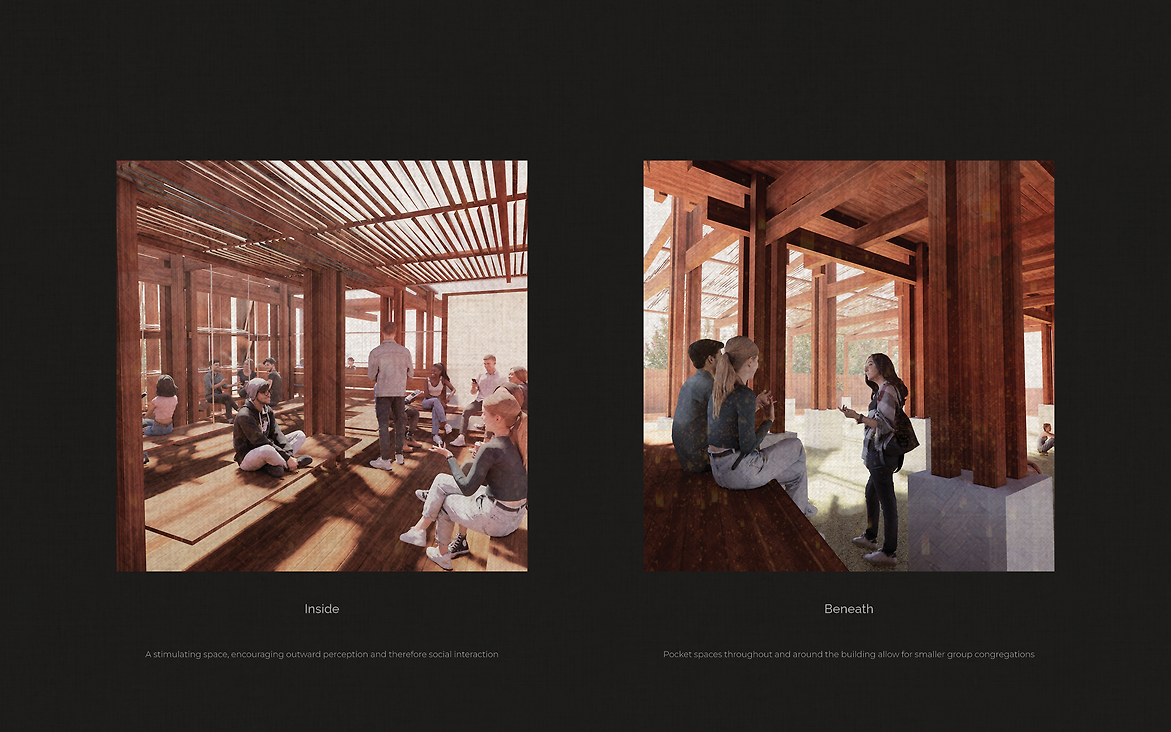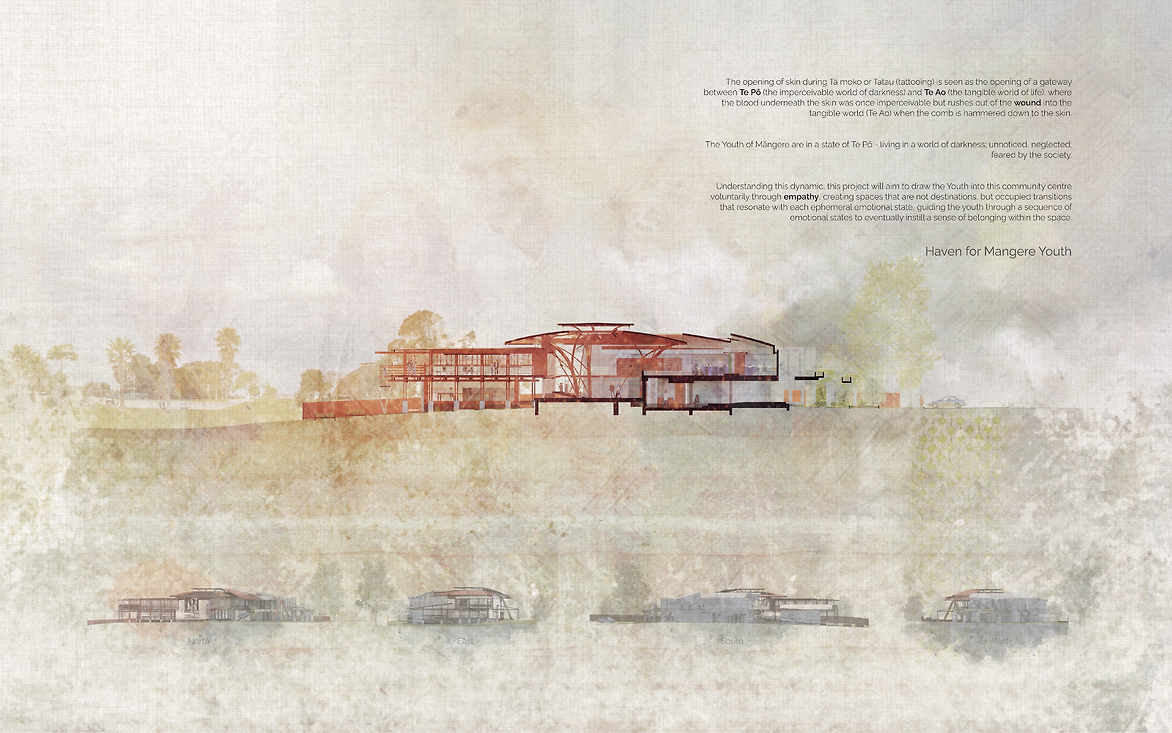 Standing across the street, onlookers would be surprised to be told that this project is a youth centre. Presented with a conceptual brief to design a centre for Mangere youth - a demographic whose conditions have continued to worsen, feeling increasingly disconnected from society, and turning to delinquency. This unconventional project seeks to understand the needs of the youth, aiming to re-invent the typology of the youth centre with the end goal of instilling a sense of community amongst the youth, and gradually reintegrating them with the greater society.