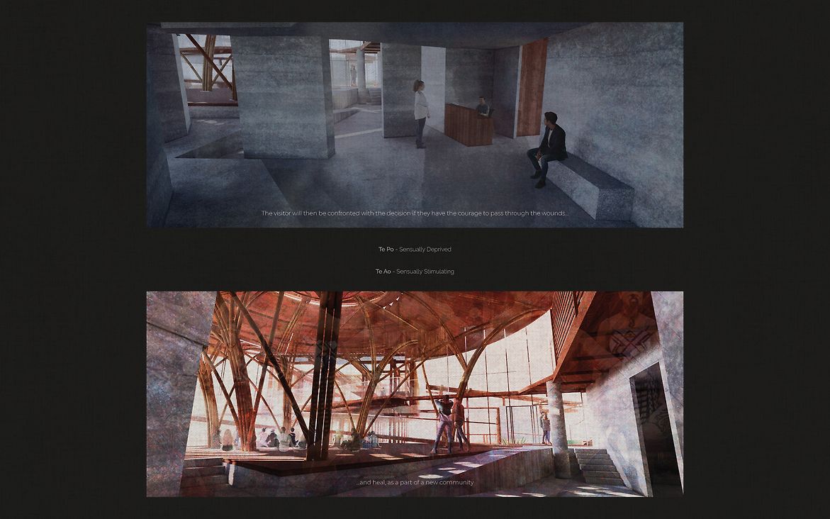 The Polynesian concept of Te Po and Te Ao - The stimulating, tangible word of Light - is expressed in this project with architectural devices of stimulation such as rhythm, light, and compression - the nuanced control of which creates unique characteristics of each space, determining its resonance to people of different current emotional states, and the resulting sensations its inhabitants experience.