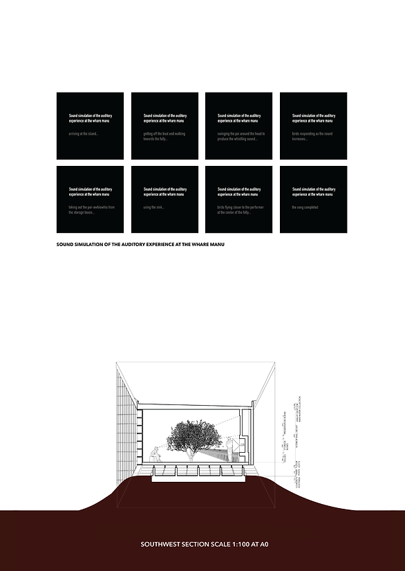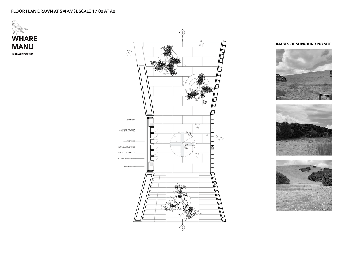 The pavilion mimics the form of a speaker that can be entered by both ends by stairs or a ramp, while also allowing birds to freely enter. The center of the pavilion acts as an interactive performance space and education space, where the poi awhiowhio is stored and played by the visitors, attracting birds that are nesting in nearby trees and along the side walls to fly through the chamber, thereby completing the greeting process. The two existing Manukau trees on the ends in addition to the grid walls on the sides provide nesting spaces for birds, while at the same time blinding the vision of the visitors standing in the center, to emphasize the sensory experience of hearing the bird's songs gradually approaching the central stage. To fulfill teaching facilities, stools can be pulled out in combination with a display board to transform the space into a teaching space for school visits.