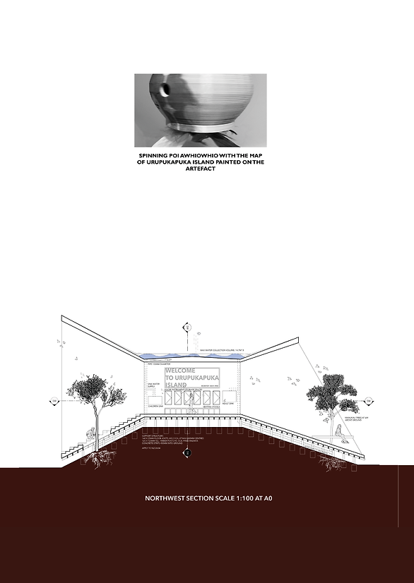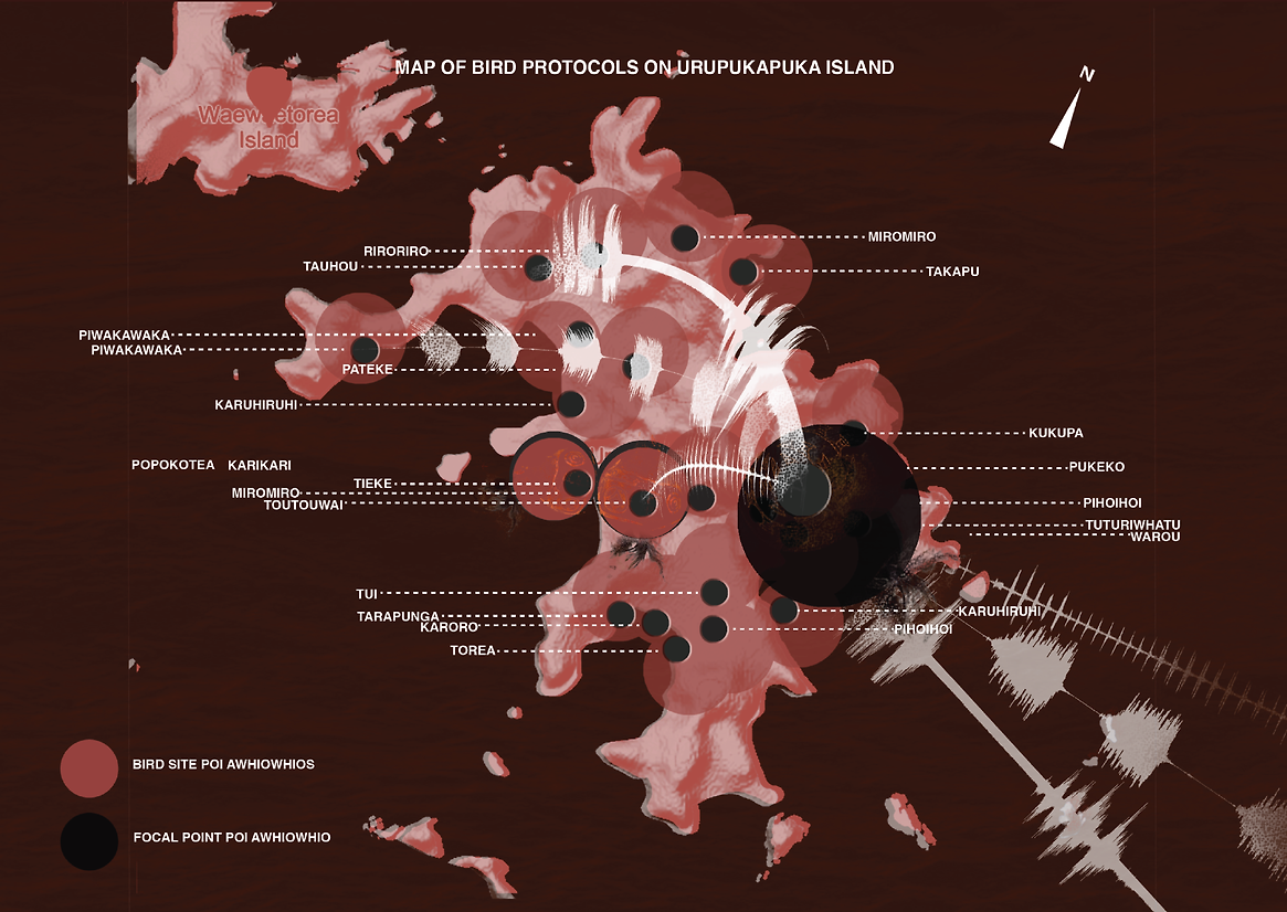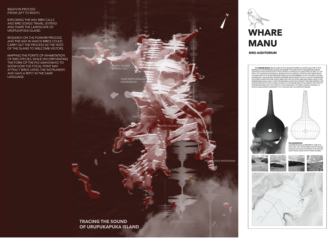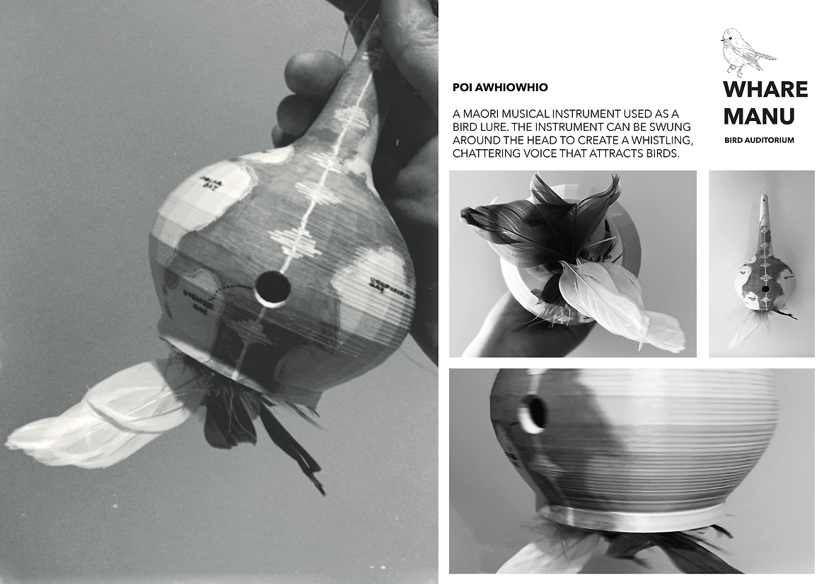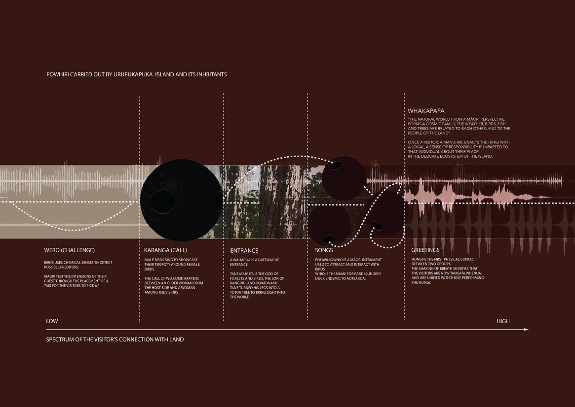 Powhiri is known as a Maori tradition of welcoming visitors onto the marae. The process consists of an exchange of songs and greetings between the host and the guests as a formal welcome procedure. The design is inspired by the protocol of this traditional Maori process. By imagining birds as the host of the island, the visitors are invited to utilise the Maori instrument poi awhiowhio-traditionally used as a bird lure-to frame a self-introduction as they enter the land.