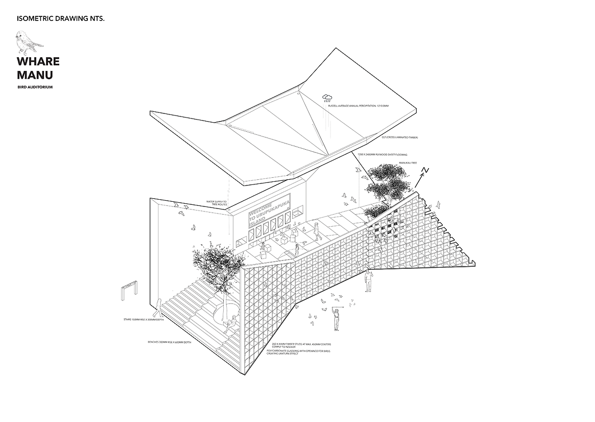 Hence, in partnership with Project Island Bird Song, the Whare Manu Bird Auditorium is introduced as a focal point and interactive educational space at the entrance of Urupukapuka Island. Its purpose is to engage visitors in a dialogue with the island's hosts- avian inhabitants, bringing their songs to life.