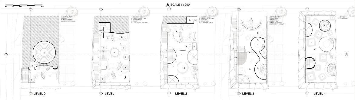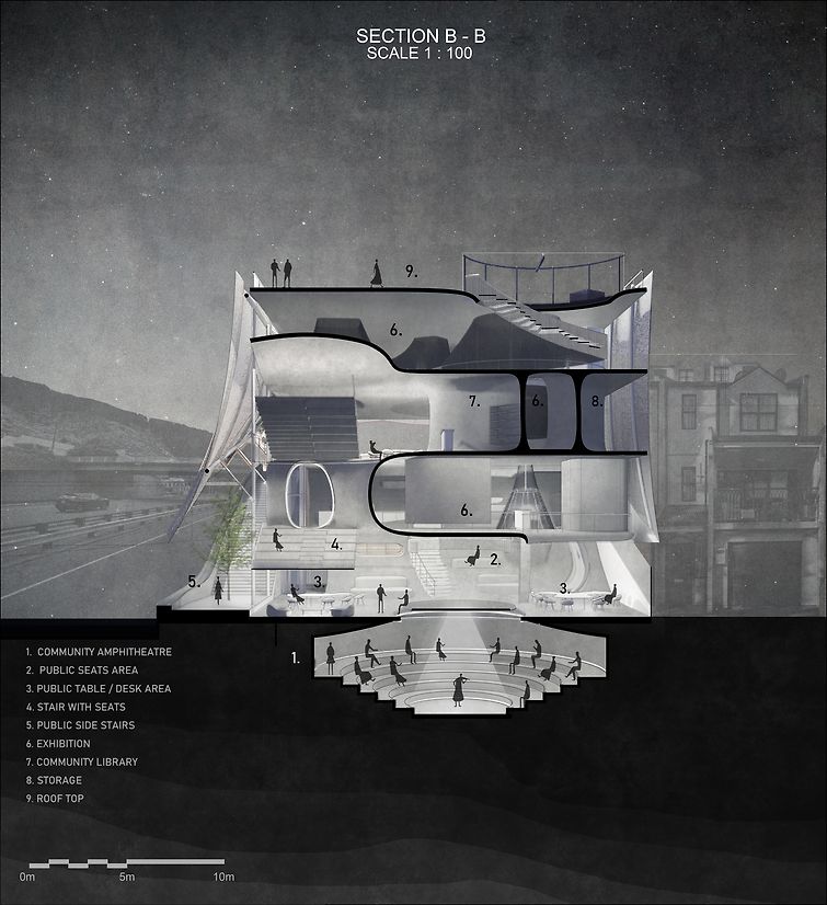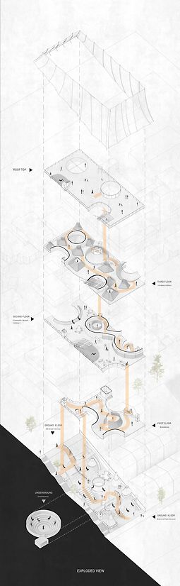 The spatial relationship in traditional urban architecture is progressive, transitioning from public to semi-public, to semi-private, and finally to private. By breaking this progressive relationship, the fuzzy space between public and private is scattered throughout the building, increasing its interest and the possibility of community gatherings.