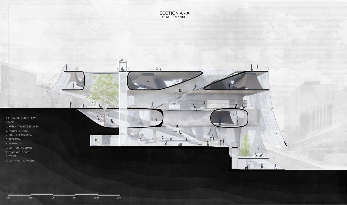 This museum project, situated at the intersection of Wellington's commercial/government and residential districts, serves as the city's threshold. By considering the quality of an attractive public space under the concept of "spatial justice", the museum blends spaces of diverse attributes to create undefined areas for increased possibilities of use. Through a blurred, boundless spatial experience, it aims to provide an inclusive public platform for socializing and gathering for the local community, advocating for more public space within limited land resources.