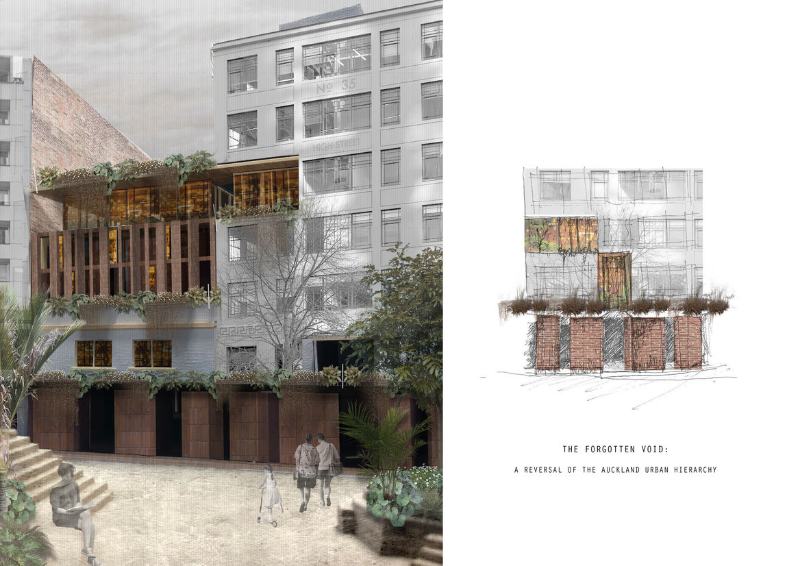 This project is urban infill architecture between two large existing buildings in High Street, Auckland. It looks to reverse the current urban hierarchy of the existing High Street. One of forgotten textures, spaces, abstracted light and intrigue. The idea of ‘doorless’ intersecting spaces allows for a journey within the building, without the blocking off of what can be considered the most beautiful part of the existing buildings, the forgotten. Initially the project filled a void between two buildings but have since begun to infiltrate the surrounding buildings increasing the volume of the spaces but also removing that existing formal planning within Auckland. Ultimately this project is a critique of urban hierarchy. This building brings textual forgotten space to the street front contrasting that of glass facades .